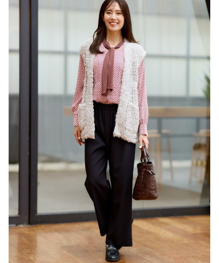 身頃はプリント柄、衿は無地生地を使用したボータイブラウス。