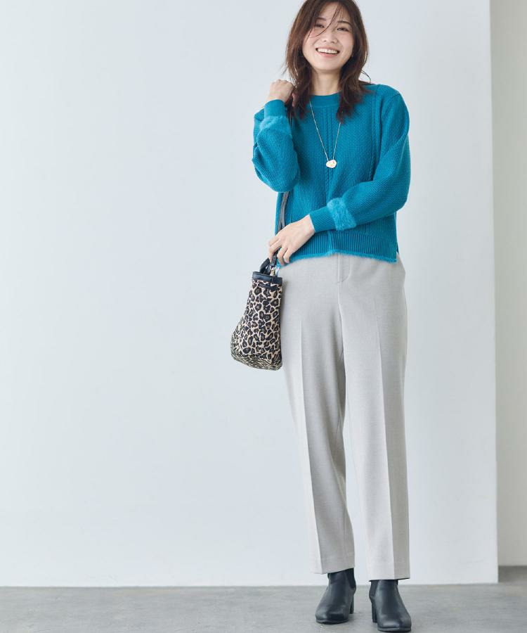 衿リブは12Gですっきりとキレイめのハイネックにし、コートインやジャケットインでも着回しやすいニットになっています。