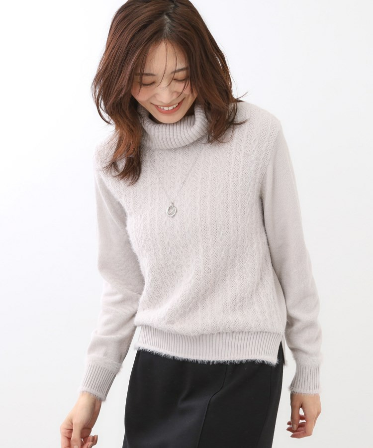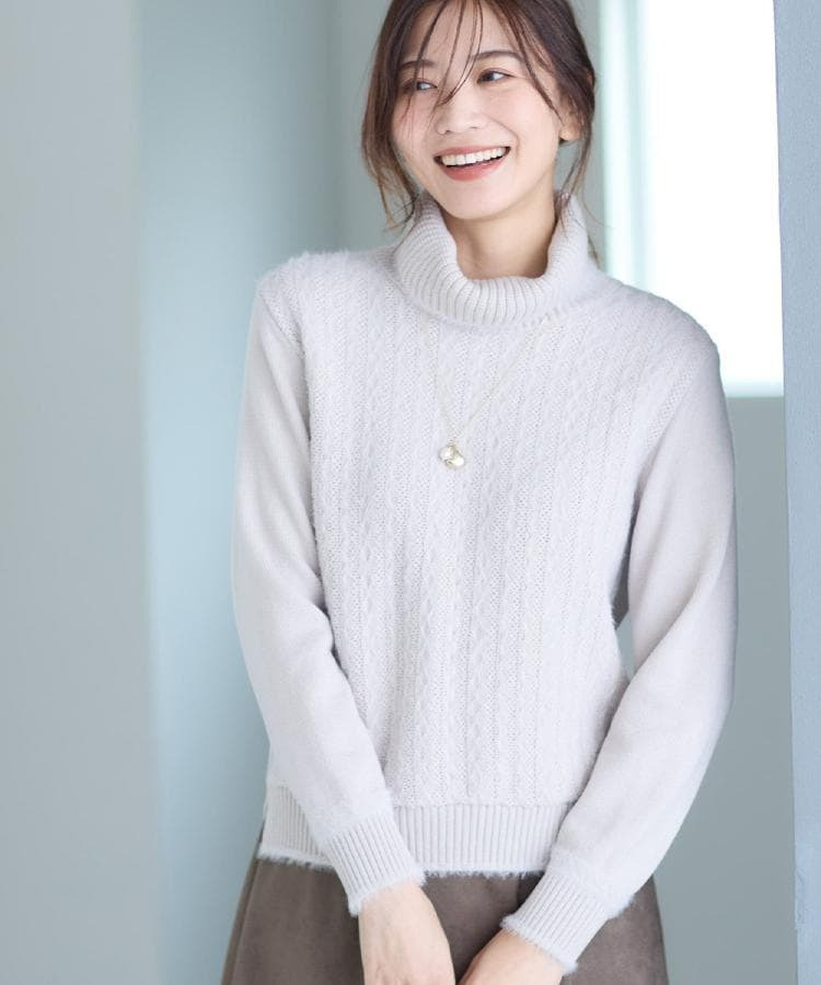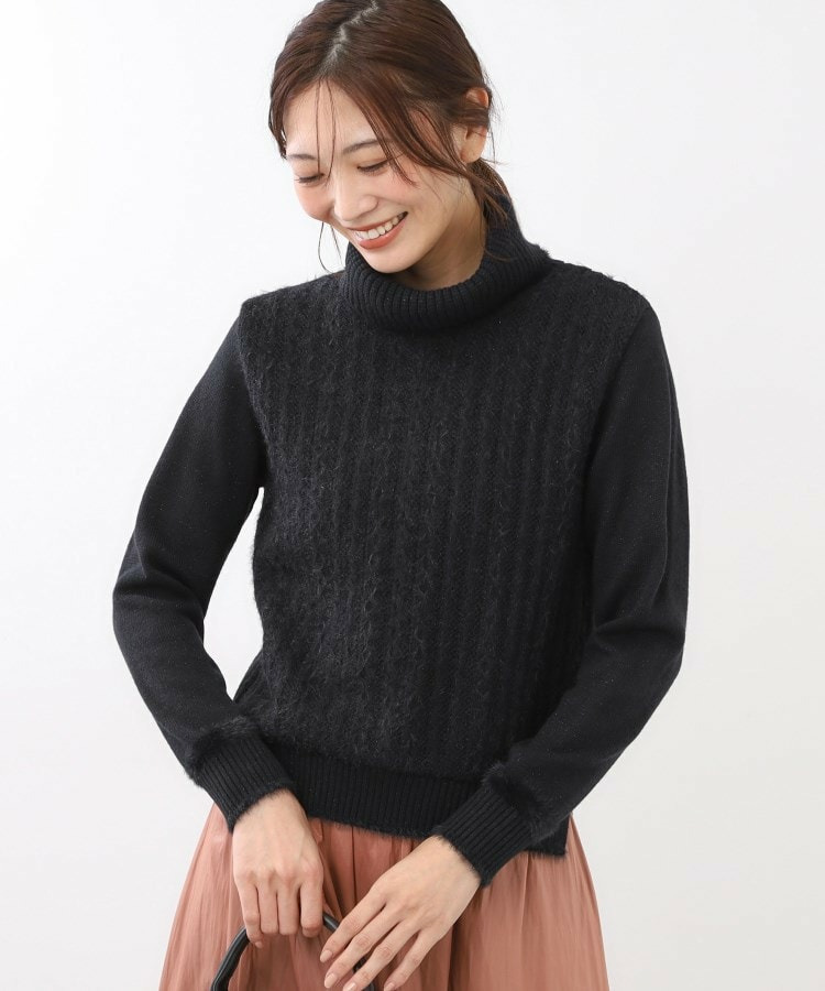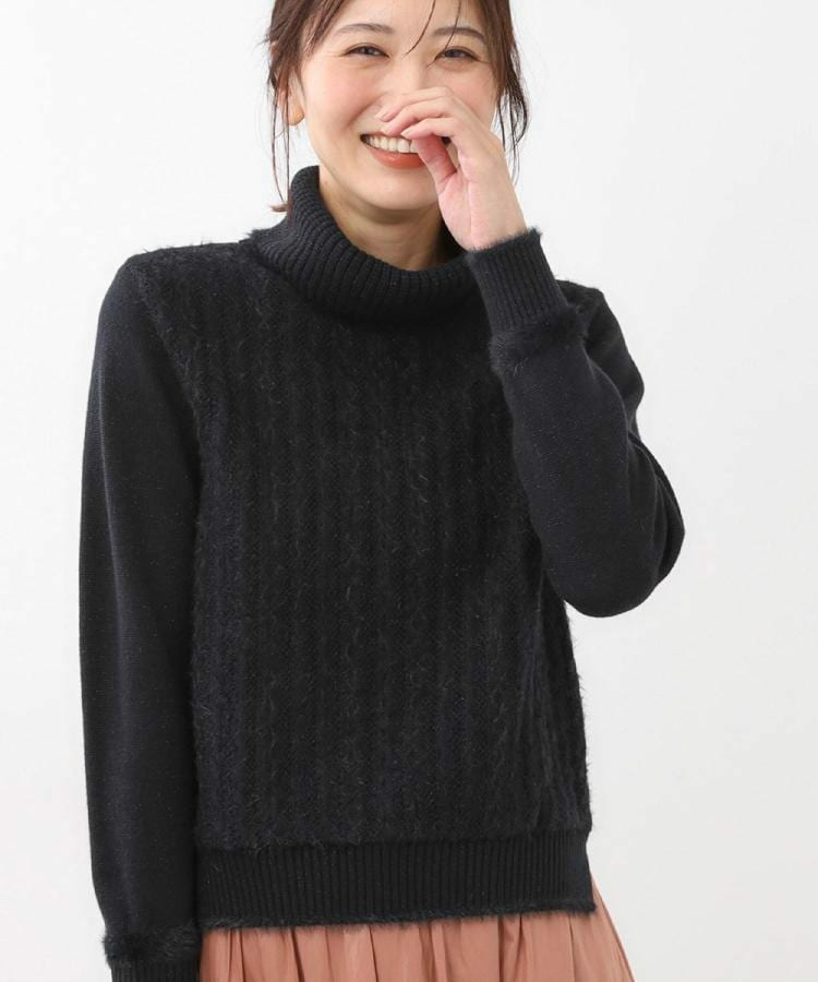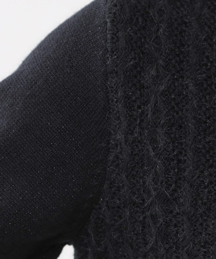 冬に触りたくなるようなふわふわした素材感で、袖と後ろ身頃はすっきりとした天竺に程よくラメが効いたニットになっています。