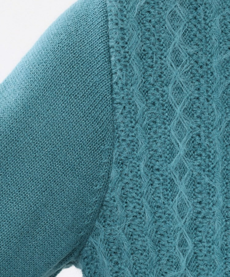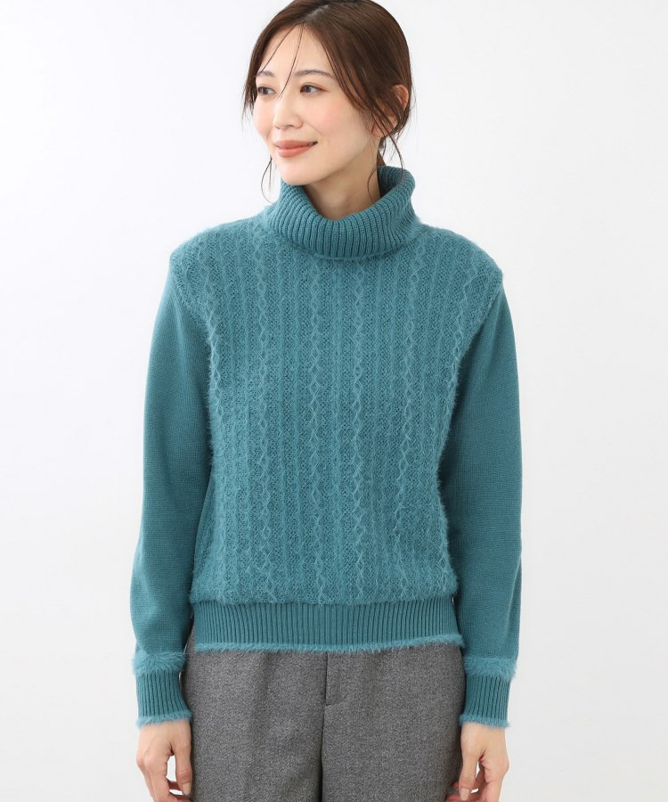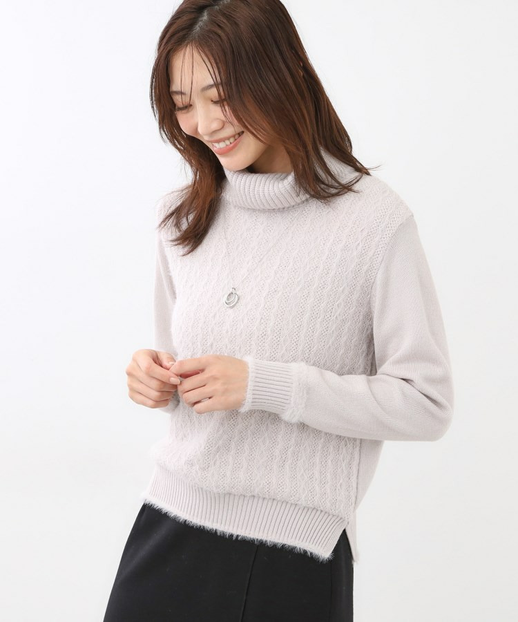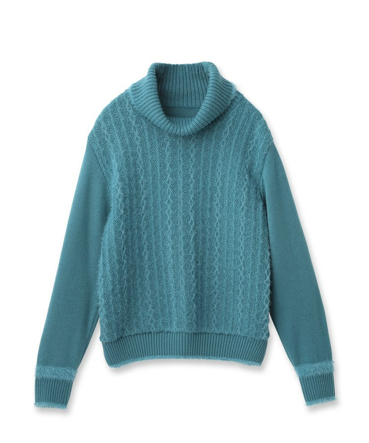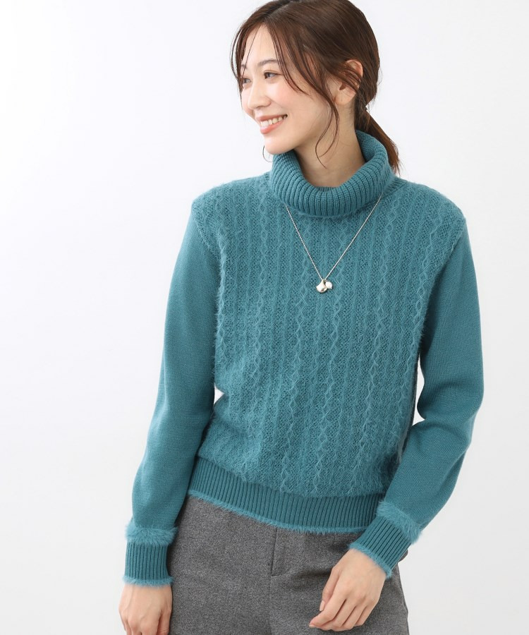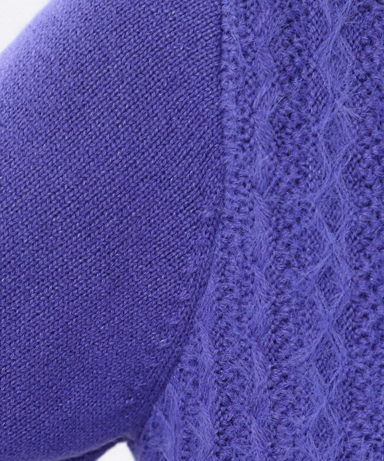 冬に触りたくなるようなふわふわした素材感で、袖と後ろ身頃はすっきりとした天竺に程よくラメが効いたニットになっています。