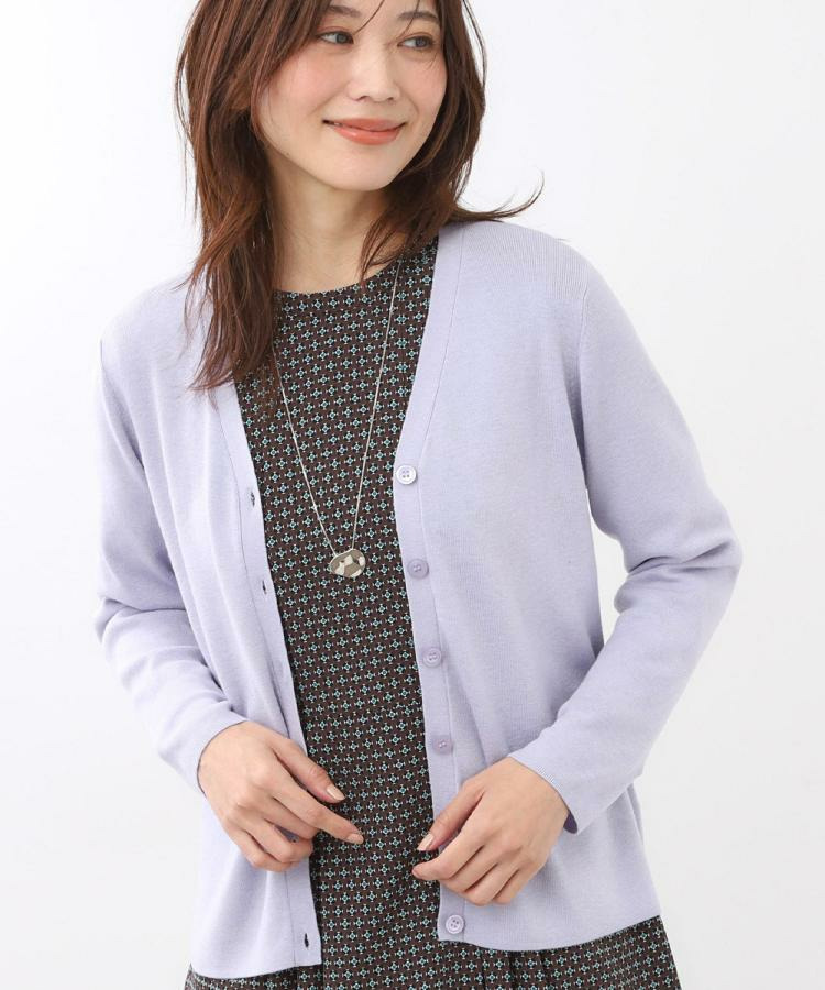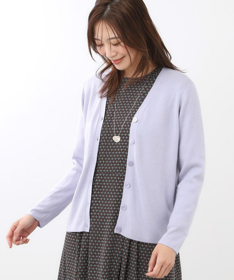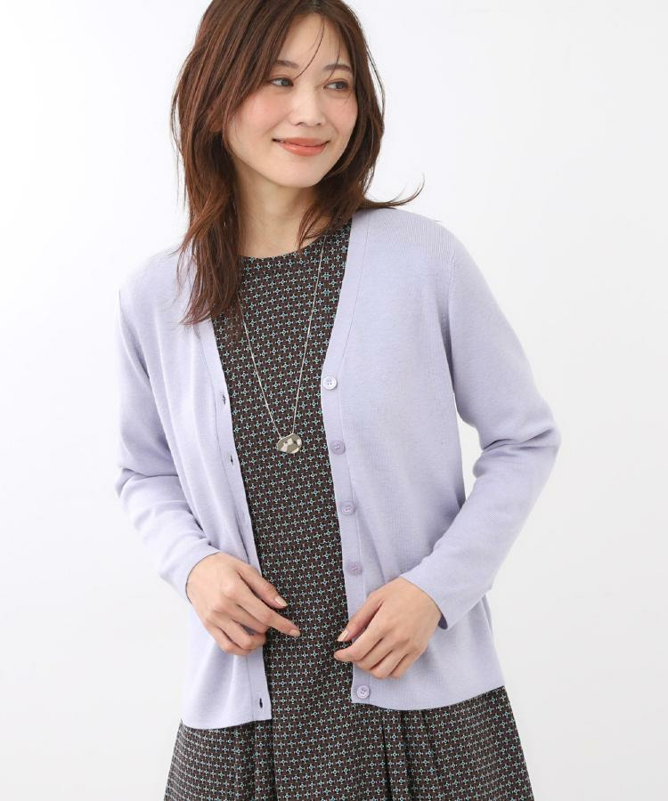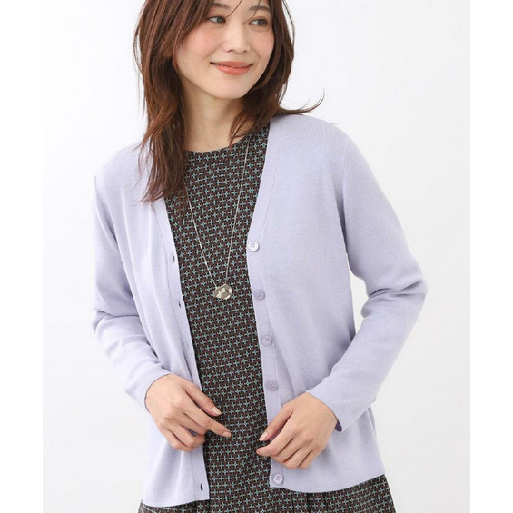 気負わずに羽織れる軽やかさがあり、総針編みのきちんとした表情が魅力の着回しやすいVネックカーディガン。