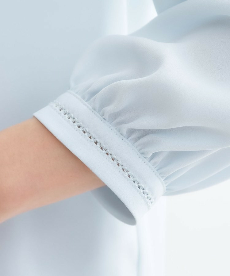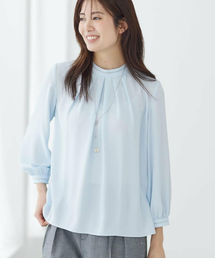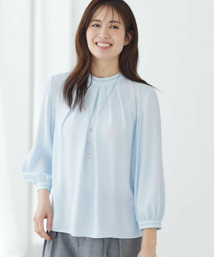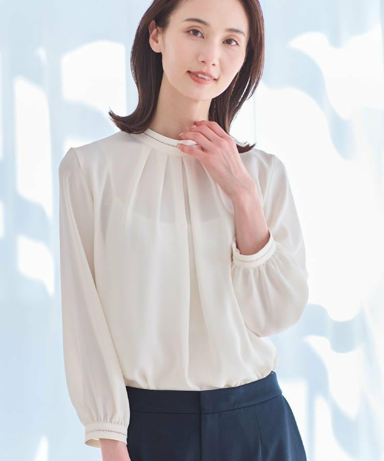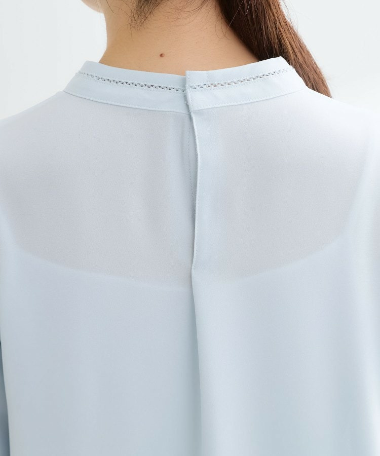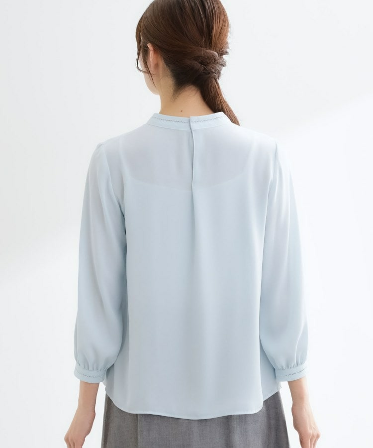 後ろはスナップ開きで着脱もしやすい設計にし、シンプルな中にもアクセントが効いた上品で洗練されたブラウスになっています。