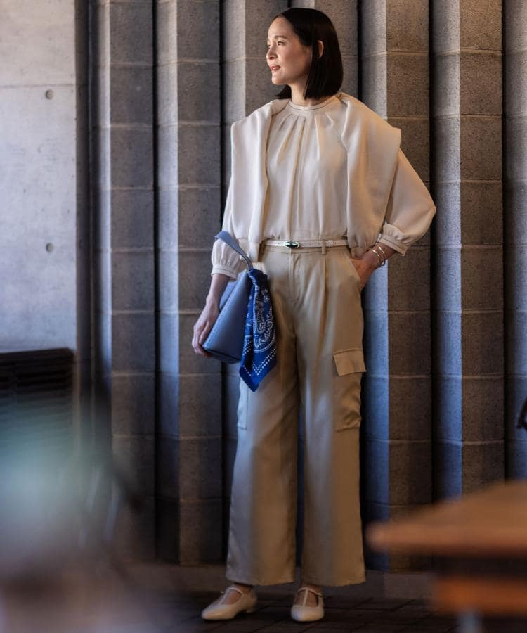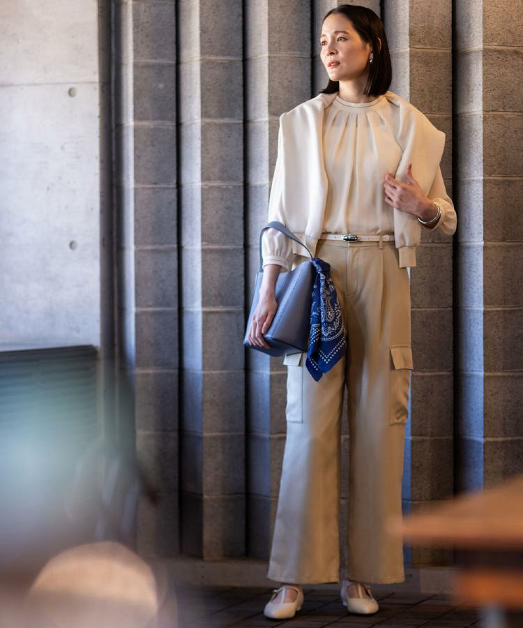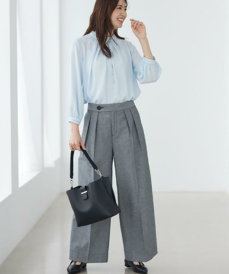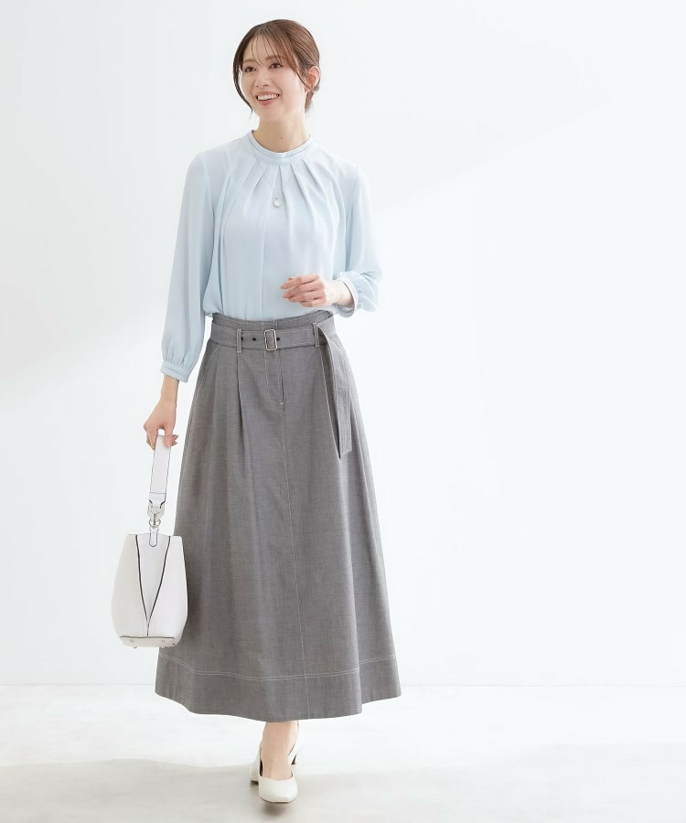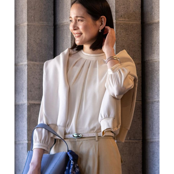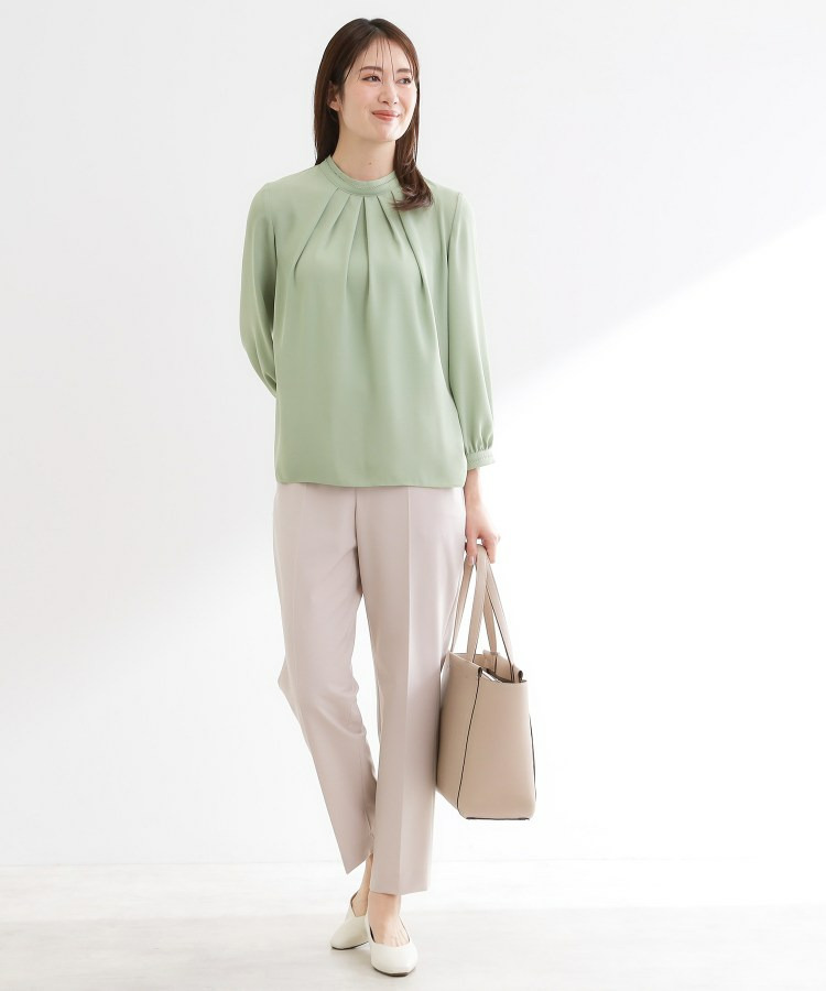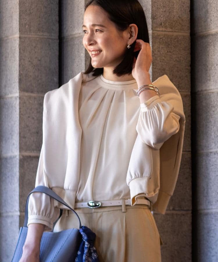 後ろはスナップ開きで着脱もしやすい設計にし、シンプルな中にもアクセントが効いた上品で洗練されたブラウスになっています。