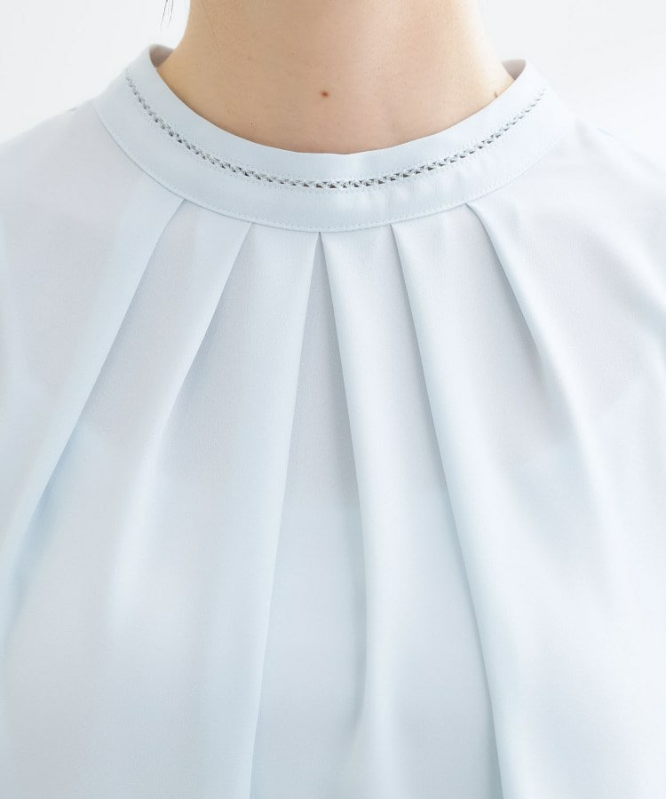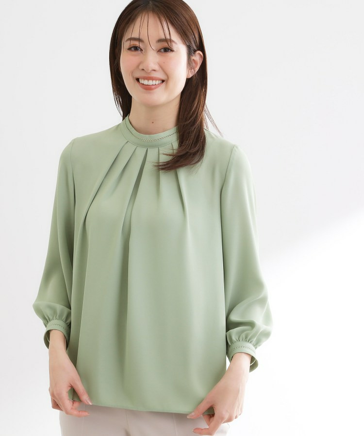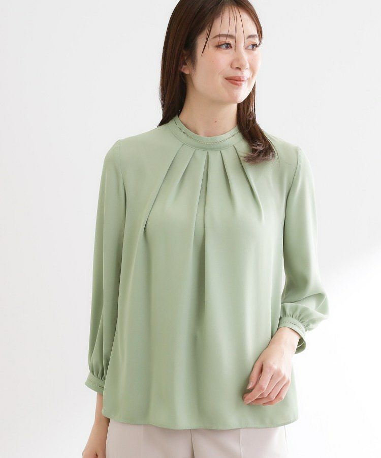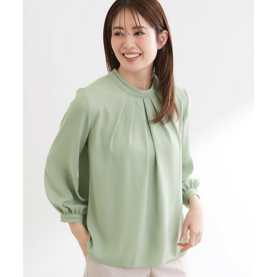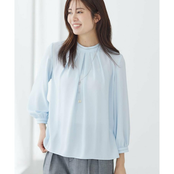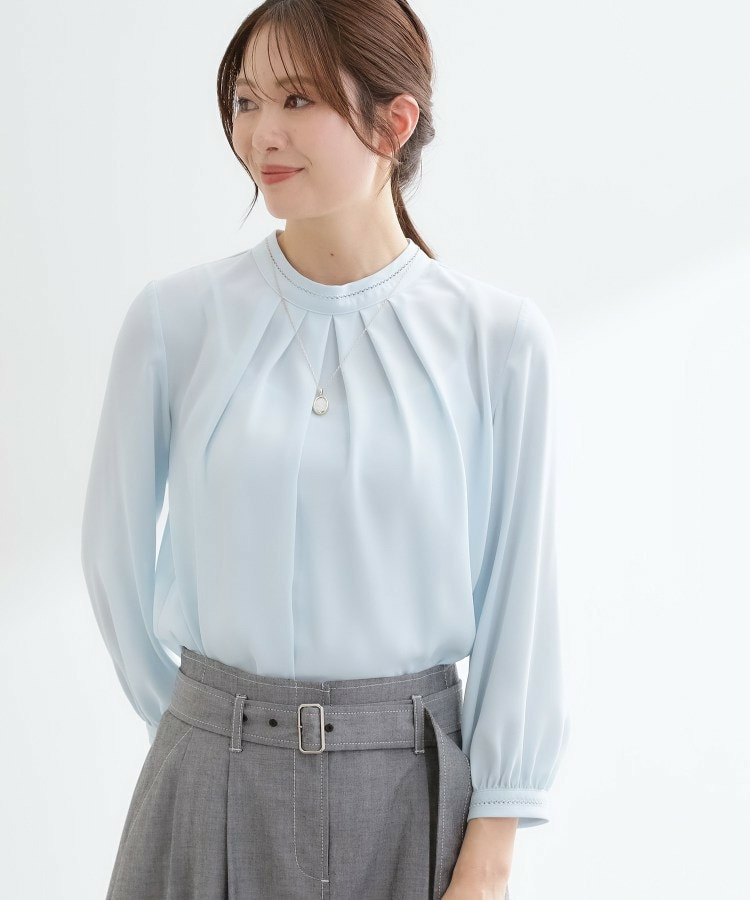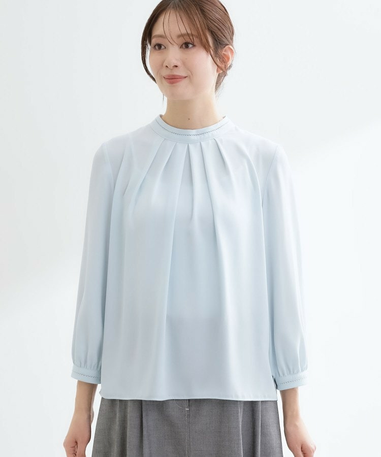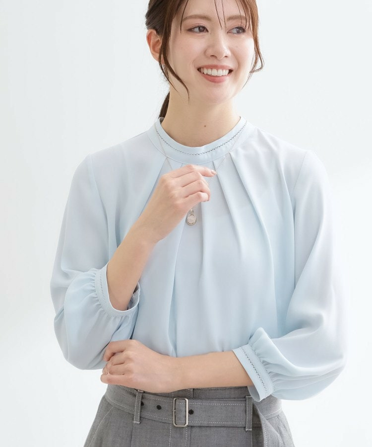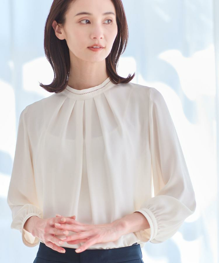 スタンド衿が印象的なディテールにこだわったデザインブラウス。