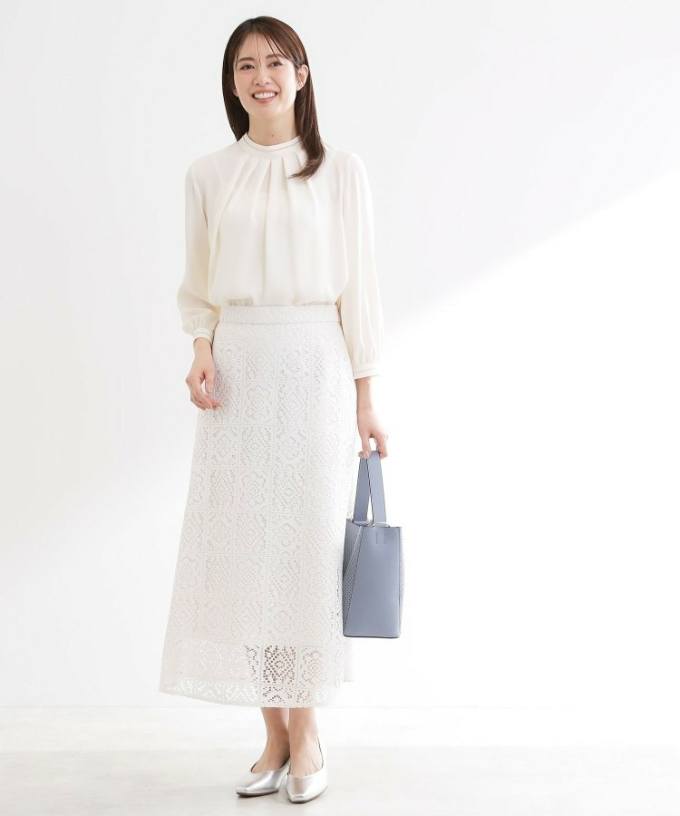 前衿ぐりにたっぷりタックを、自然に立ち上がるスタンド衿と袖口にはピコット刺しゅうを入れ、さりげない意匠性と表情をプラスし、立体感のあるシルエットを演出しています。