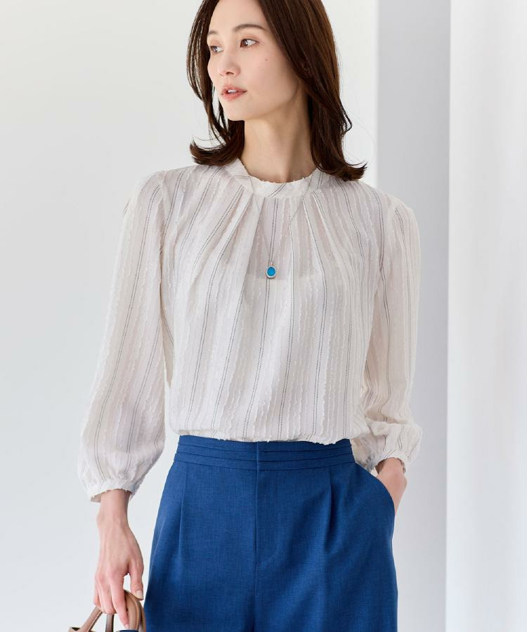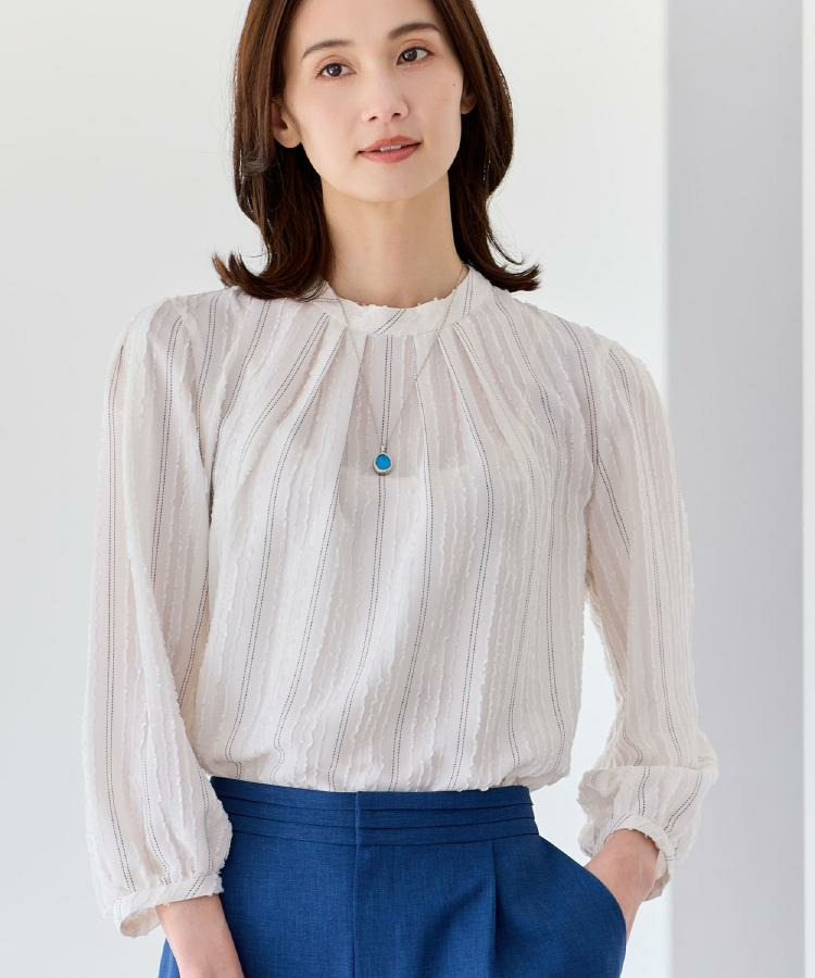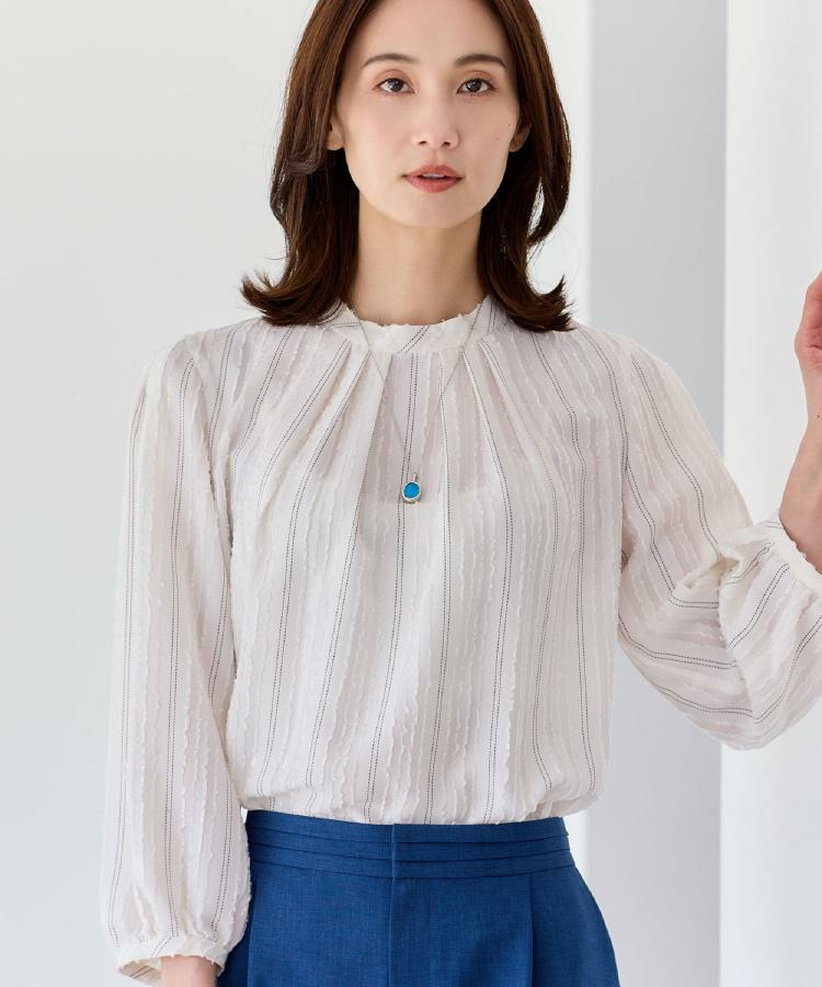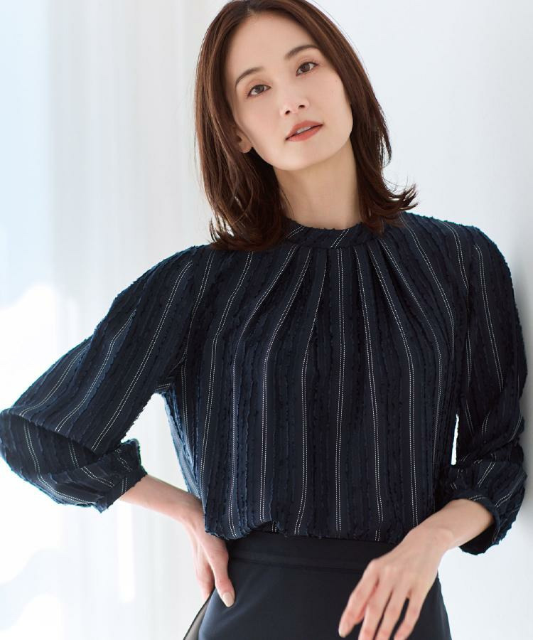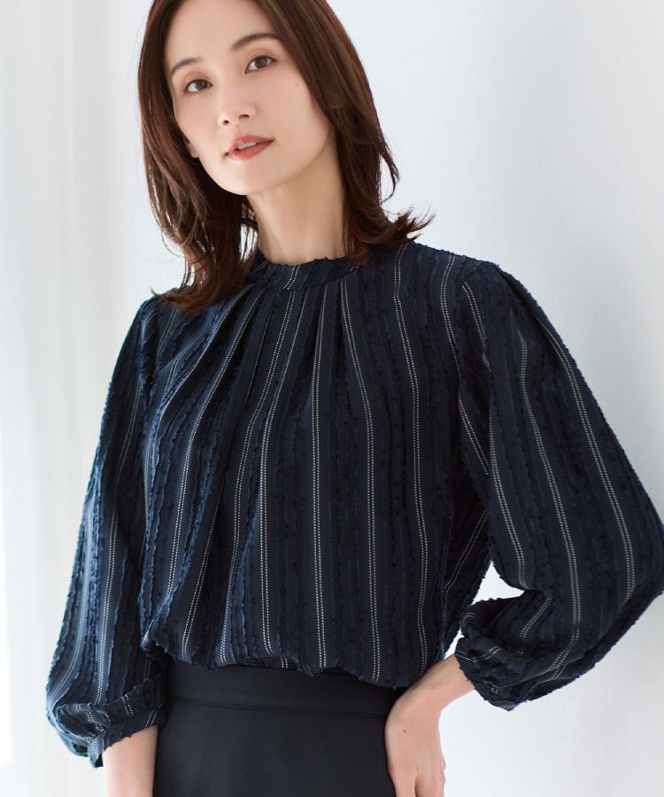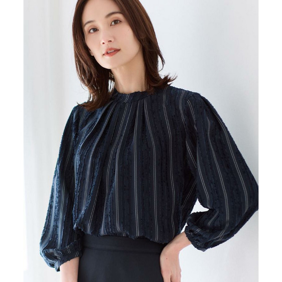 モール柄が上品に映える、ストライプ柄ジャカード素材を使用した表情豊かなブラウス。
