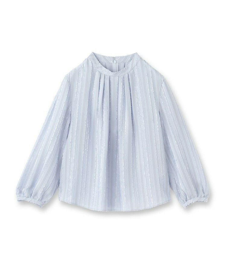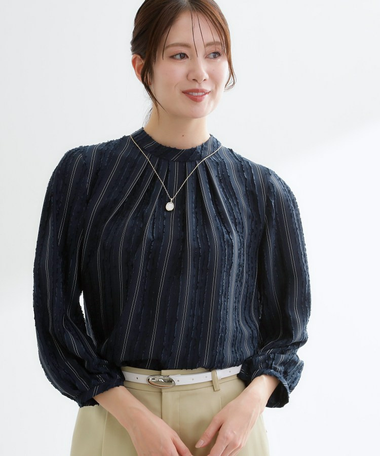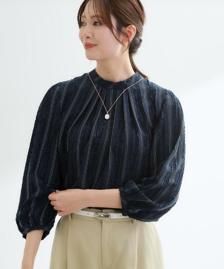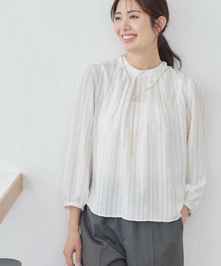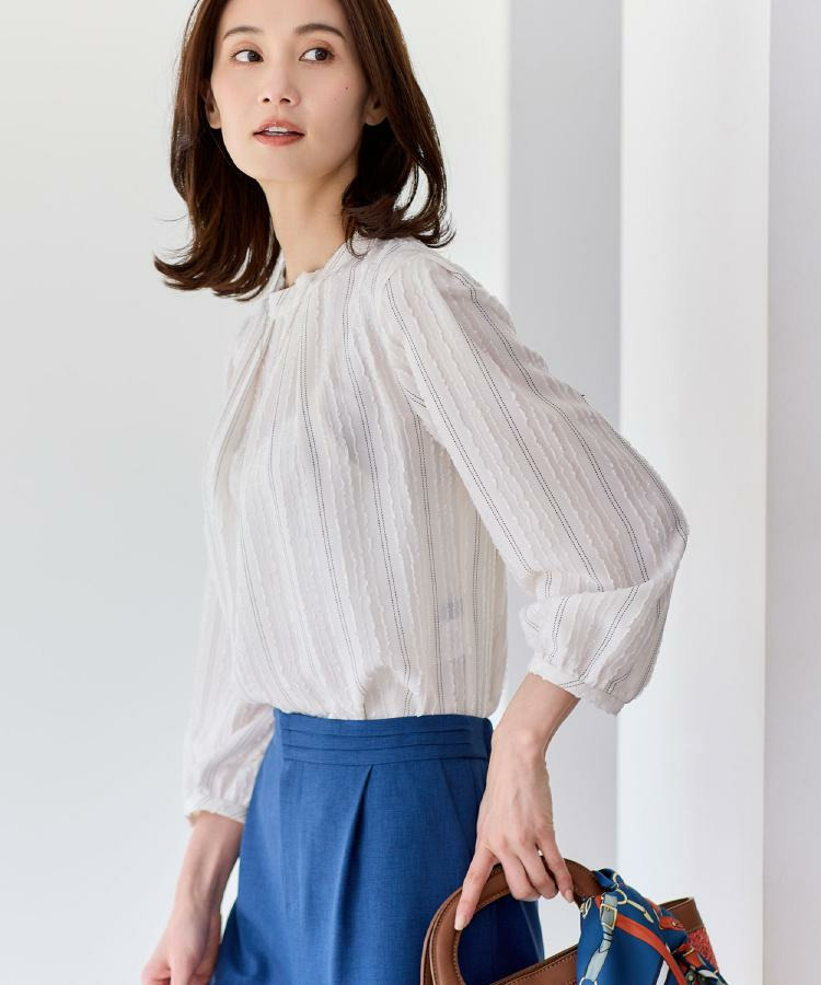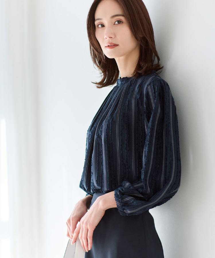 モール柄が上品に映える、ストライプ柄ジャカード素材を使用した表情豊かなブラウス。