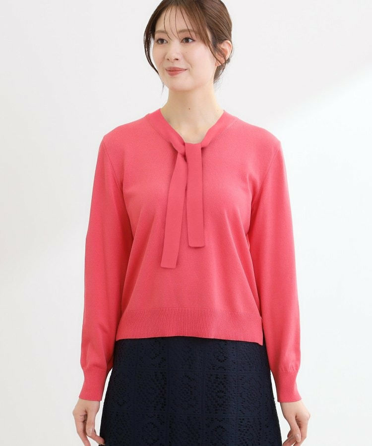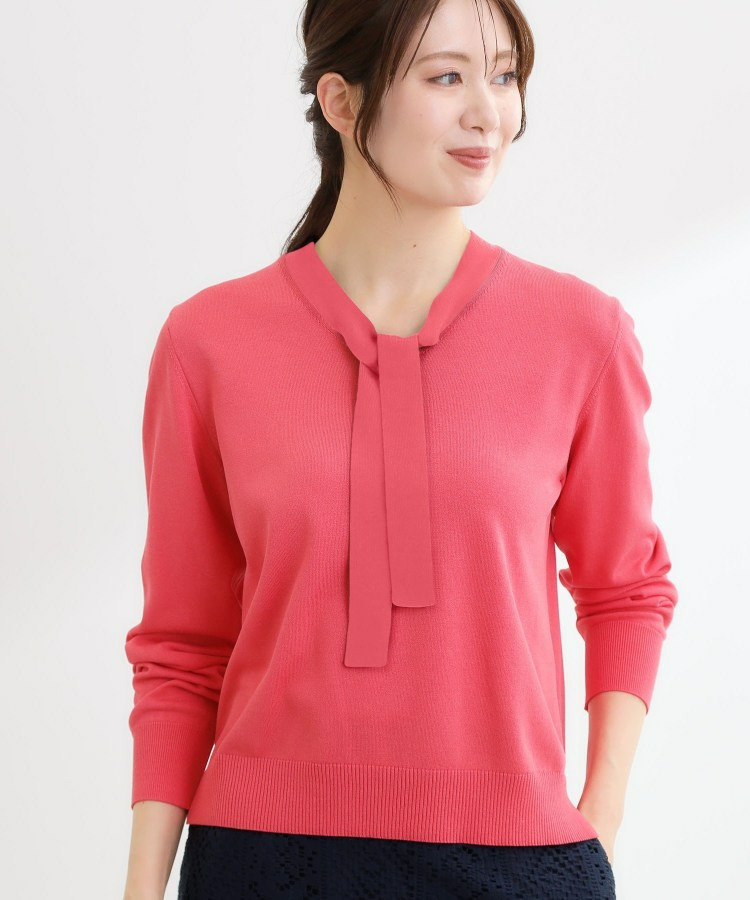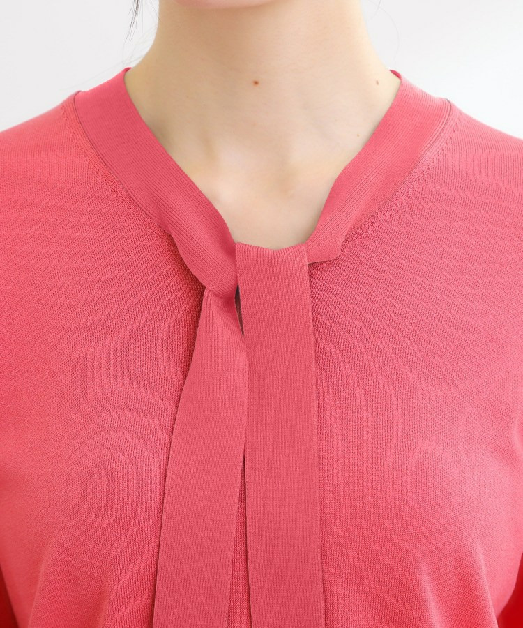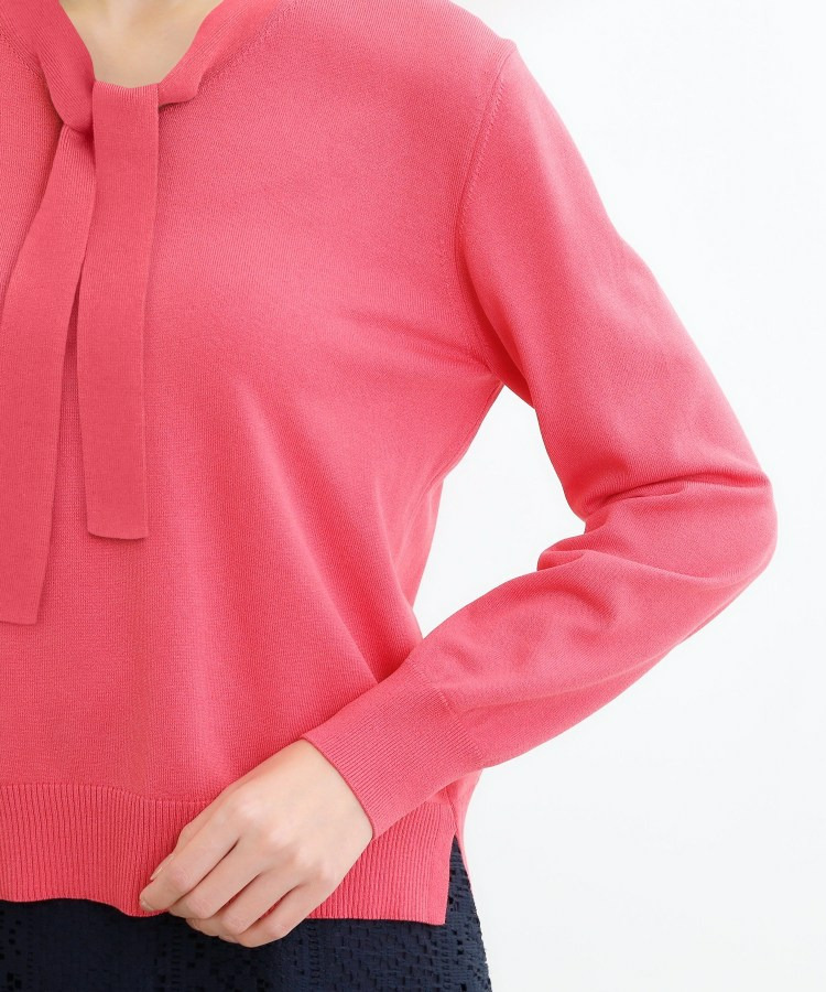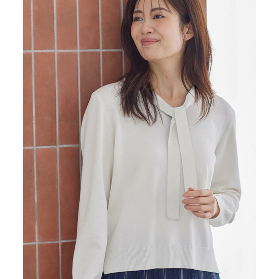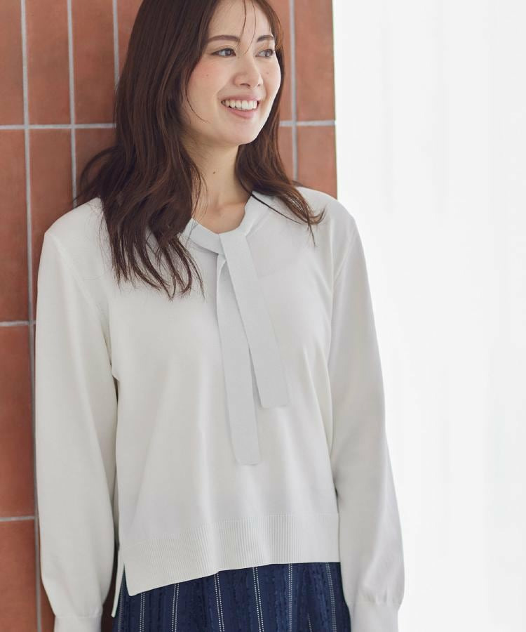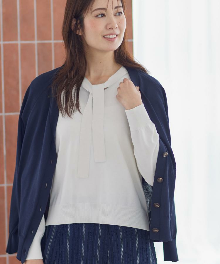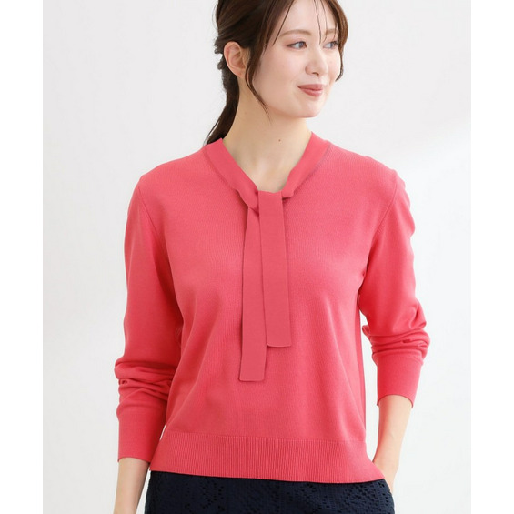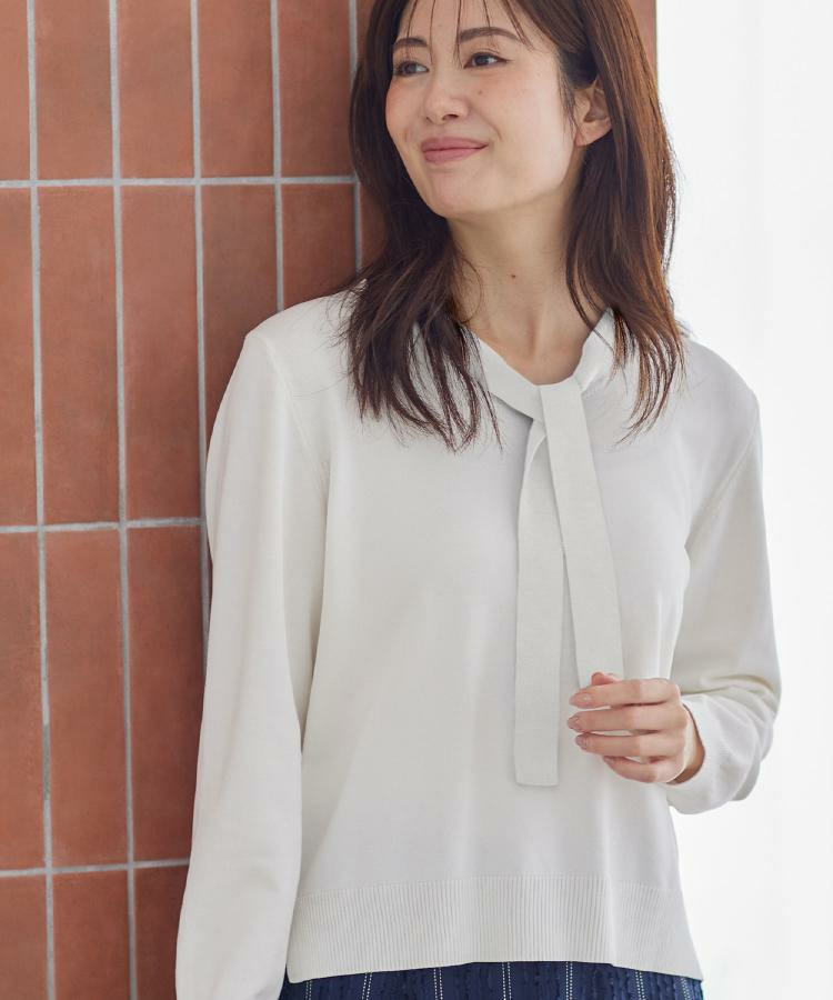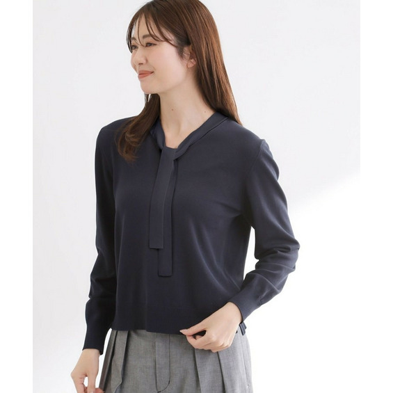ボウタイデザインが上品で洗練されたムードを演出するハイゲージニットトップス。
