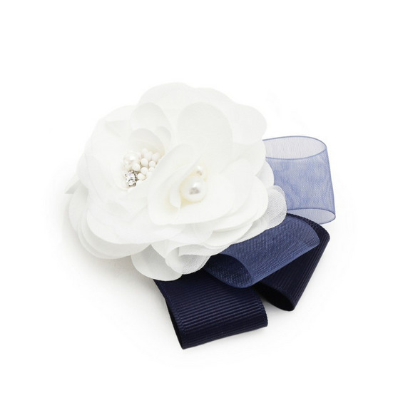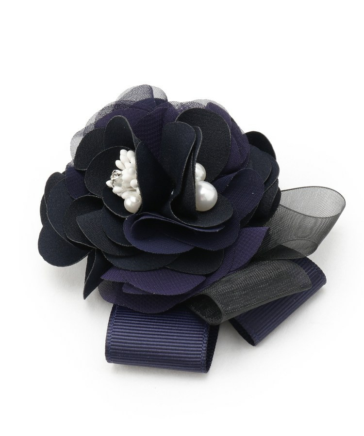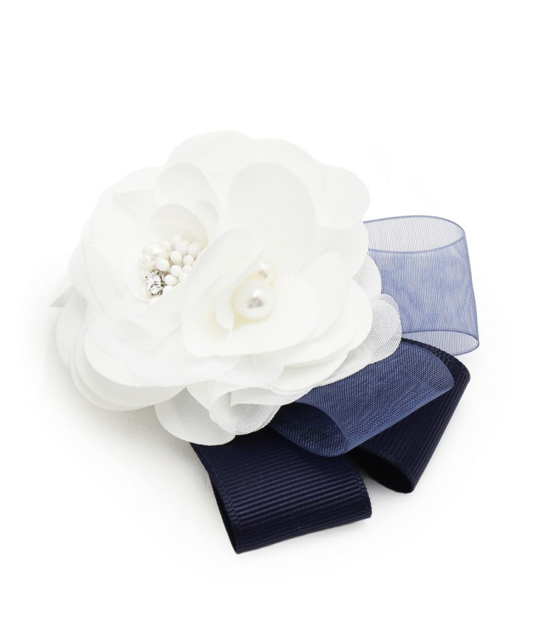 中心にはパール調とクリスタル風ビーズを配して上品な輝きを添え、背面のネイビーリボンがコントラストとなって洗練された印象に仕上げました。