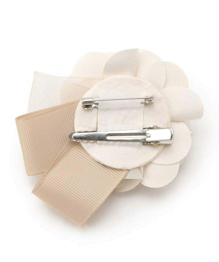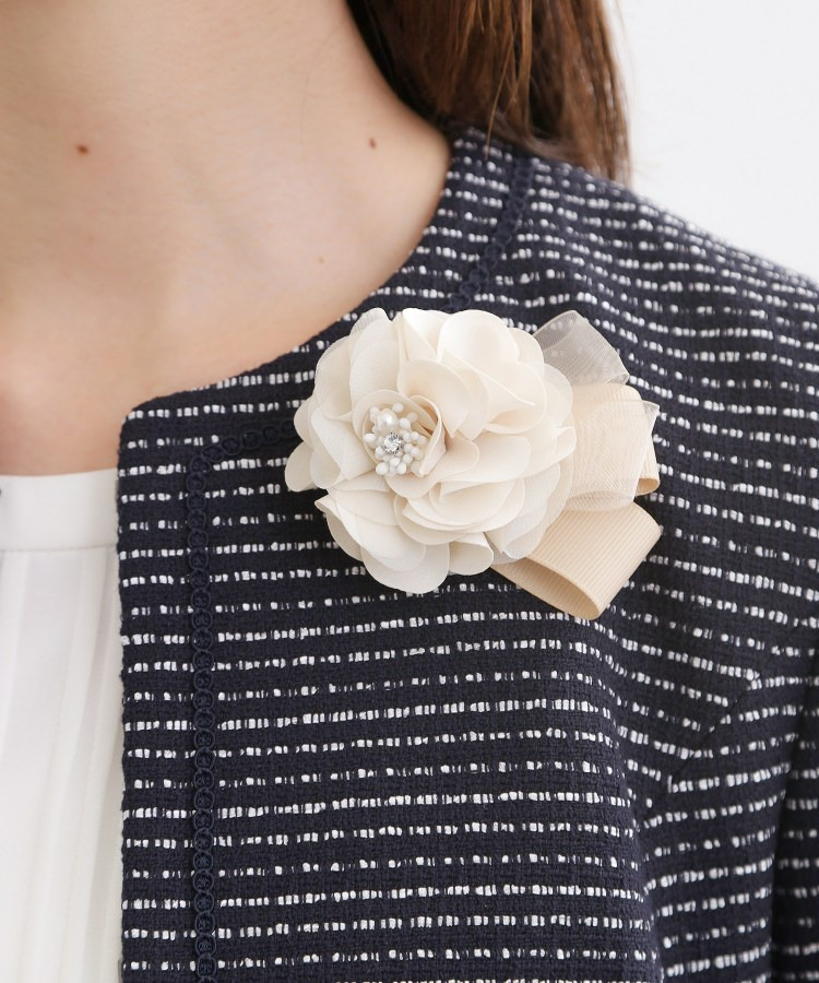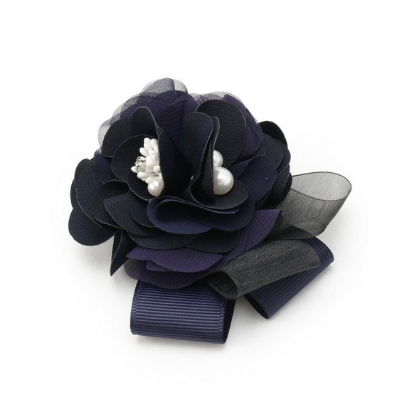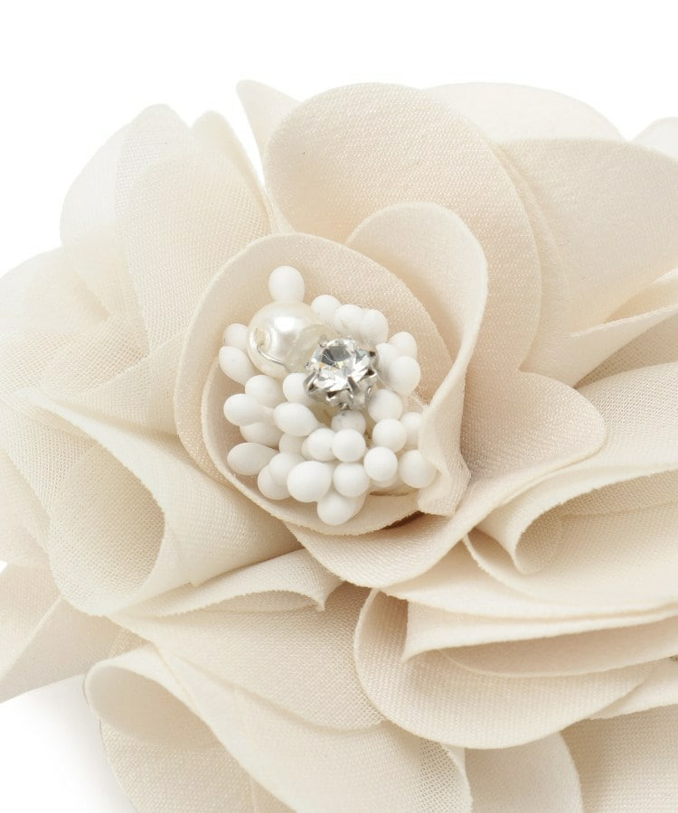 光沢のあるサテン風素材で仕立てた立体的な花弁が重なり合った、清楚さとボリューム感が華やかなコサージュ。