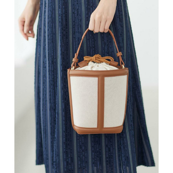 エルガリー生地(キャンバス調のしっかりしたファブリック)のナチュラルな雰囲気に、合成皮革のパイピングラインを組み合わせたバケット型ワンショルダーバッグ。