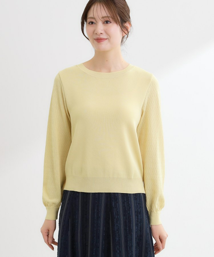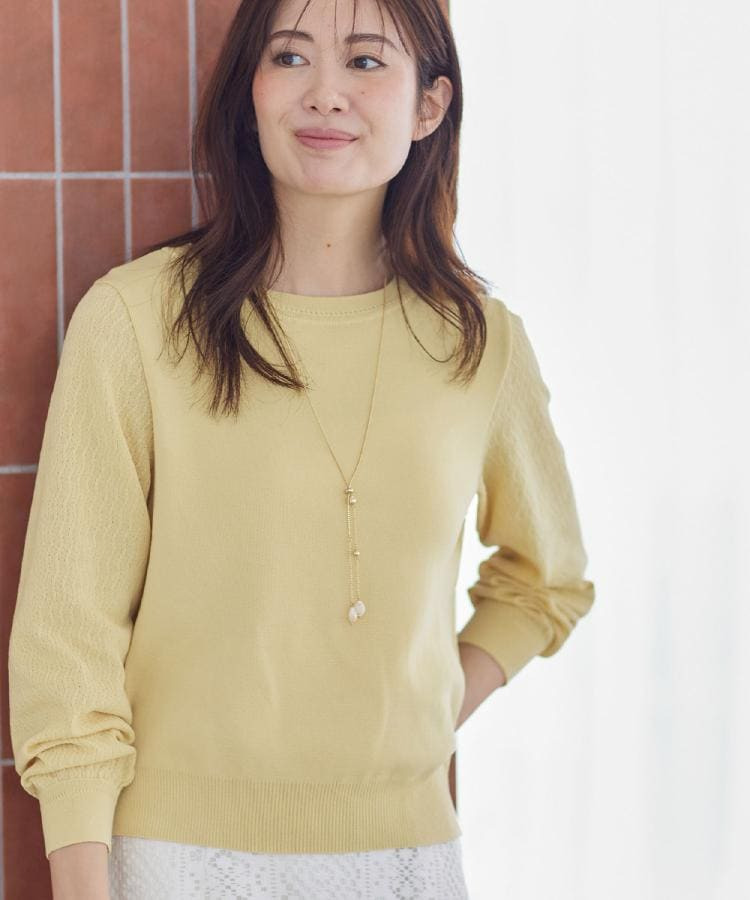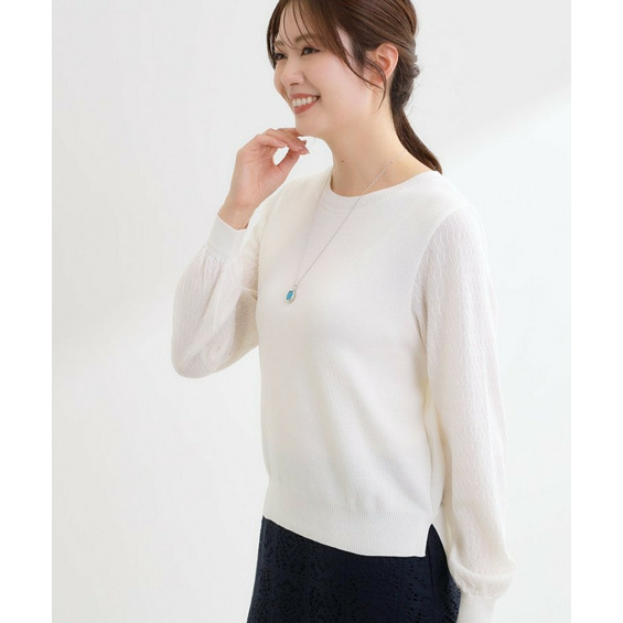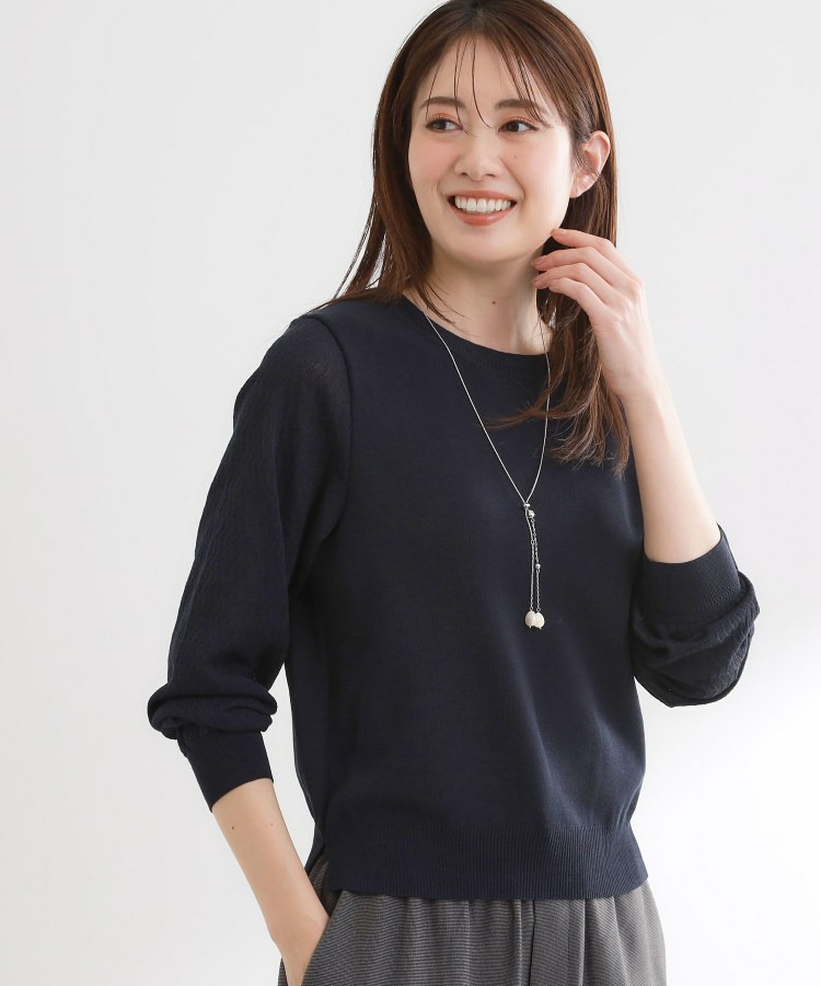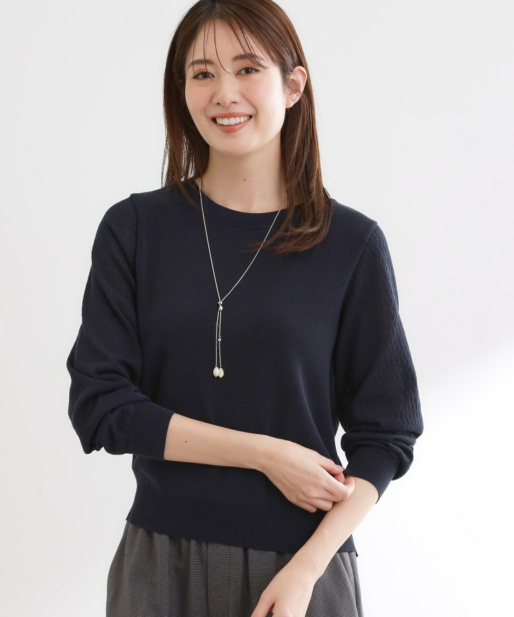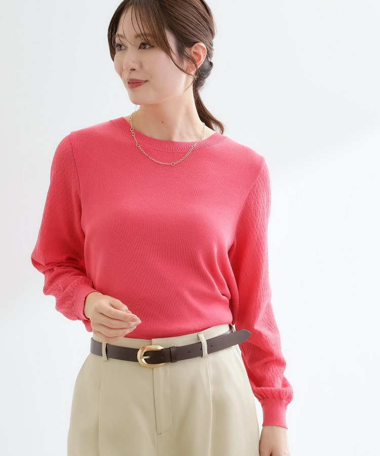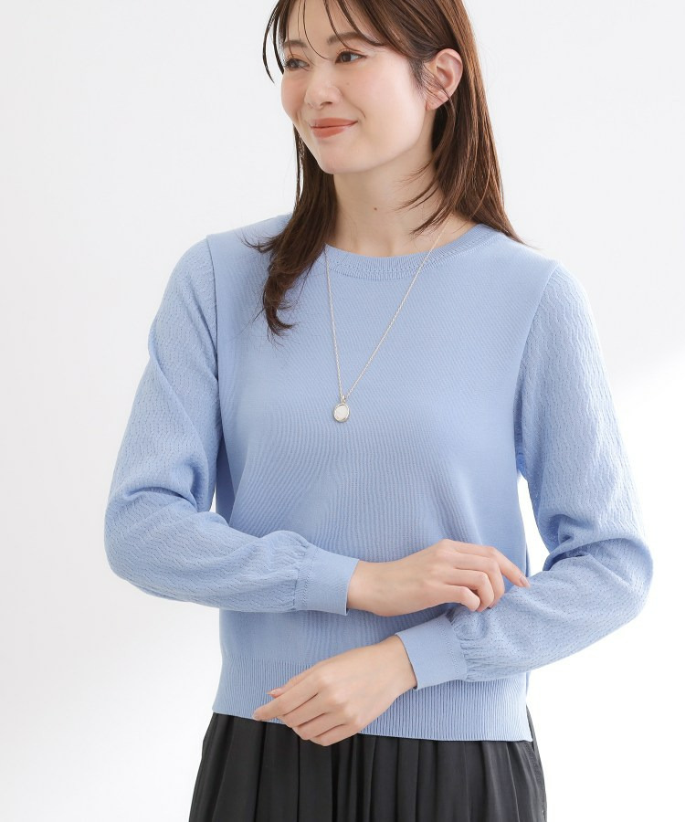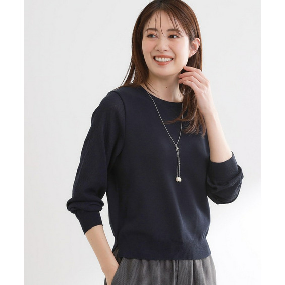 袖に繊細な地柄を施した上品なハイゲージニットプルオーバー。