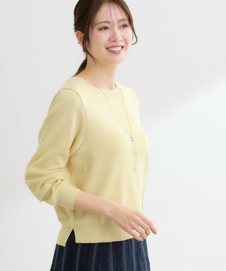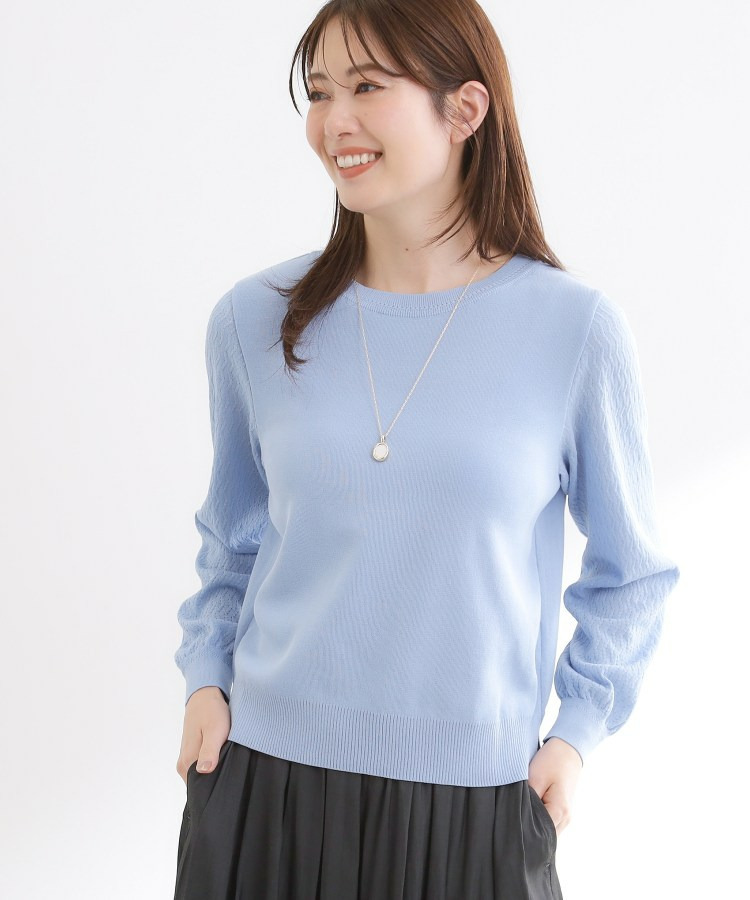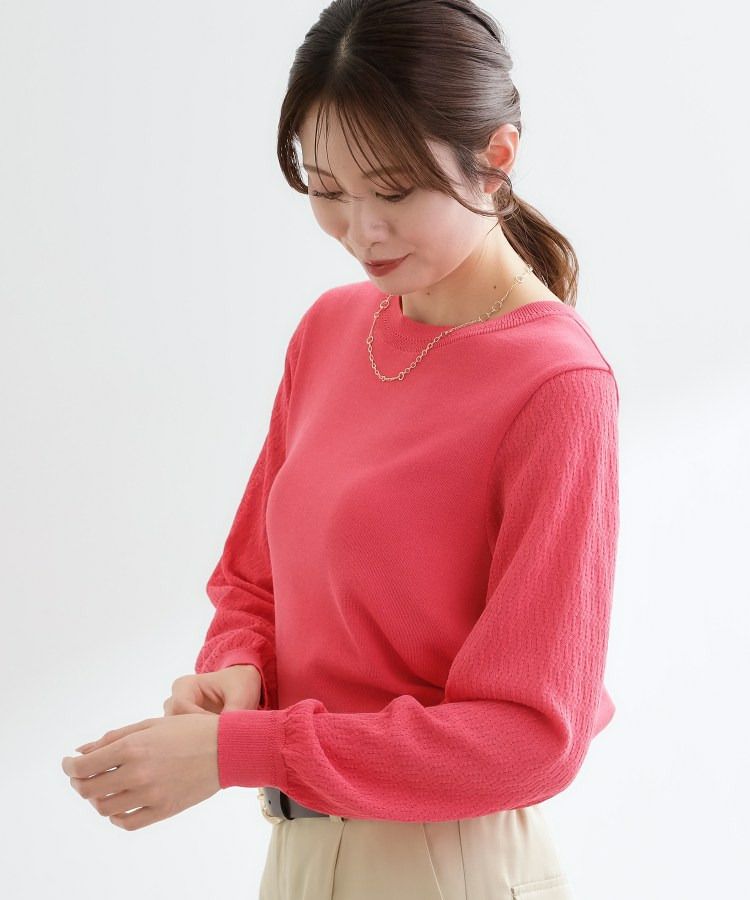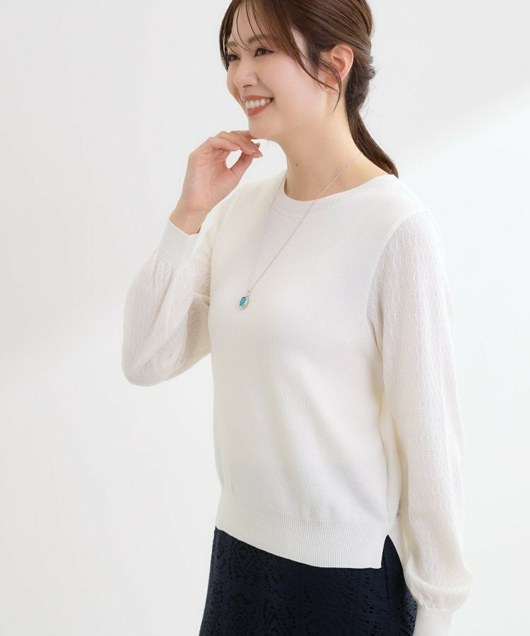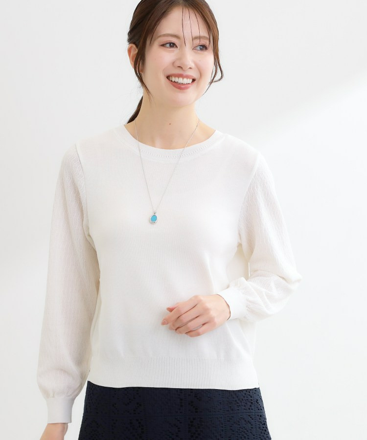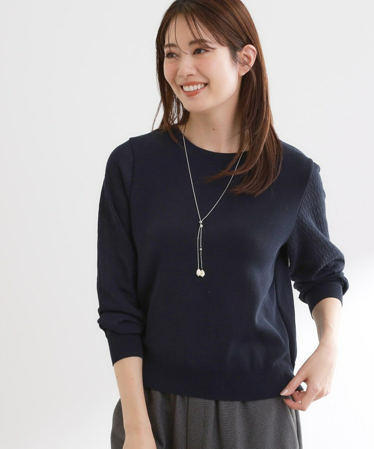 袖に繊細な地柄を施した上品なハイゲージニットプルオーバー。
