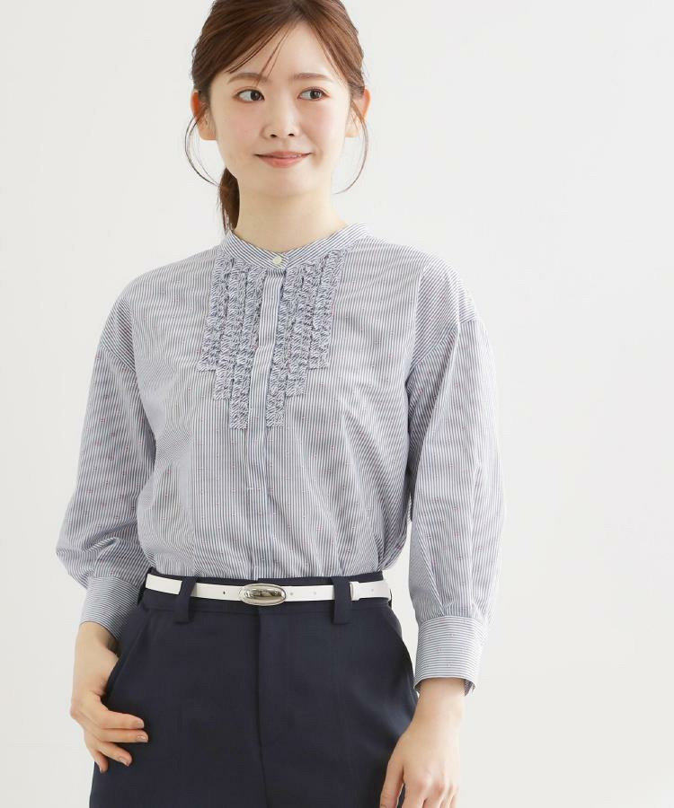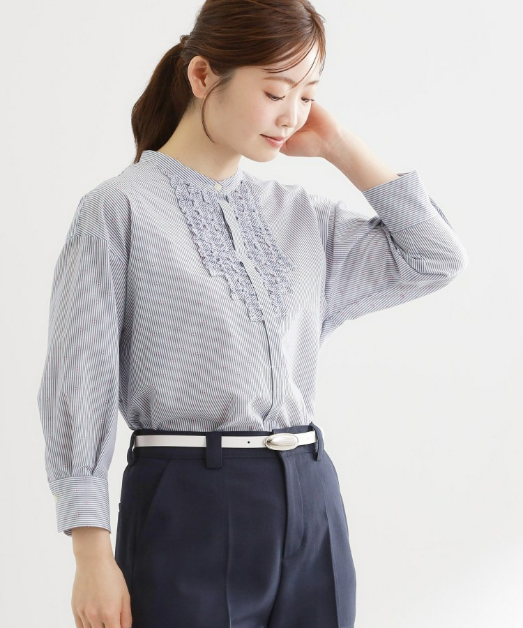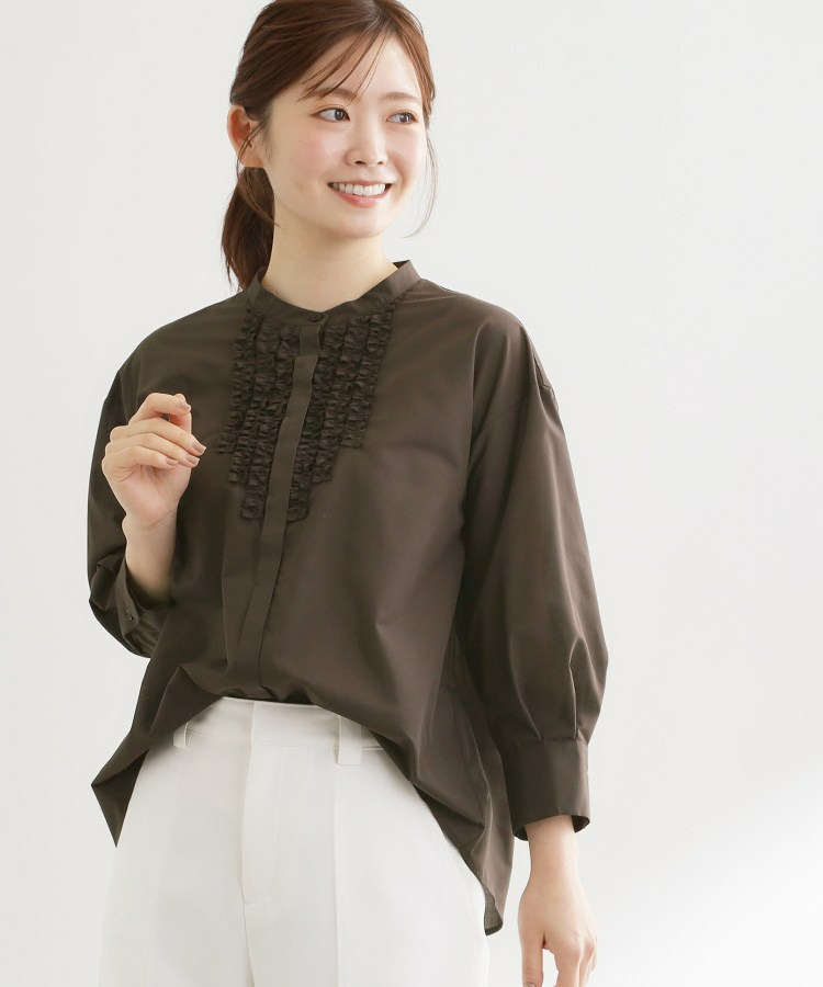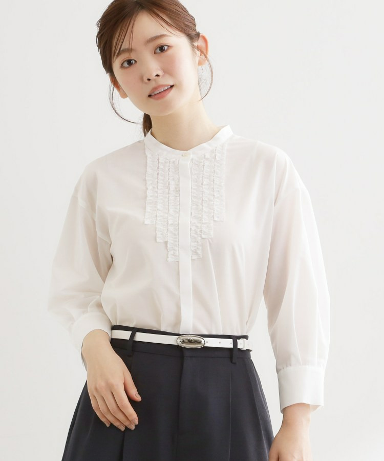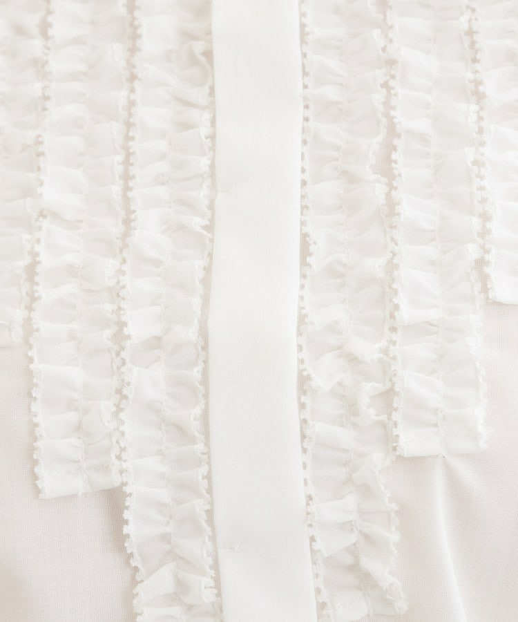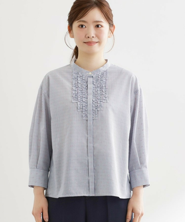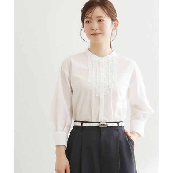 フロントには立体感のあるフリルデザインをあしらい、縦ラインを強調することですっきりとした印象に仕上げた八分袖ブラウス。