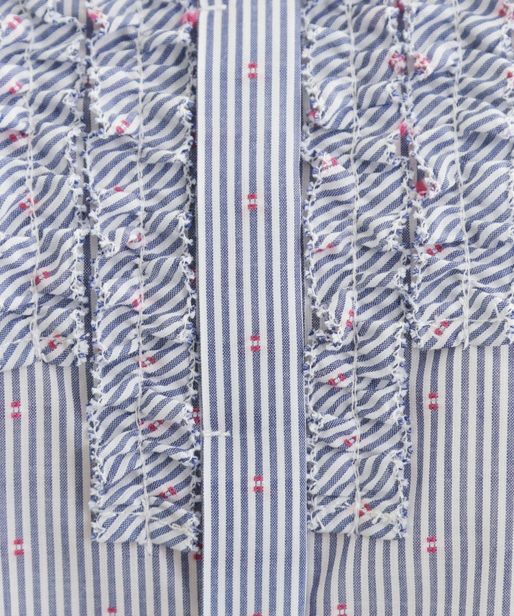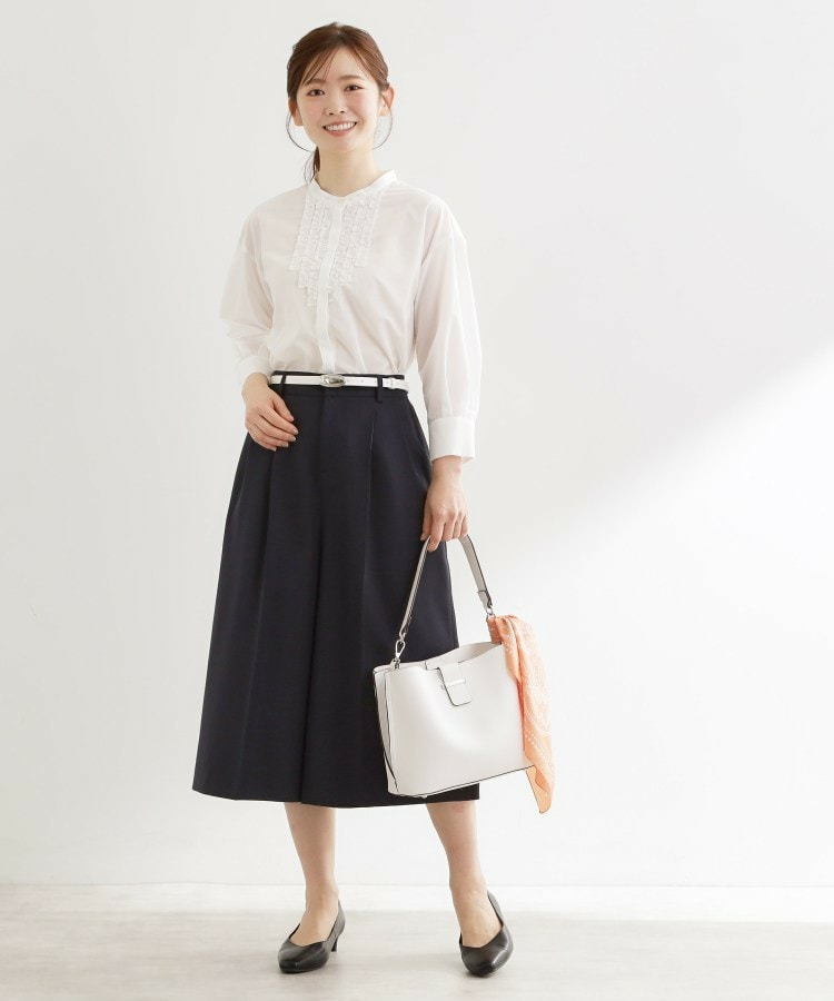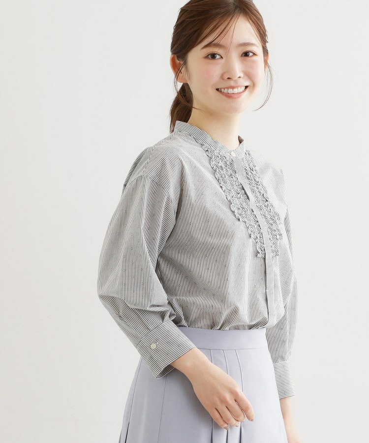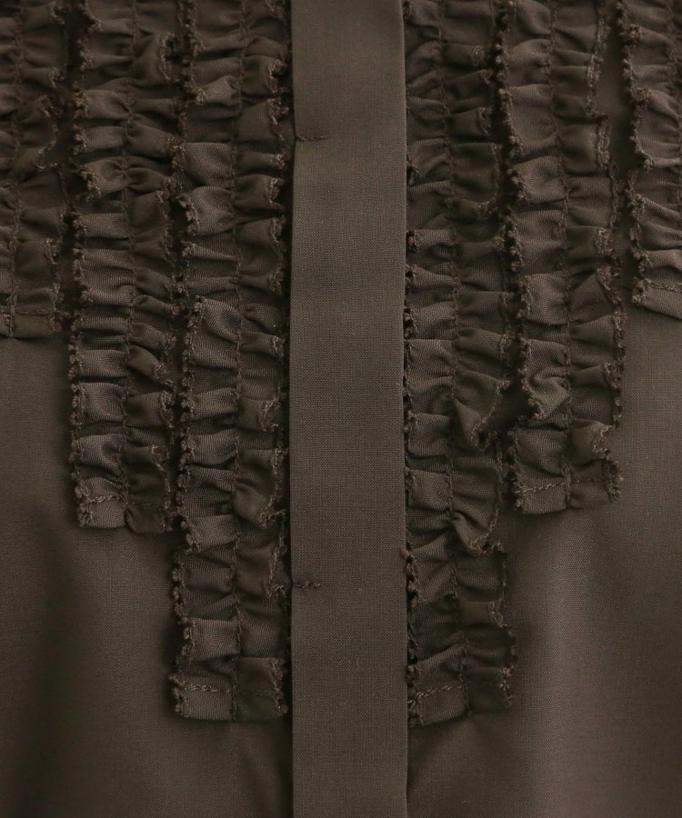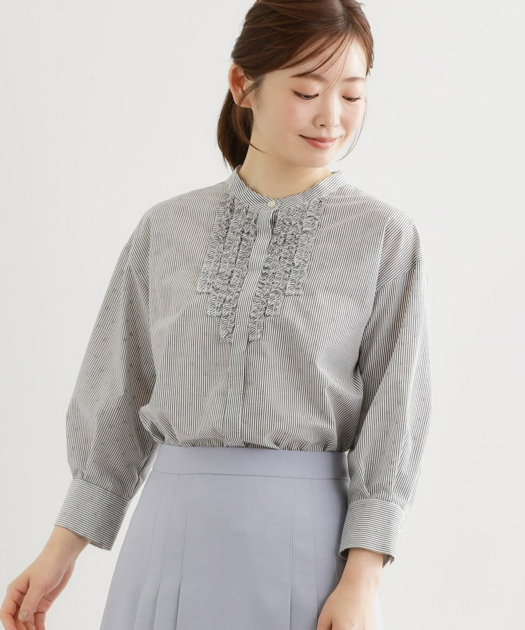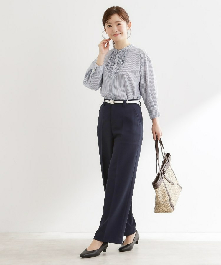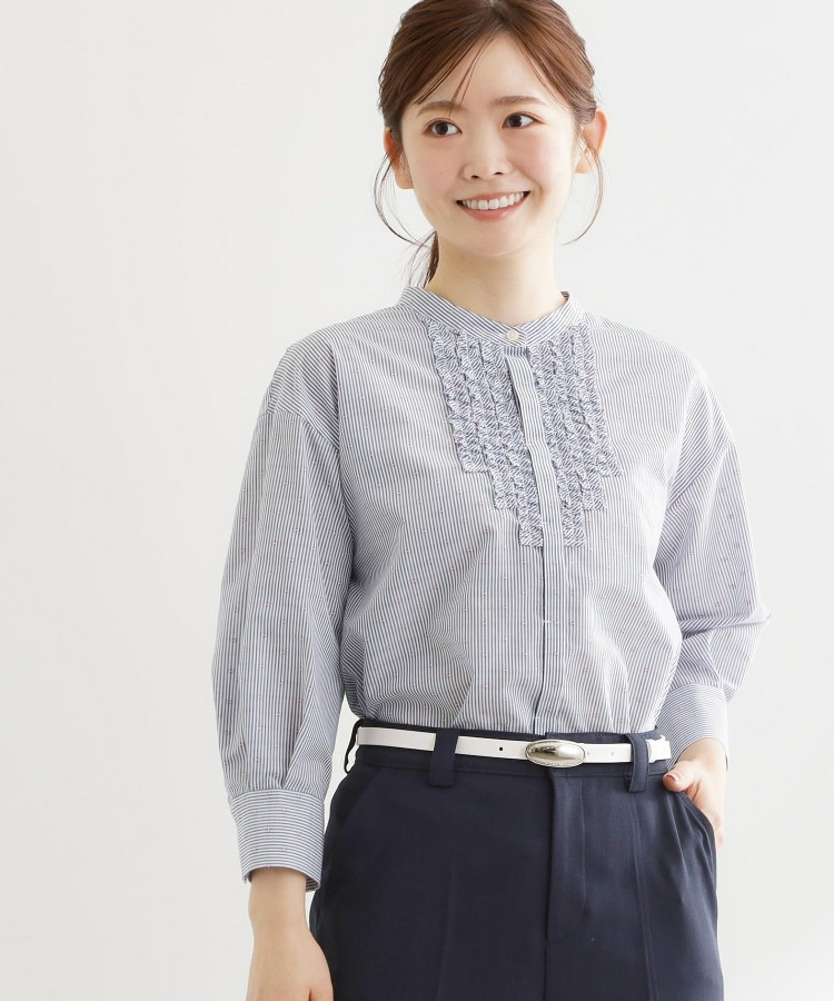フロントには立体感のあるフリルデザインをあしらい、縦ラインを強調することですっきりとした印象に仕上げた八分袖ブラウス。