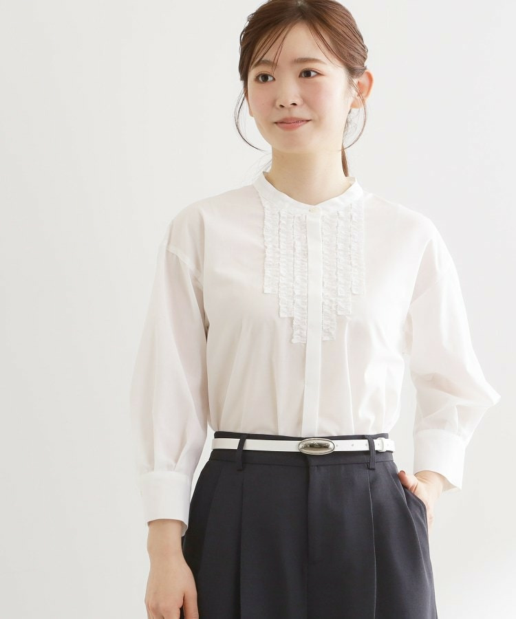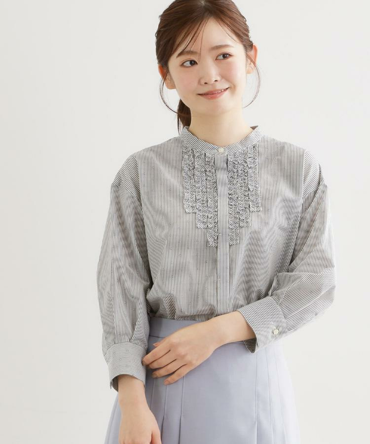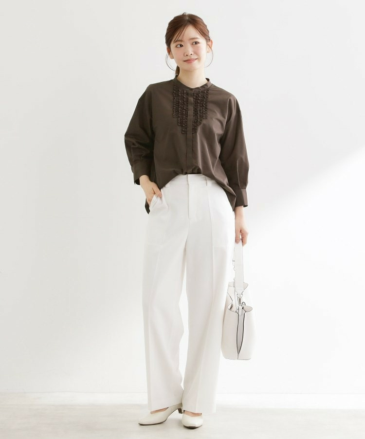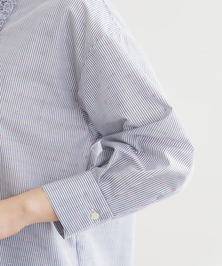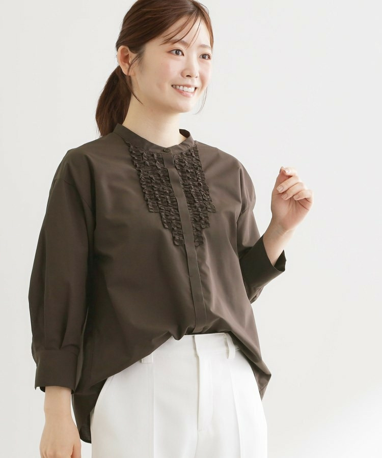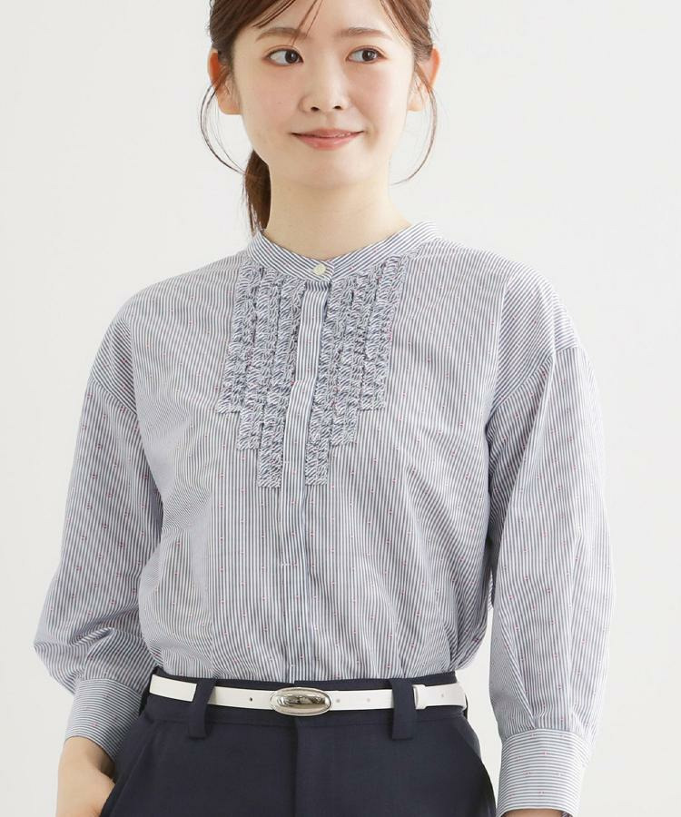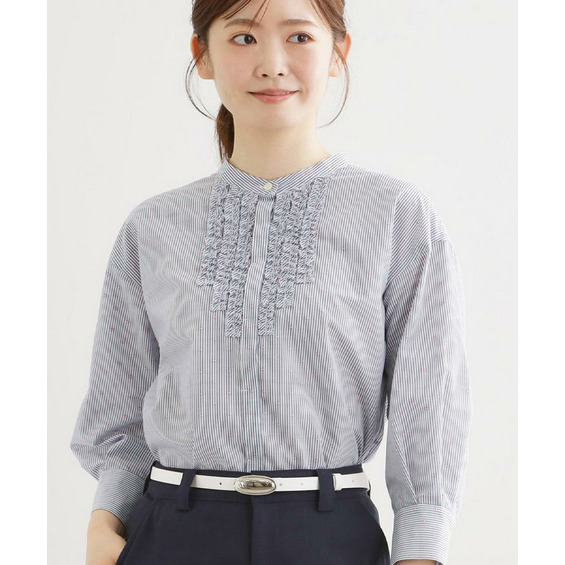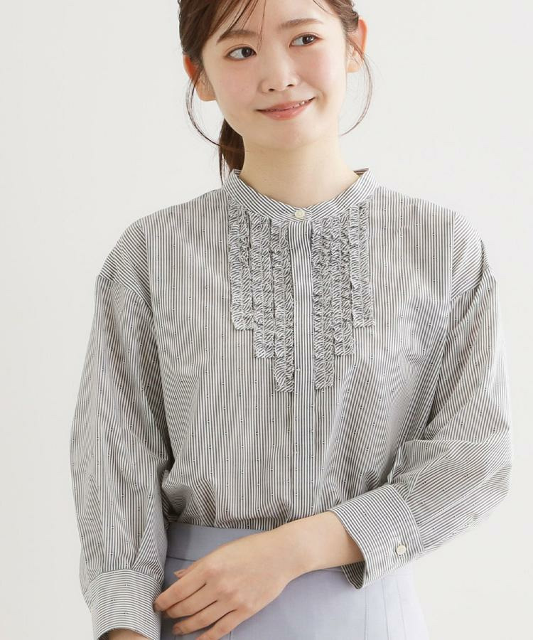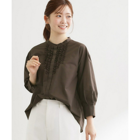 衿元は主張しすぎないバンド衿を採用し、ほどよく抜け感のあるデザインで、袖はボリュームを持たせカフスで引き締めた仕様が全体をバランスよくまとめています。