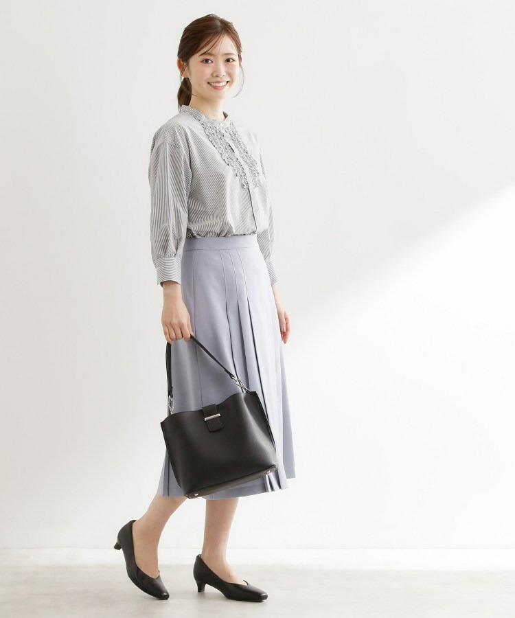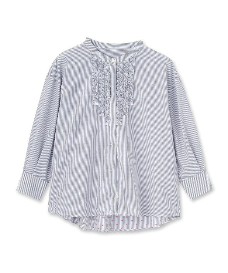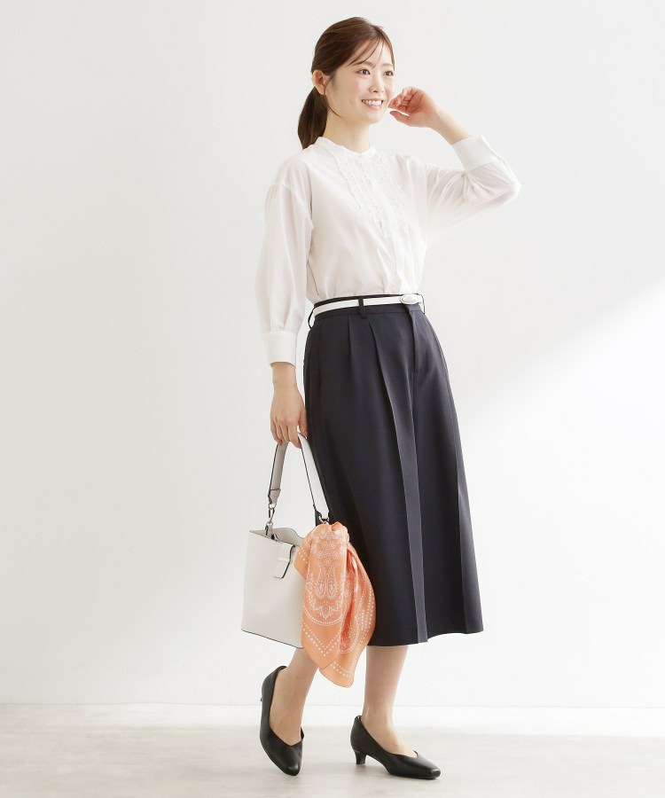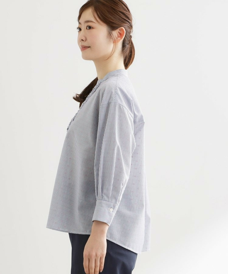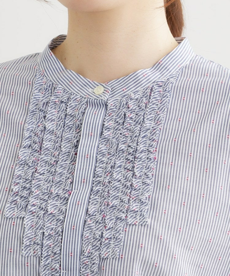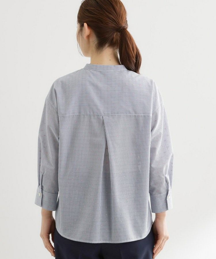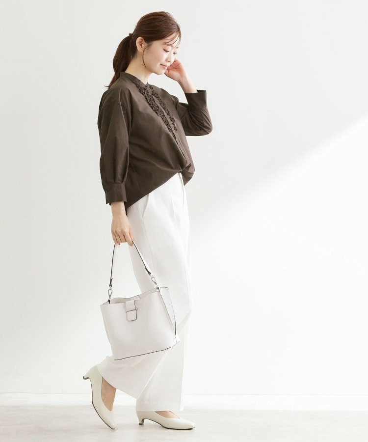 衿元は主張しすぎないバンド衿を採用し、ほどよく抜け感のあるデザインで、袖はボリュームを持たせカフスで引き締めた仕様が全体をバランスよくまとめています。