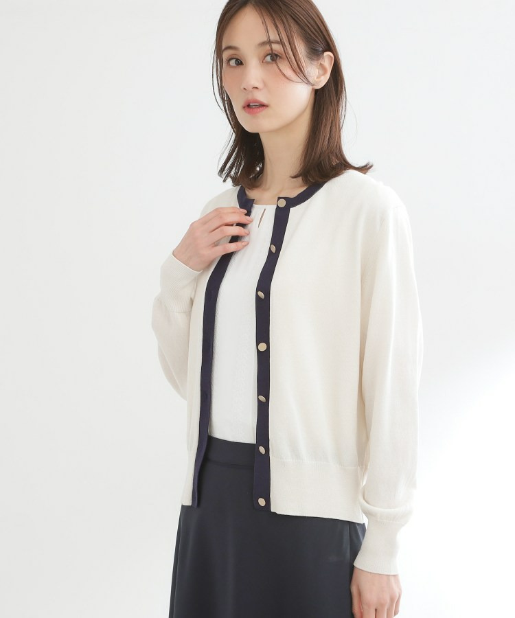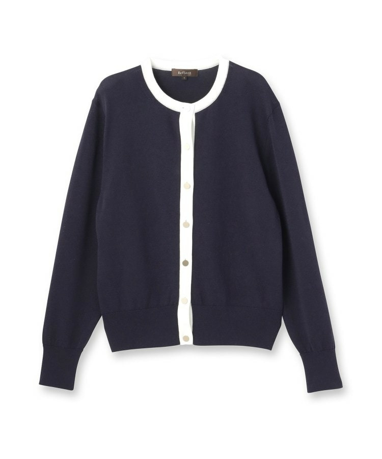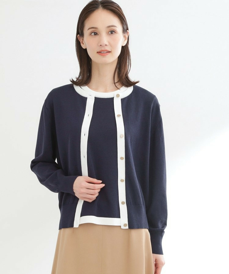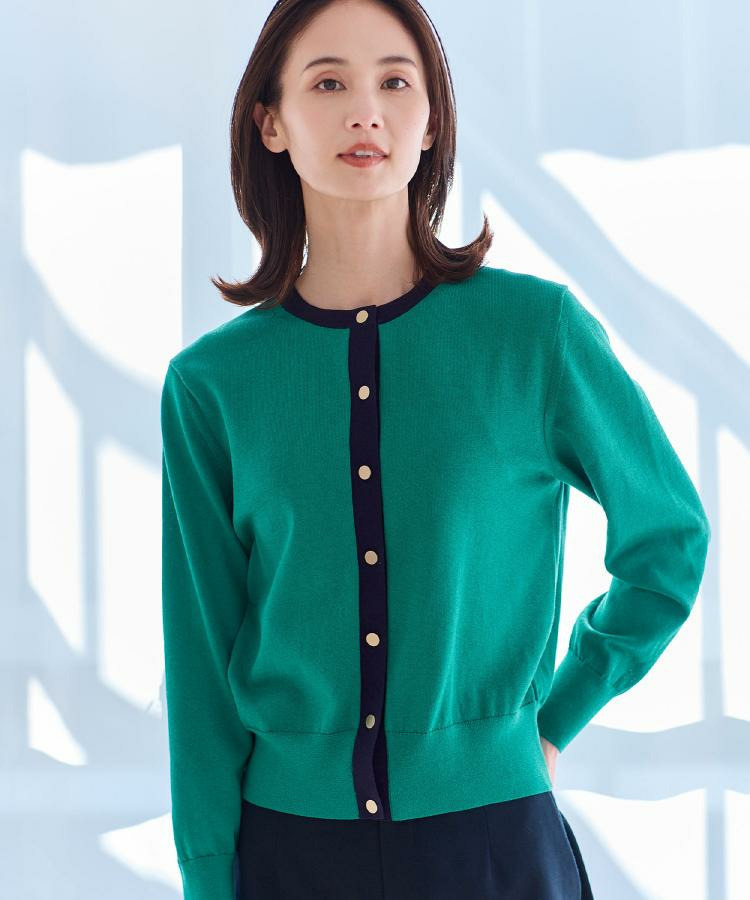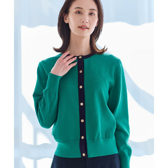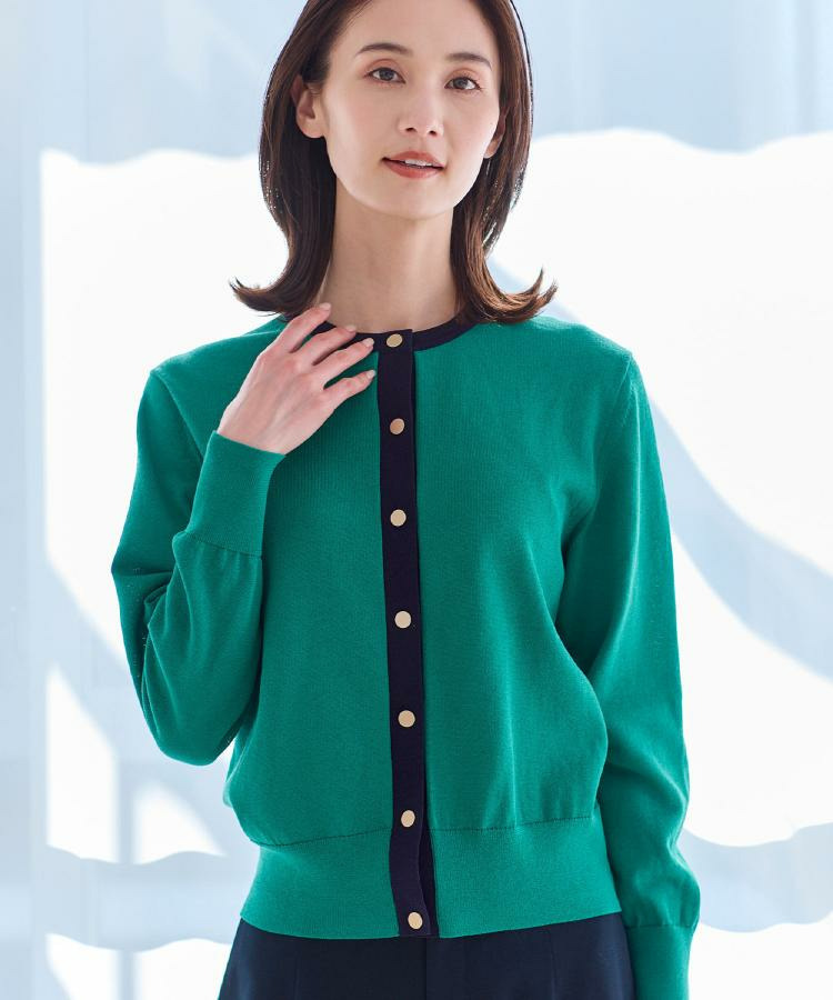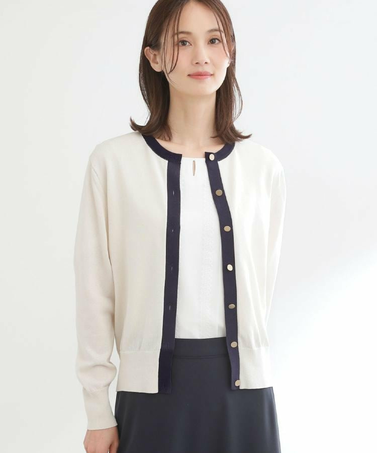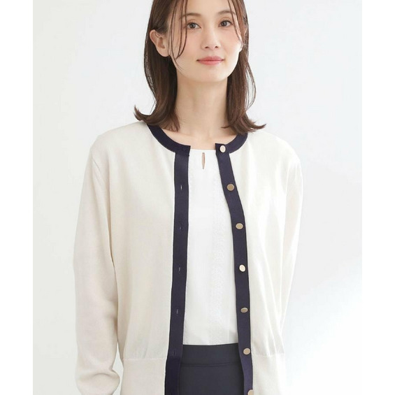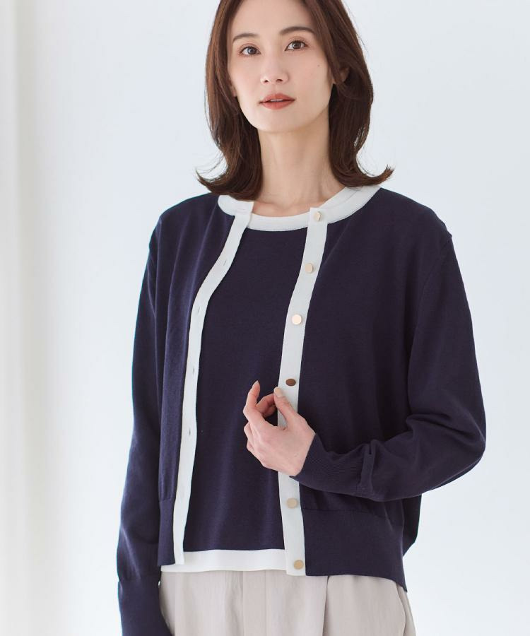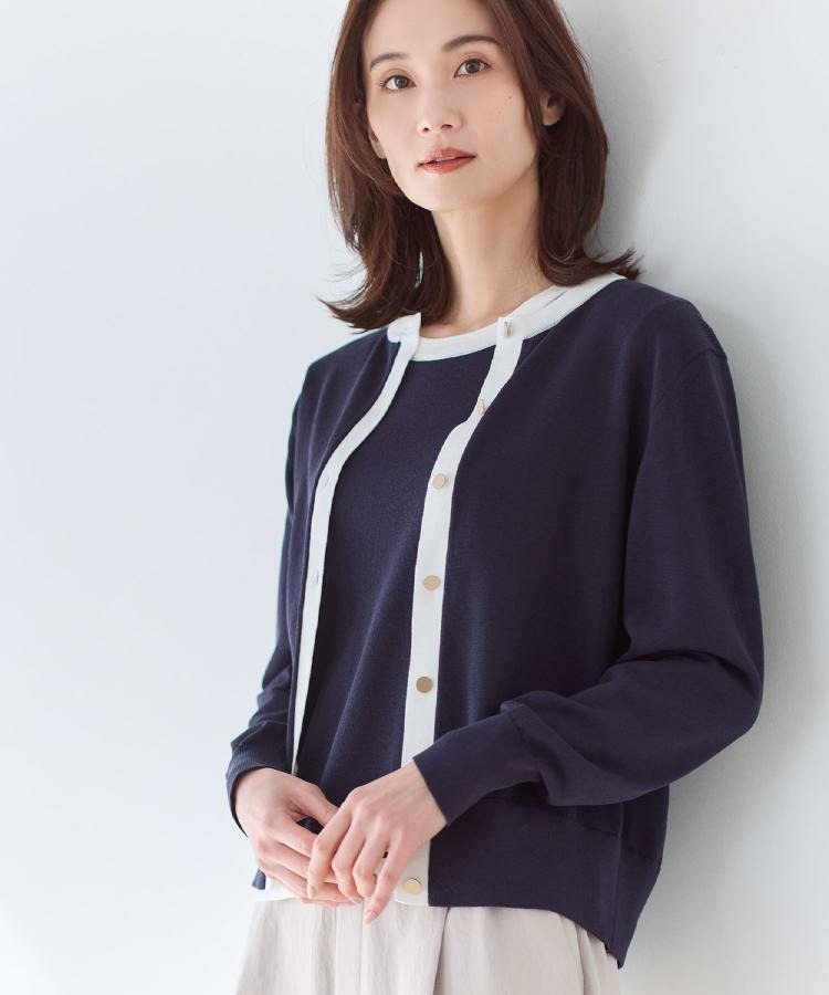 バイカラートリミングが目を惹くニットカーディガン。