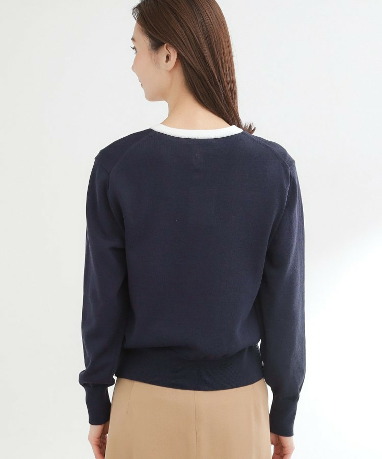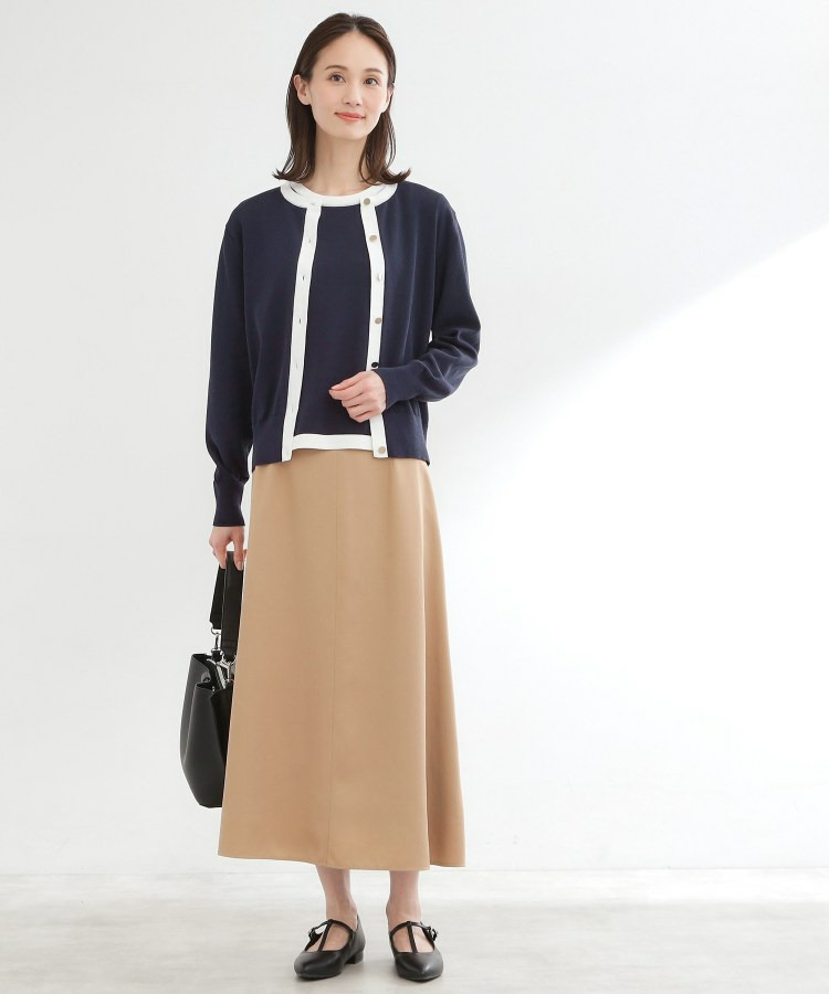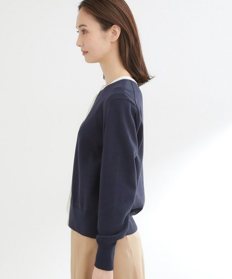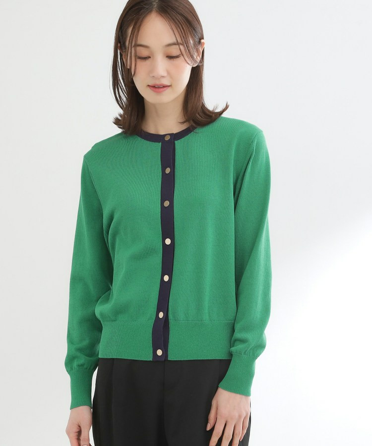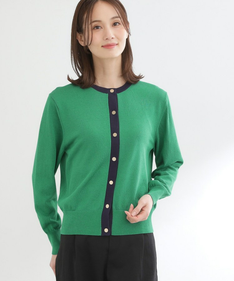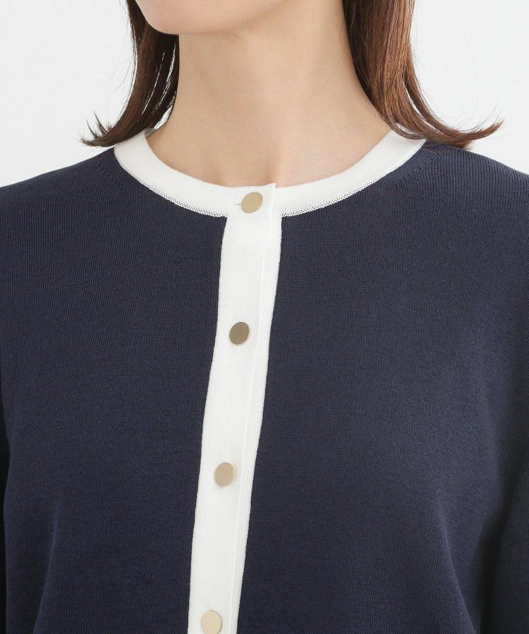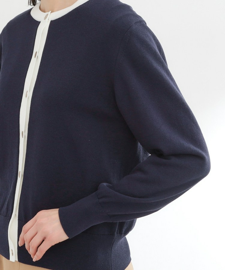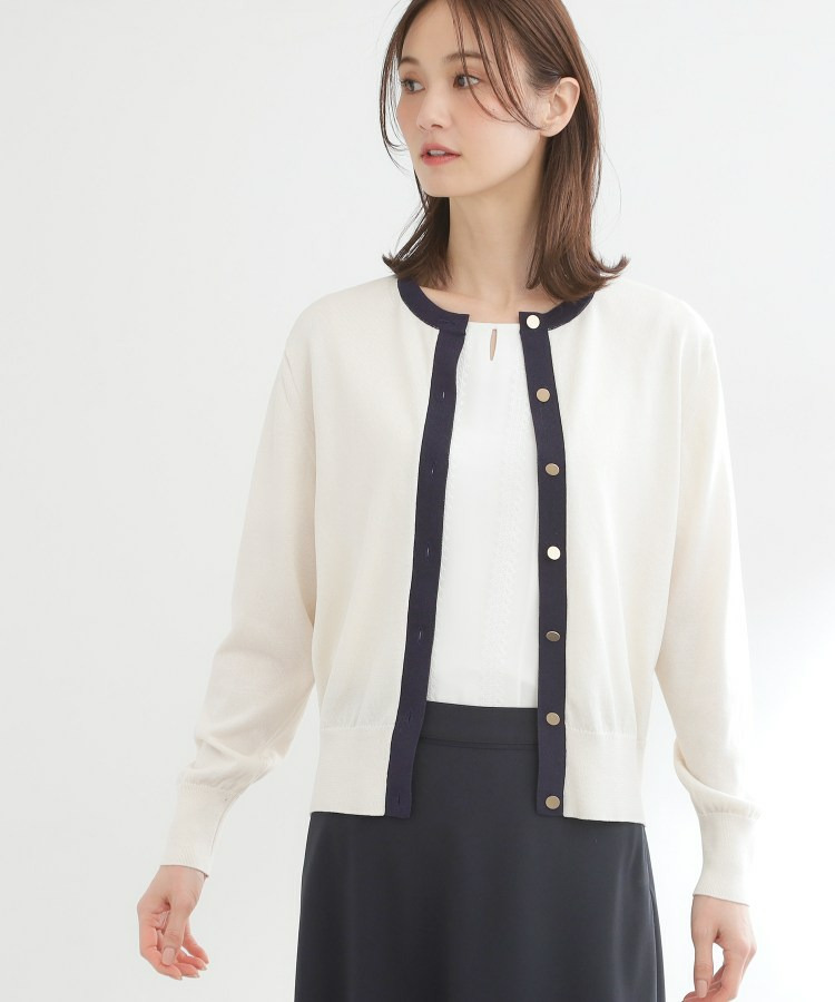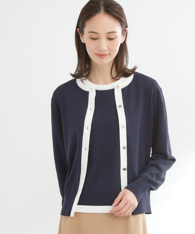 バイカラートリミングが目を惹くニットカーディガン。