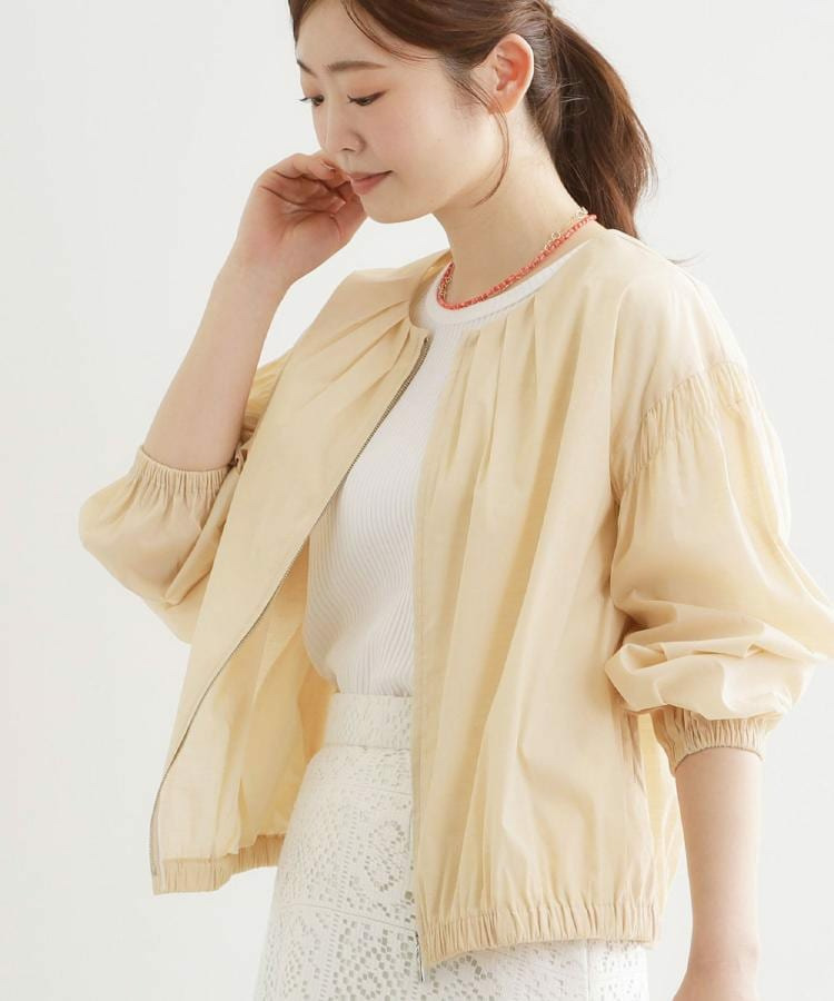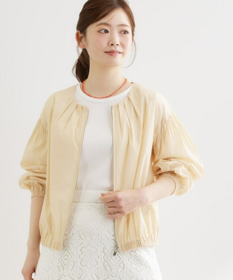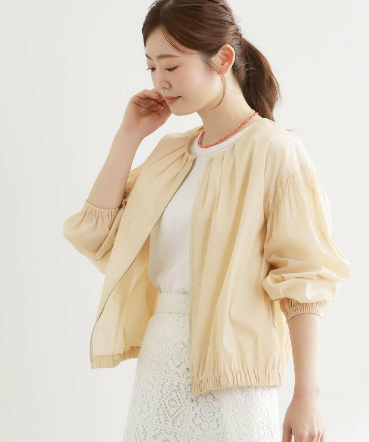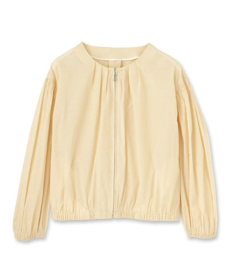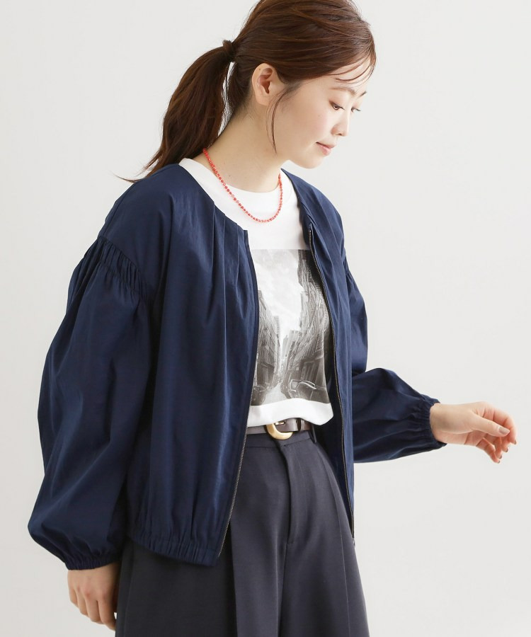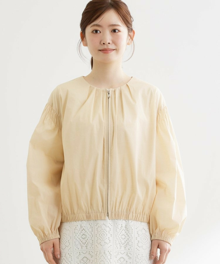 前開きはジップ開きになり、衿ぐりにはタックを入れて動きを出し、袖口、裾にはゴム仕様で着心地の良さとすっきりとしたバランスを両立し、ギャザーで丸みのある立体的なシルエットに仕上げました。