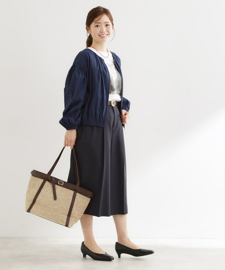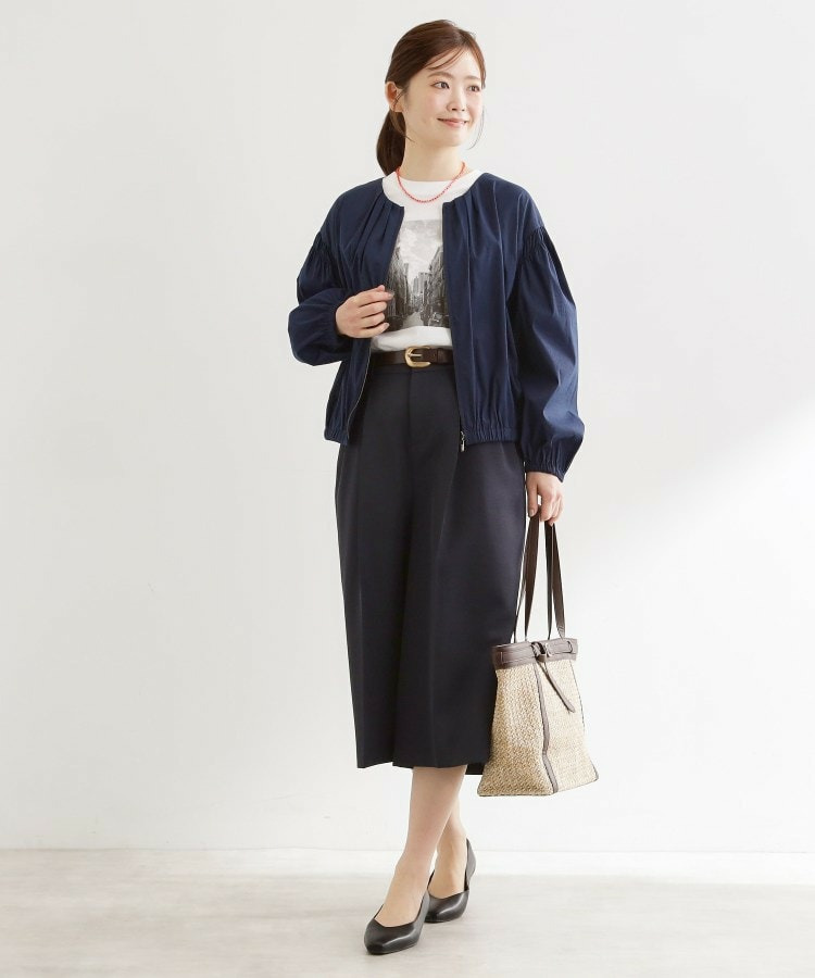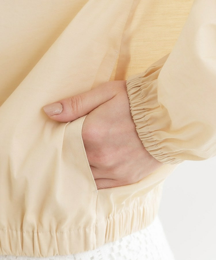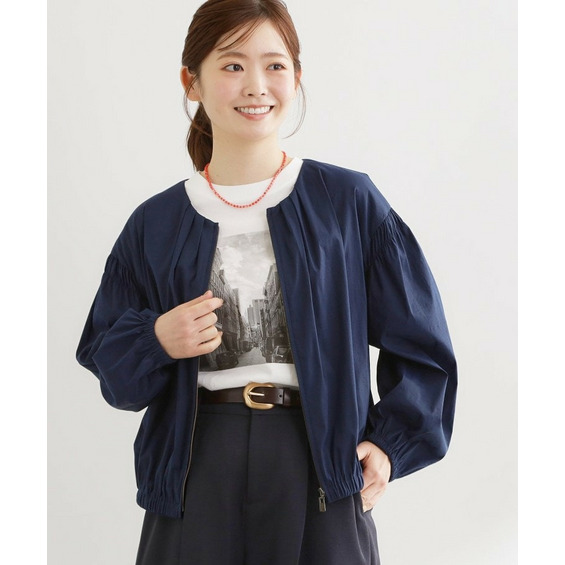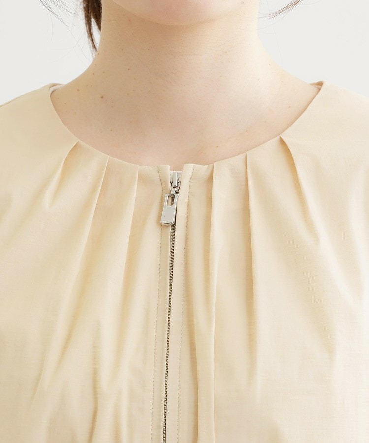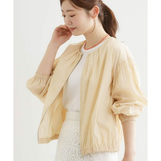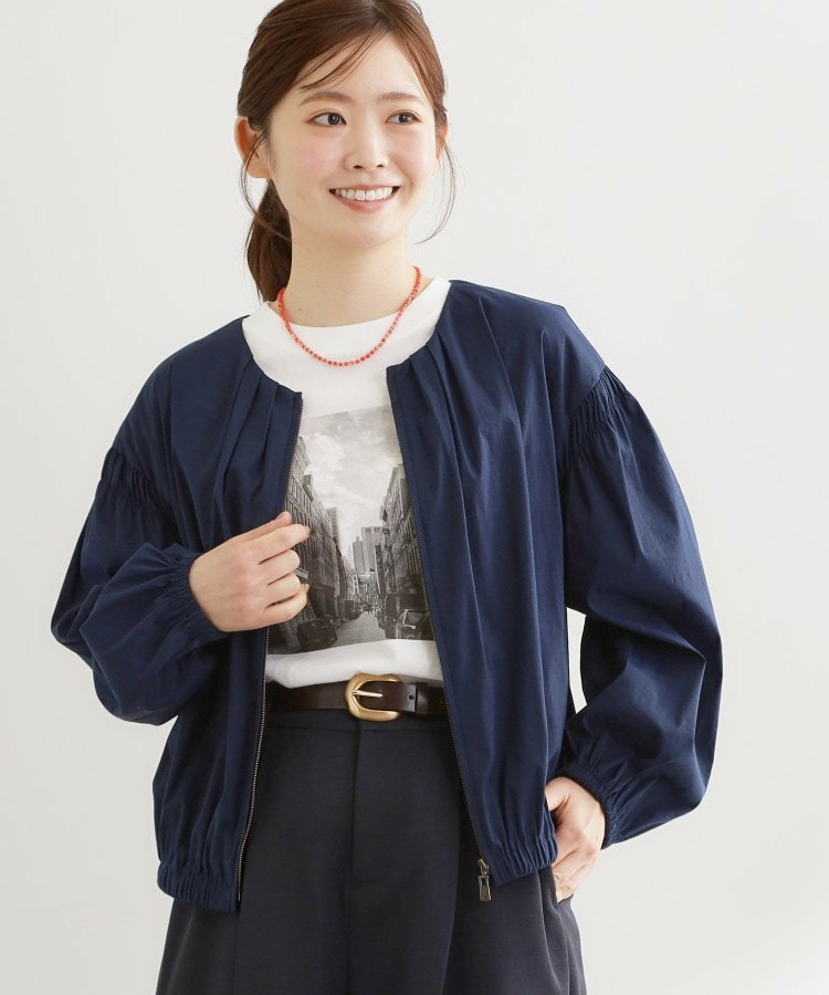 前開きはジップ開きになり、衿ぐりにはタックを入れて動きを出し、袖口、裾にはゴム仕様で着心地の良さとすっきりとしたバランスを両立し、ギャザーで丸みのある立体的なシルエットに仕上げました。