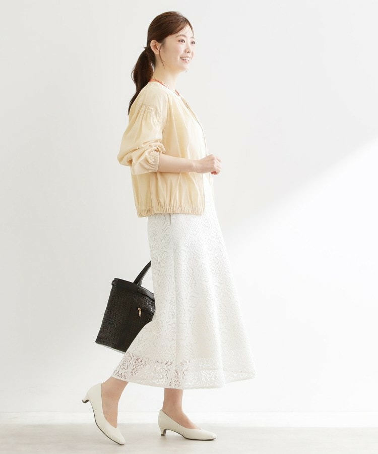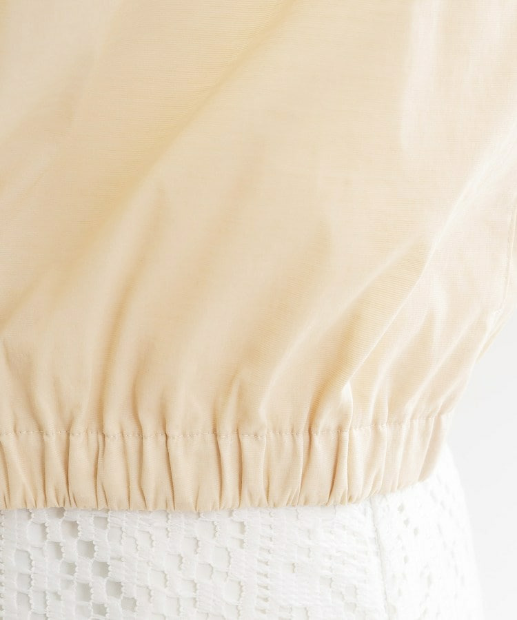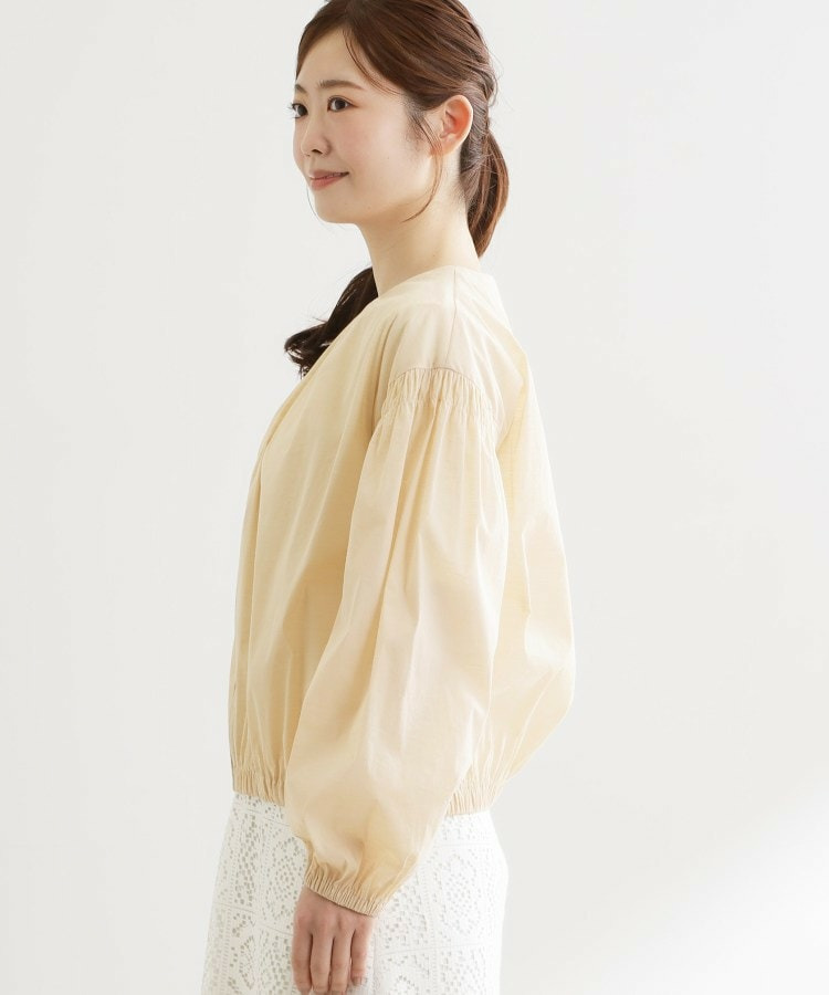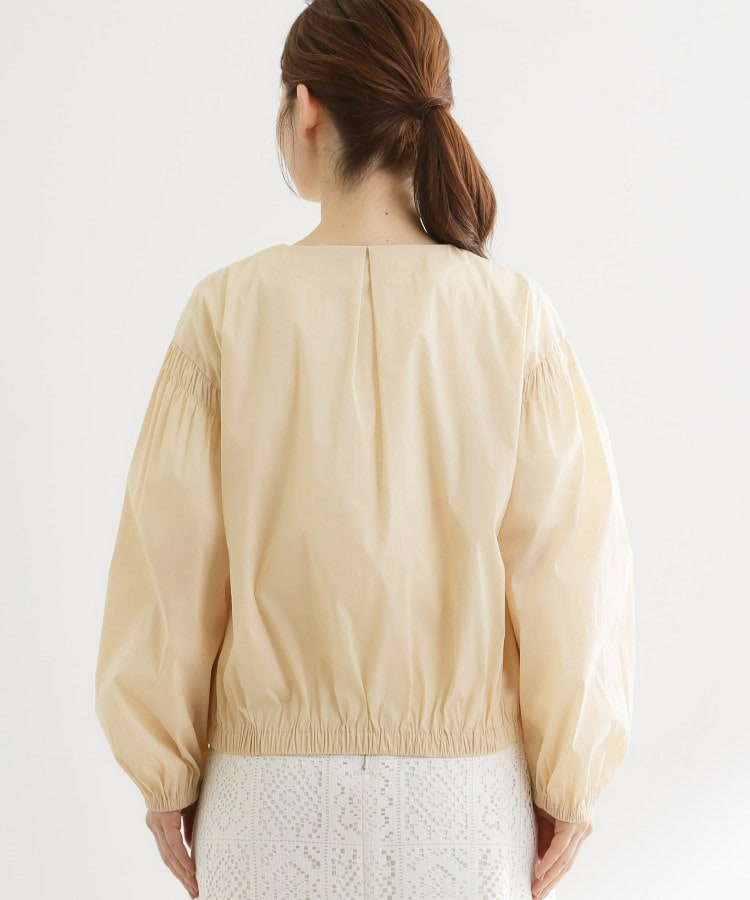 身頃と袖のつながり部分にはゴムヤーンを使用し、ギャザーを入れた仕様で立体感のあるフォルムを演出してくれます。