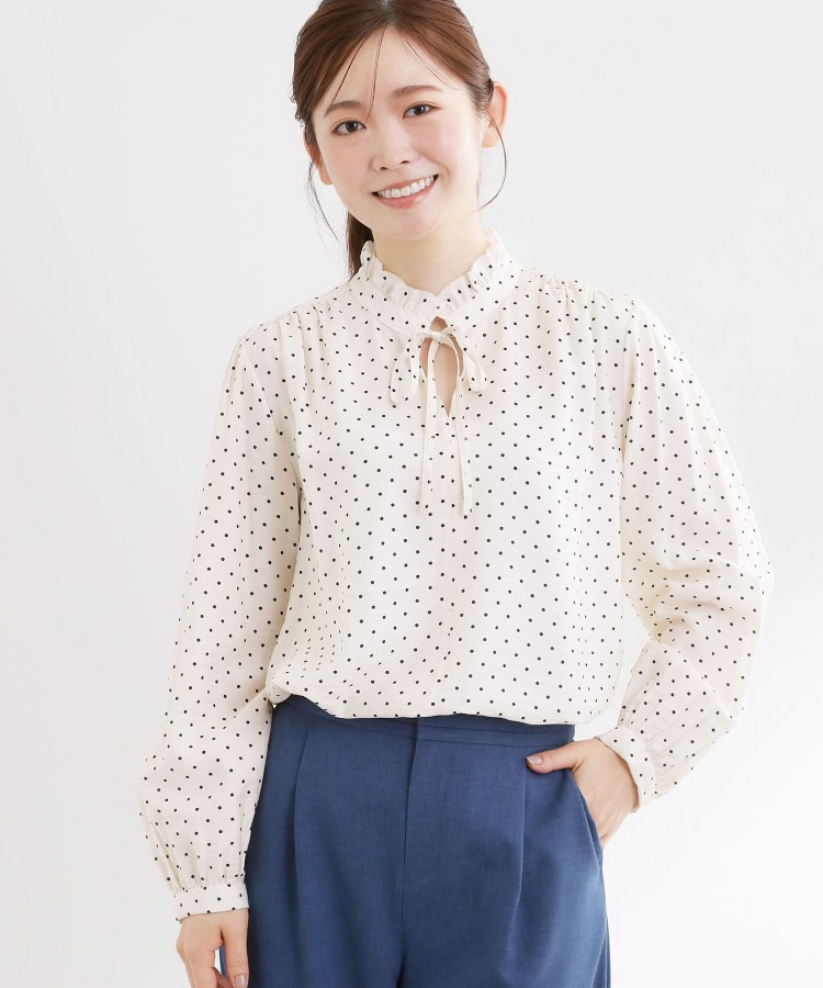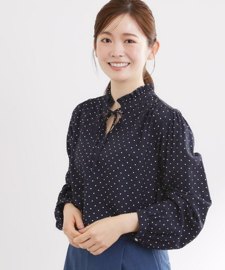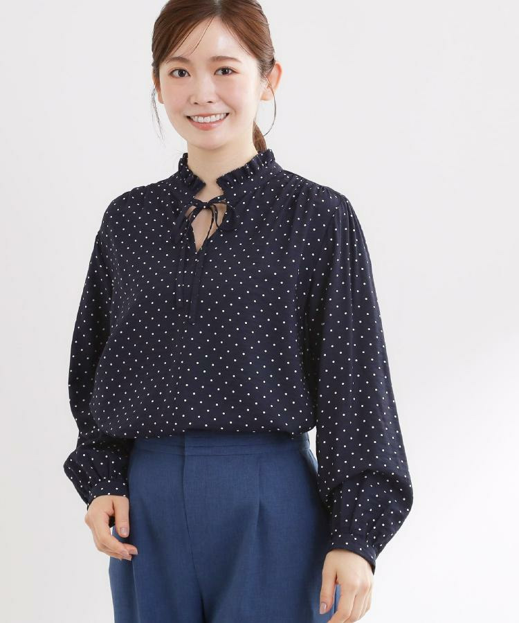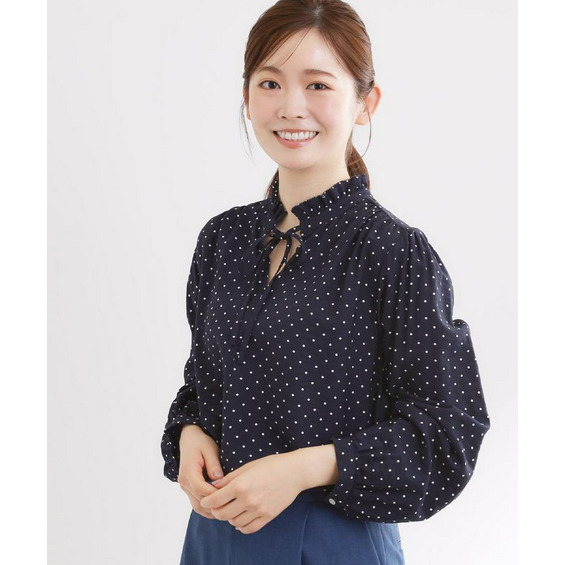 ドット柄の長袖丈ブラウス。