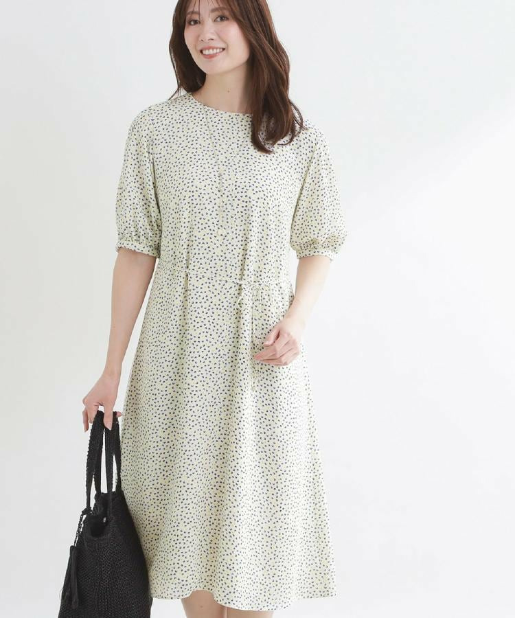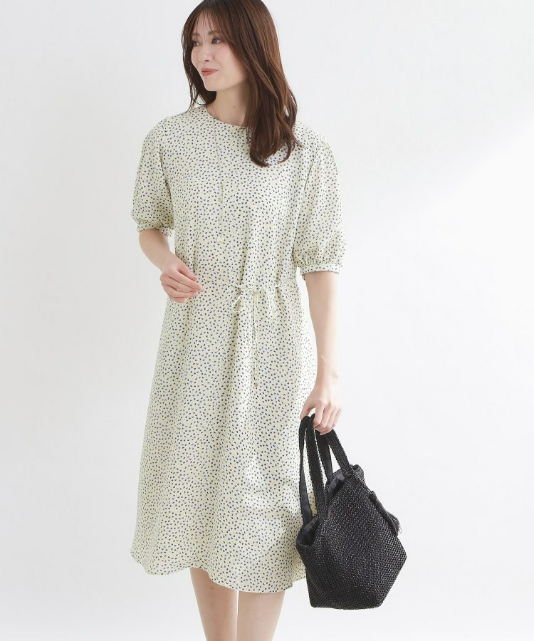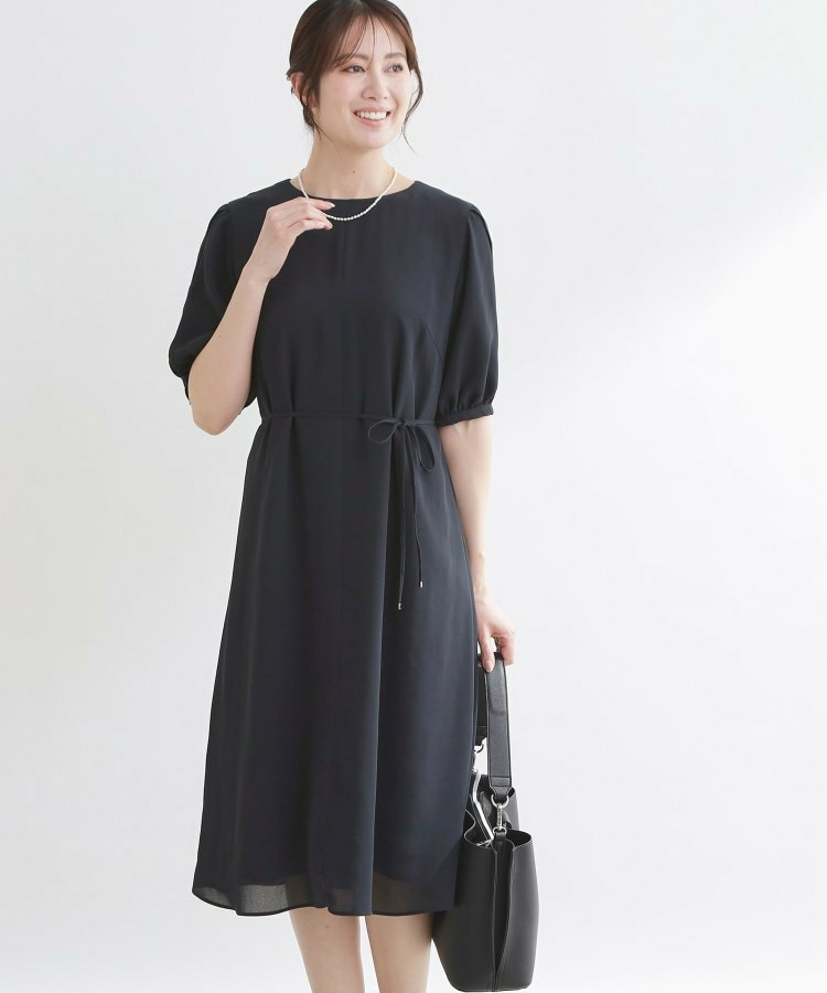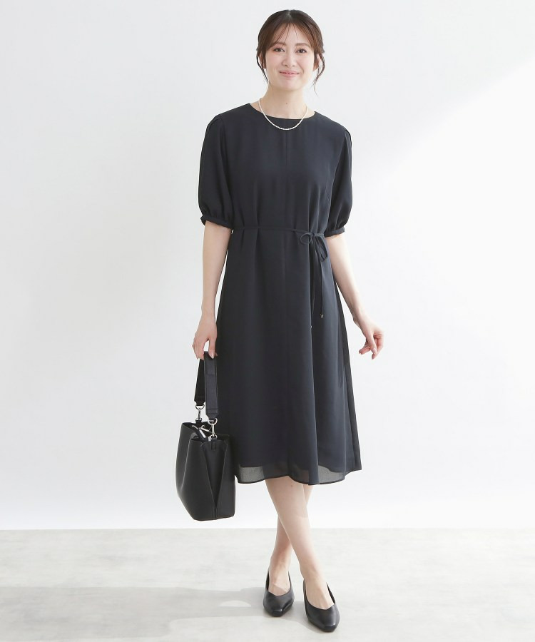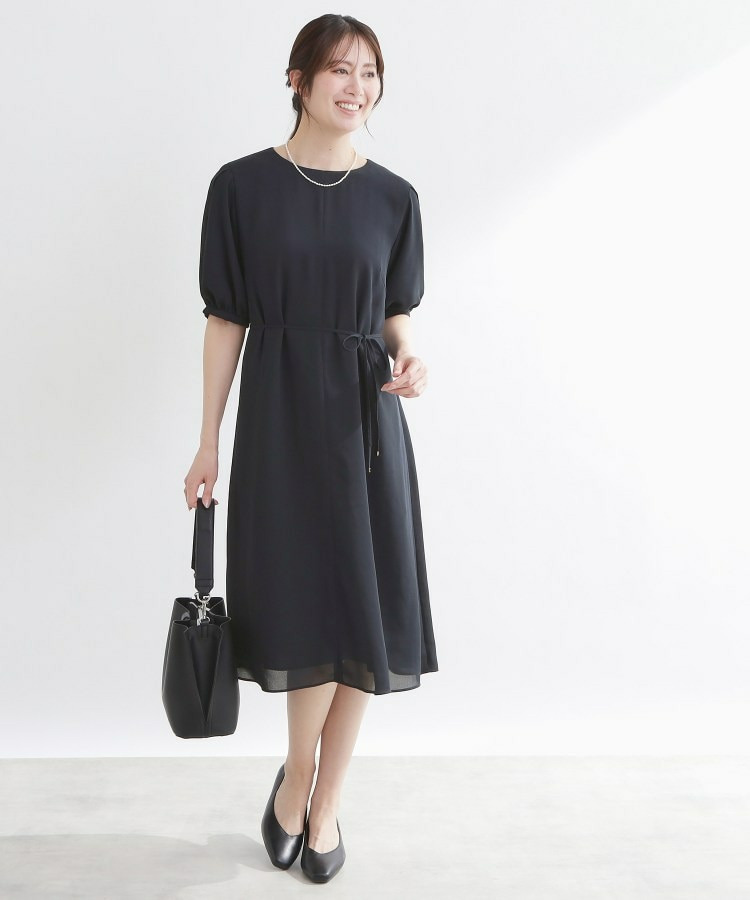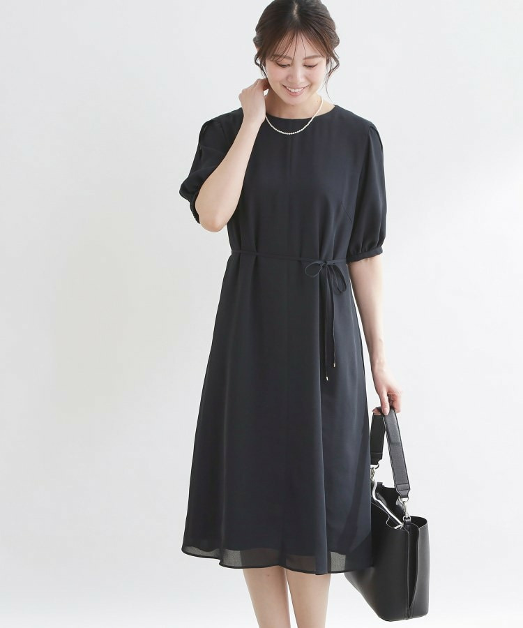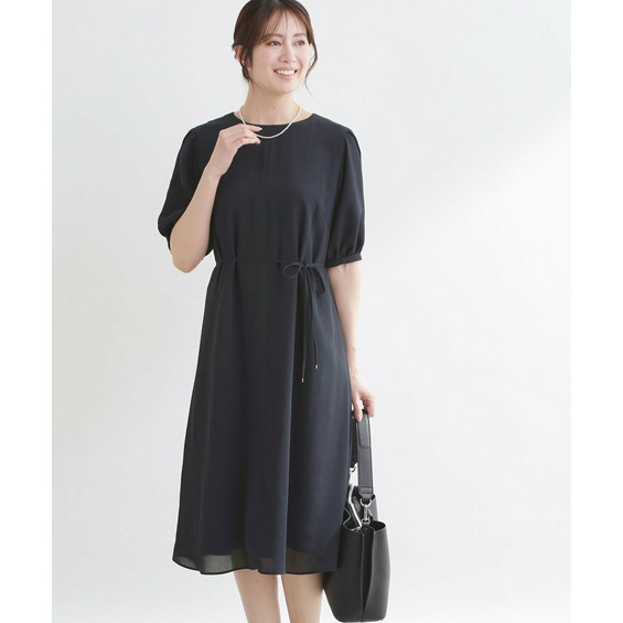 ウエスト位置には共地リボン付きで、結び方次第でシルエットのアレンジが可能です。