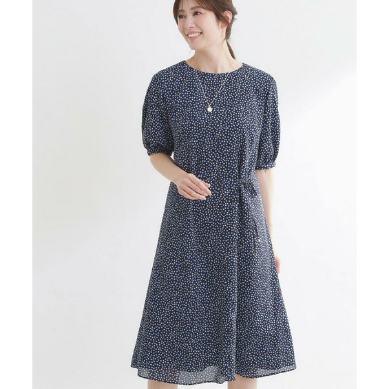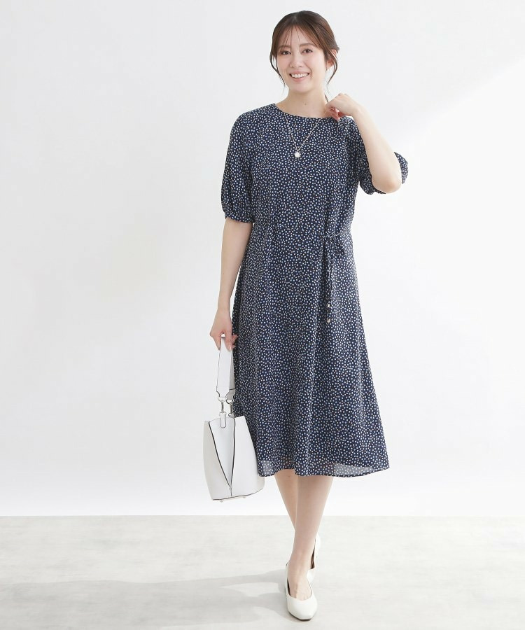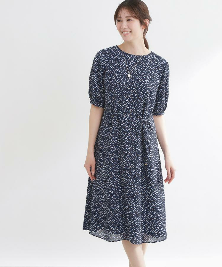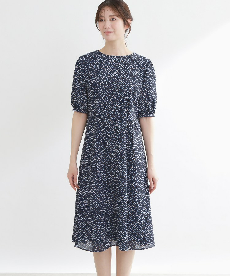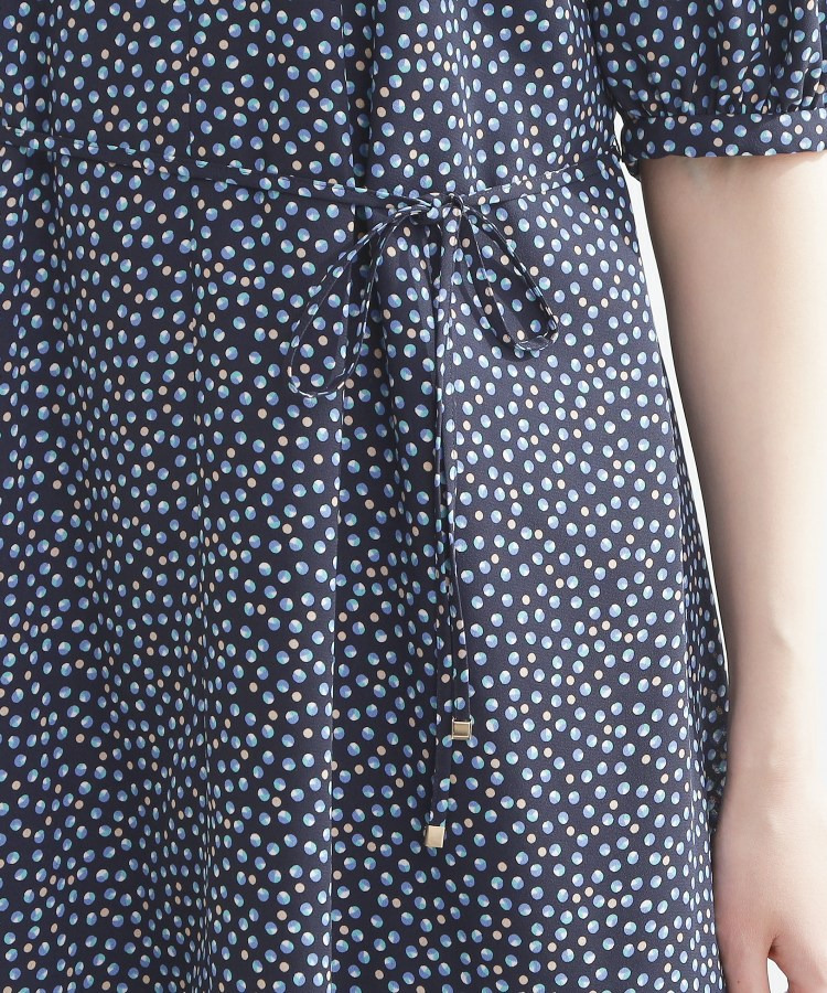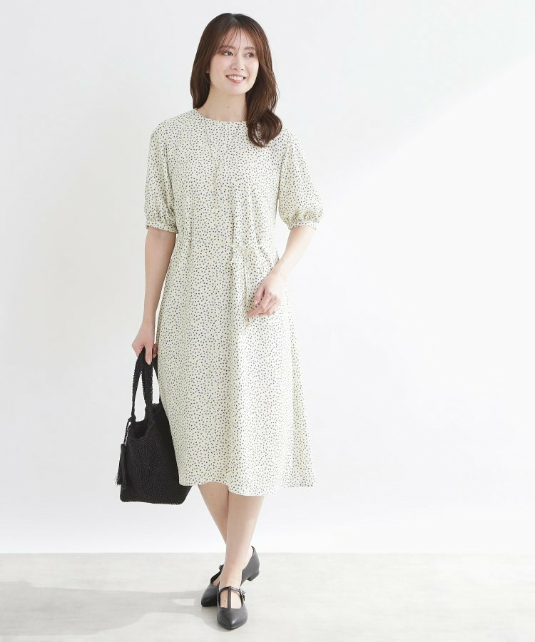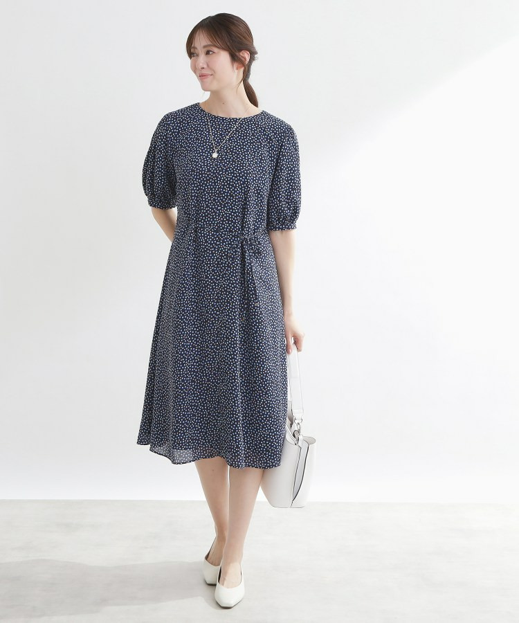ウエスト位置には共地リボン付きで、結び方次第でシルエットのアレンジが可能です。