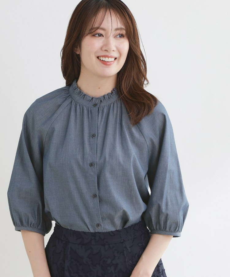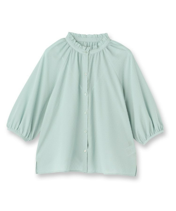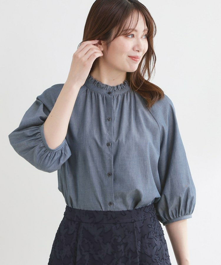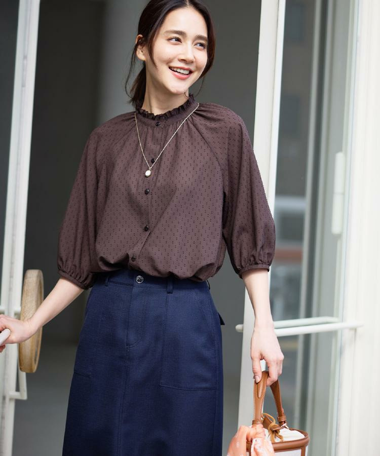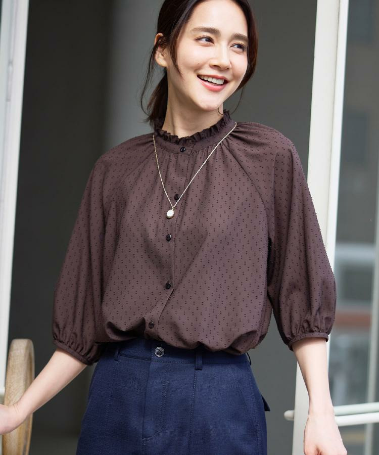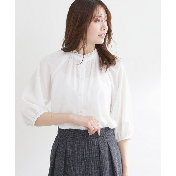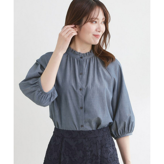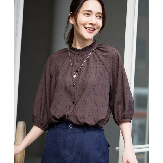 衿ぐりにたっぷりとギャザーを寄せた、華やかな印象のブラウス。