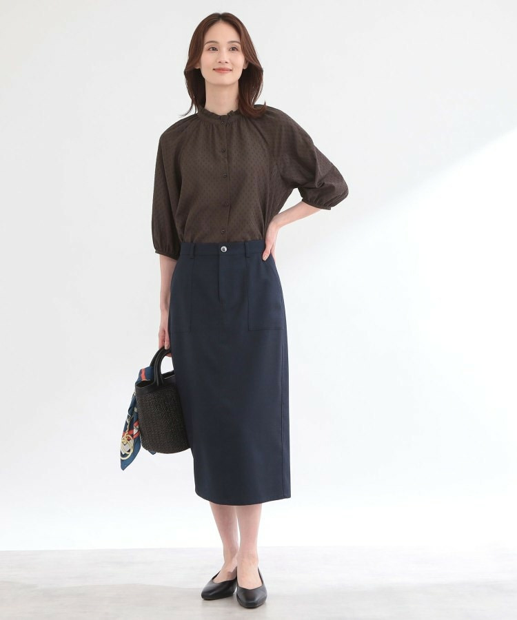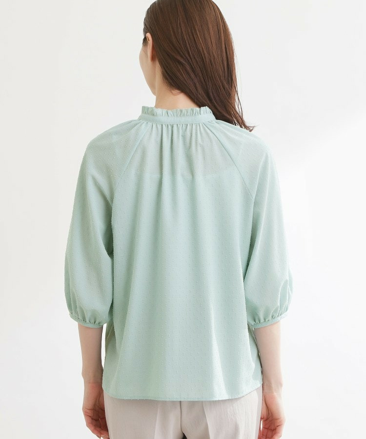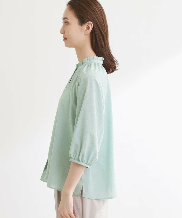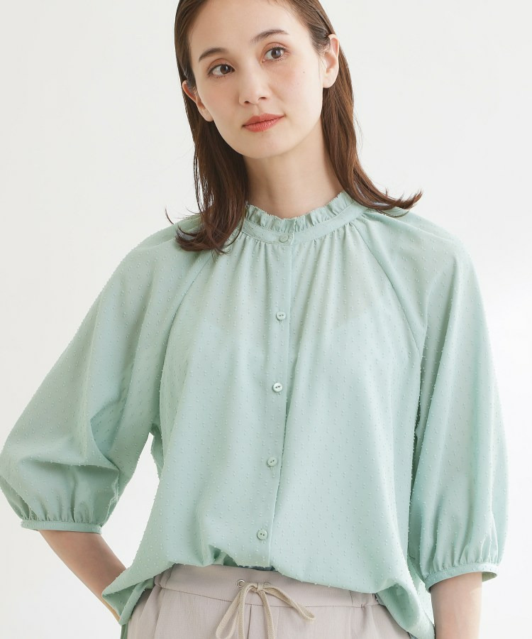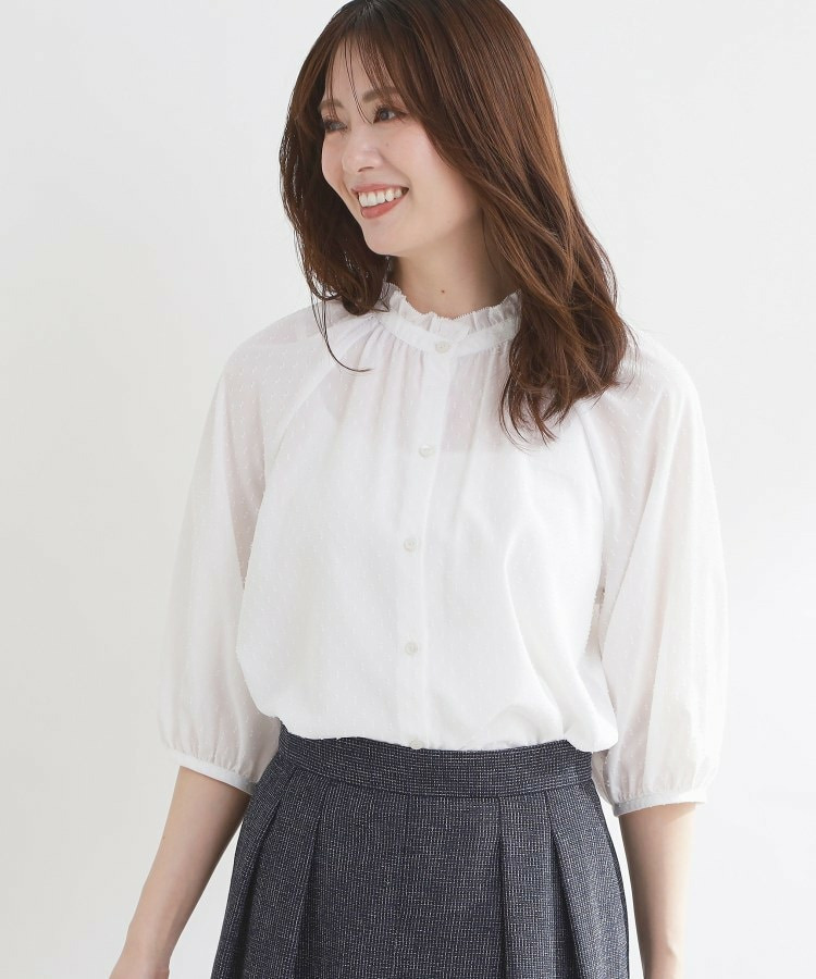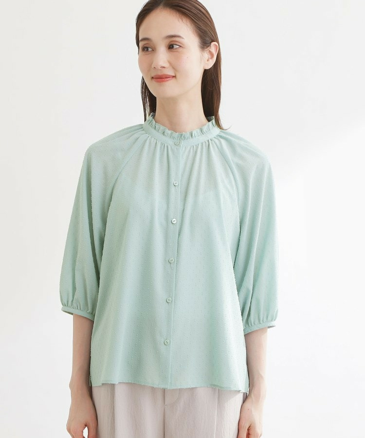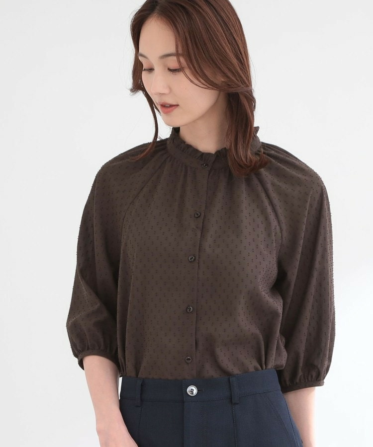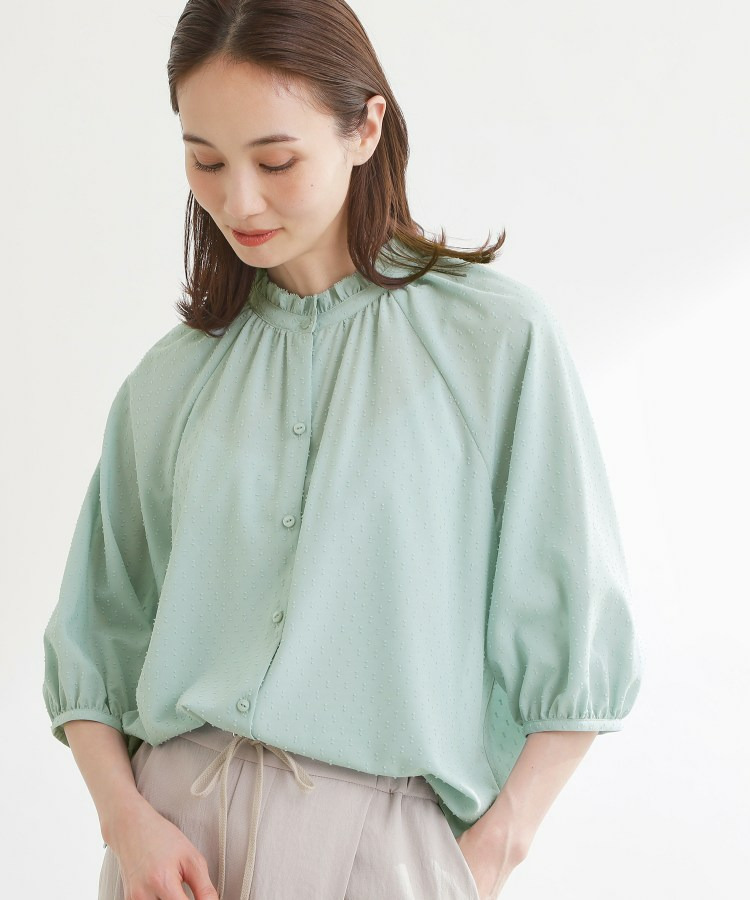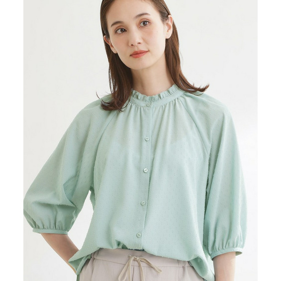 フロントはボタン開きで着脱しやすくきちんと感のある印象にし、ふんわりとした袖のボリューム感が女性らしくシンプルながらも着映えする一枚です。