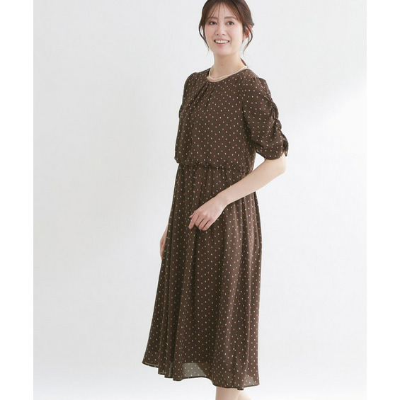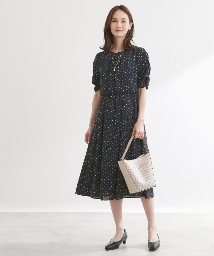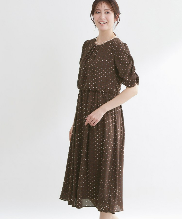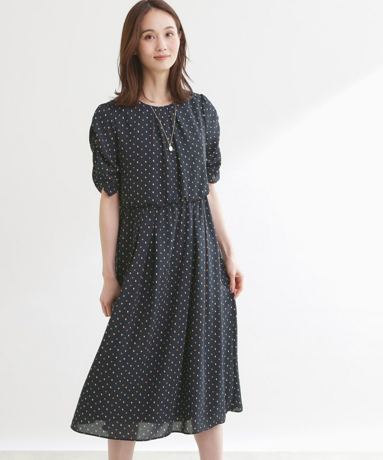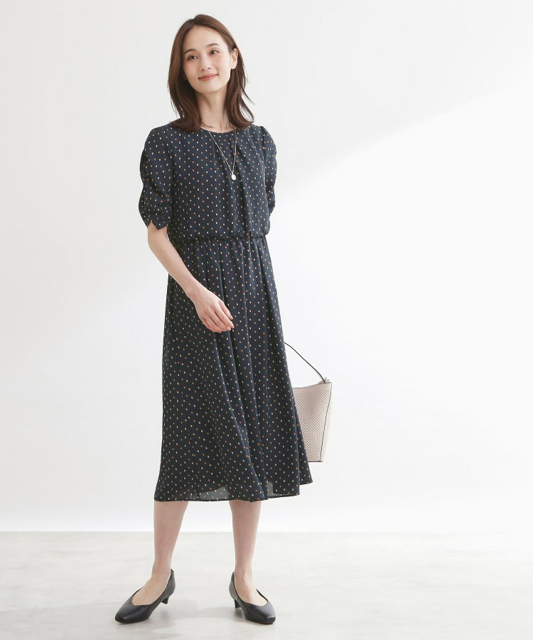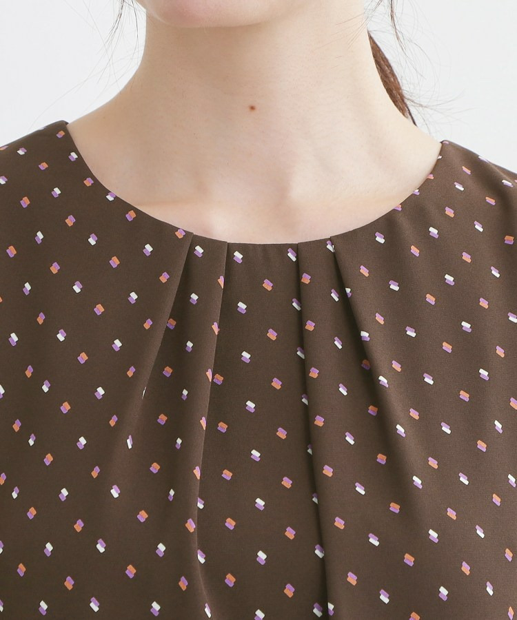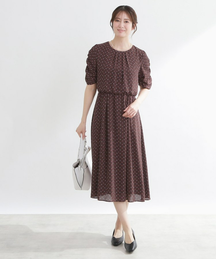 首元のタックが上品なアクセントになり、ウエスト切替でメリハリのあるシルエットに仕上げました。