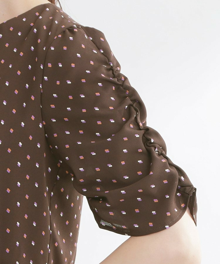 袖山の縫い代に細巾のゴムをたたきつけてギャザーを寄せ、袖下側にもタックを入れた変形袖になっており、袖山のギャザーがふんわりとした立体感を生み、女性らしい柔らかな印象に仕上げました。