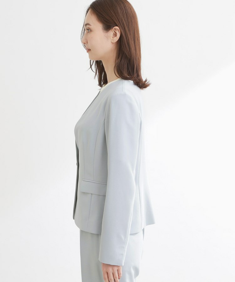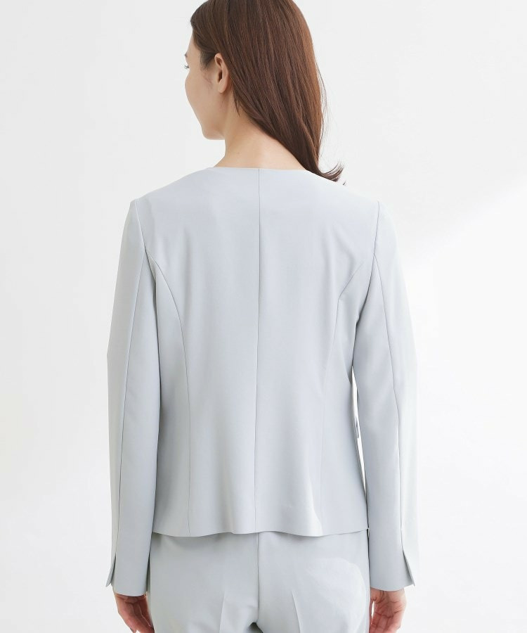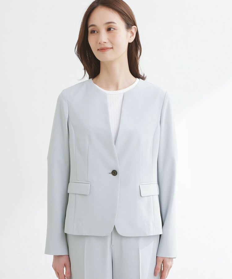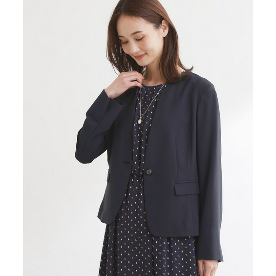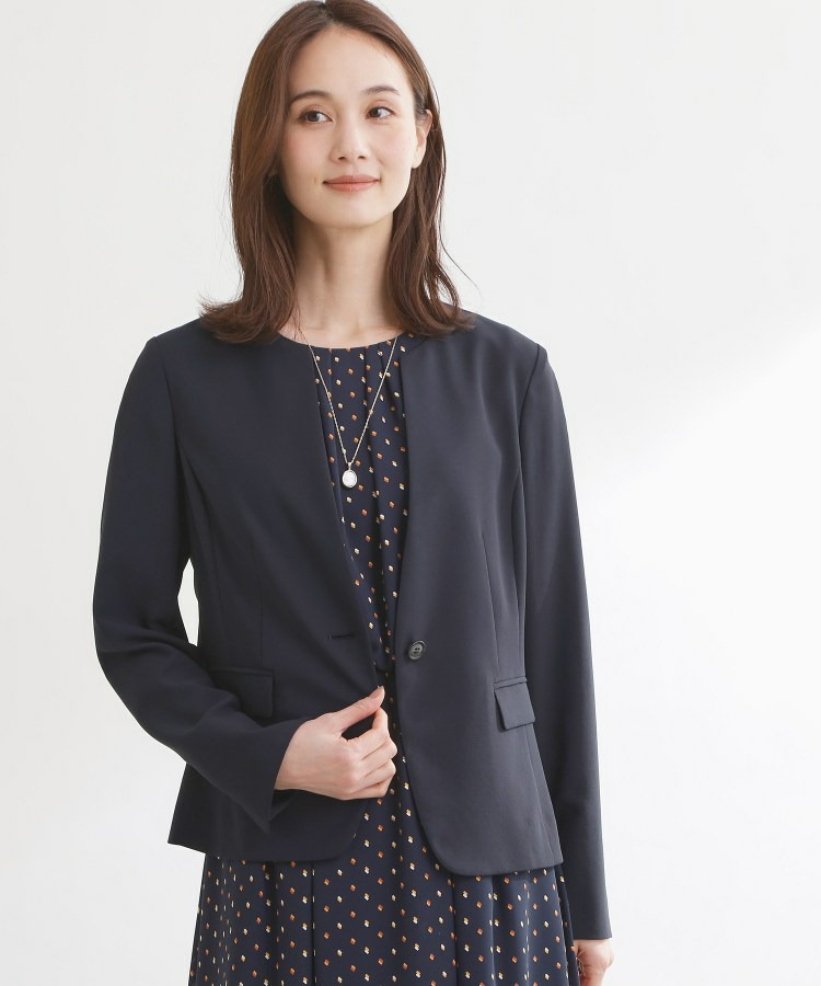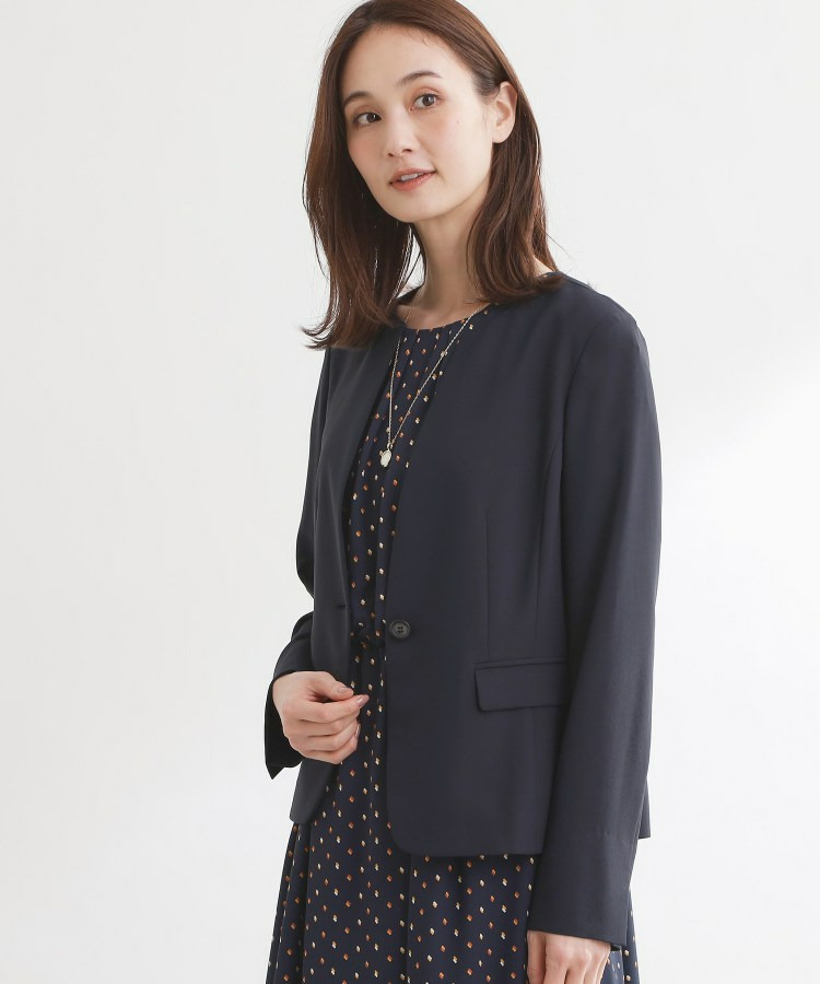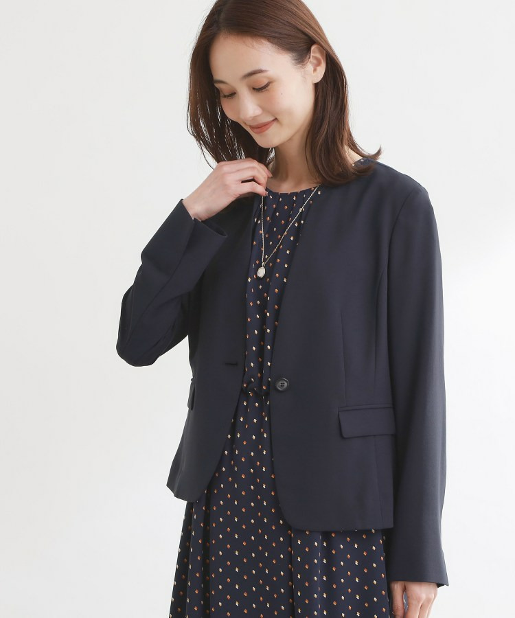シワになりにくい合繊素材のツイル生地を使用し、きちんと感のあるシルエットでおつくりしたノーカラージャケット。
