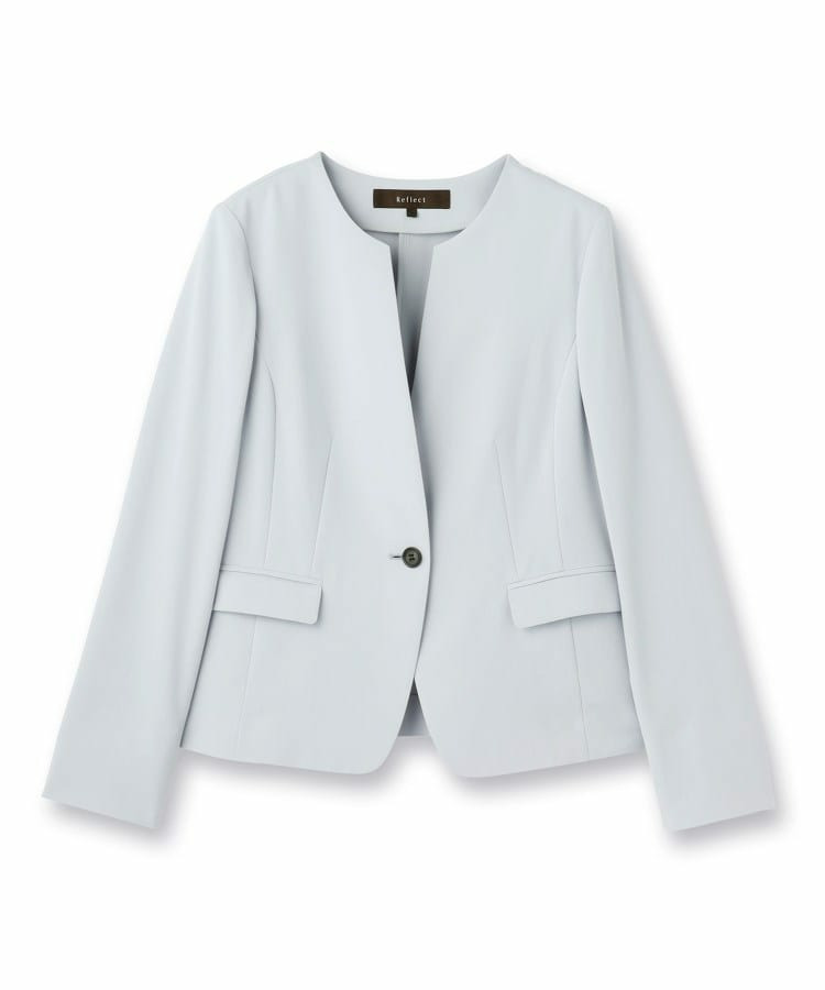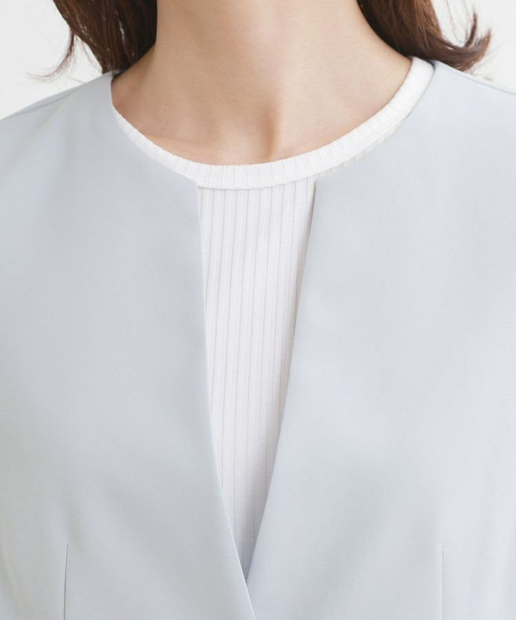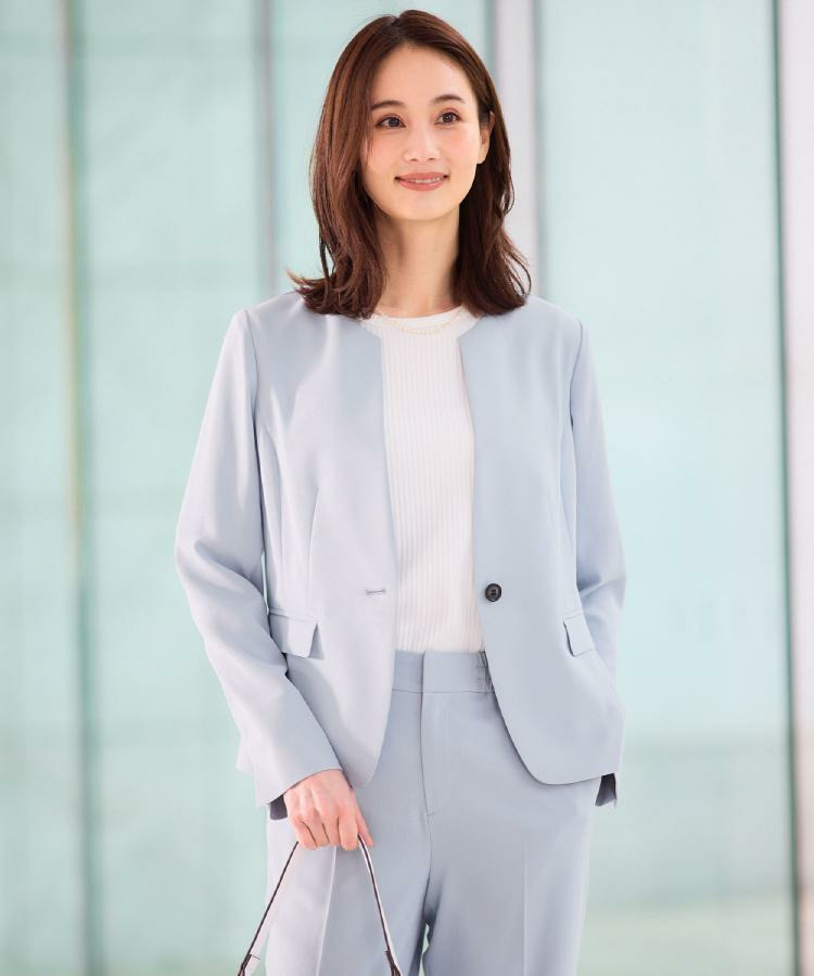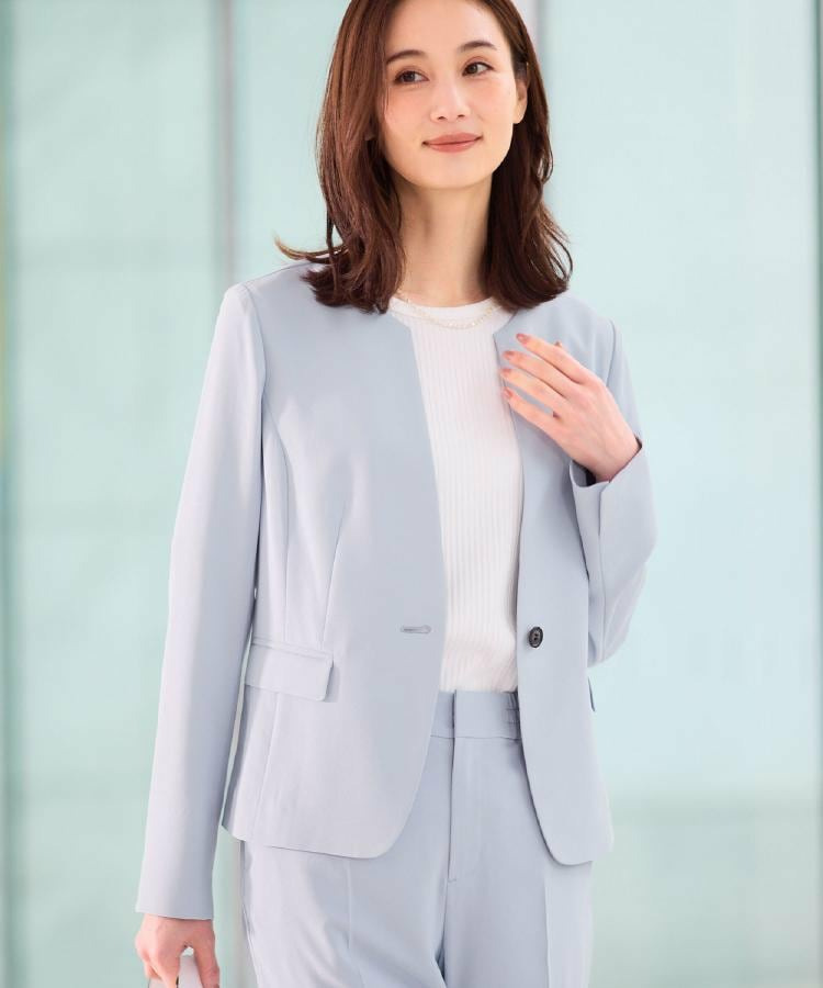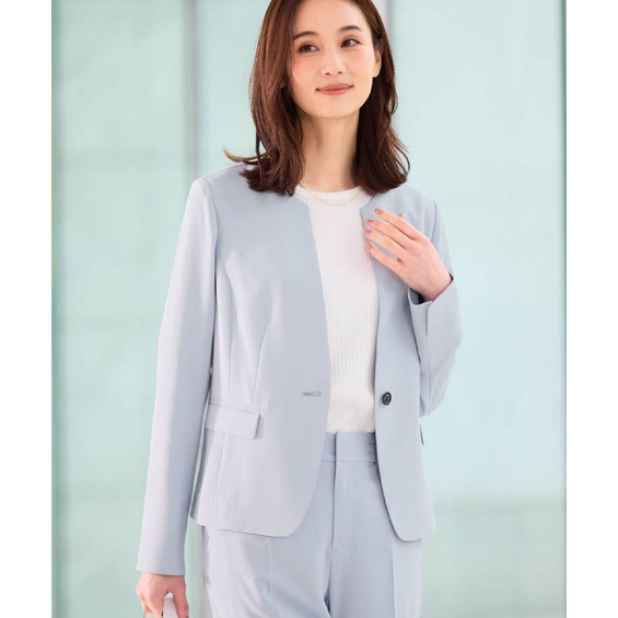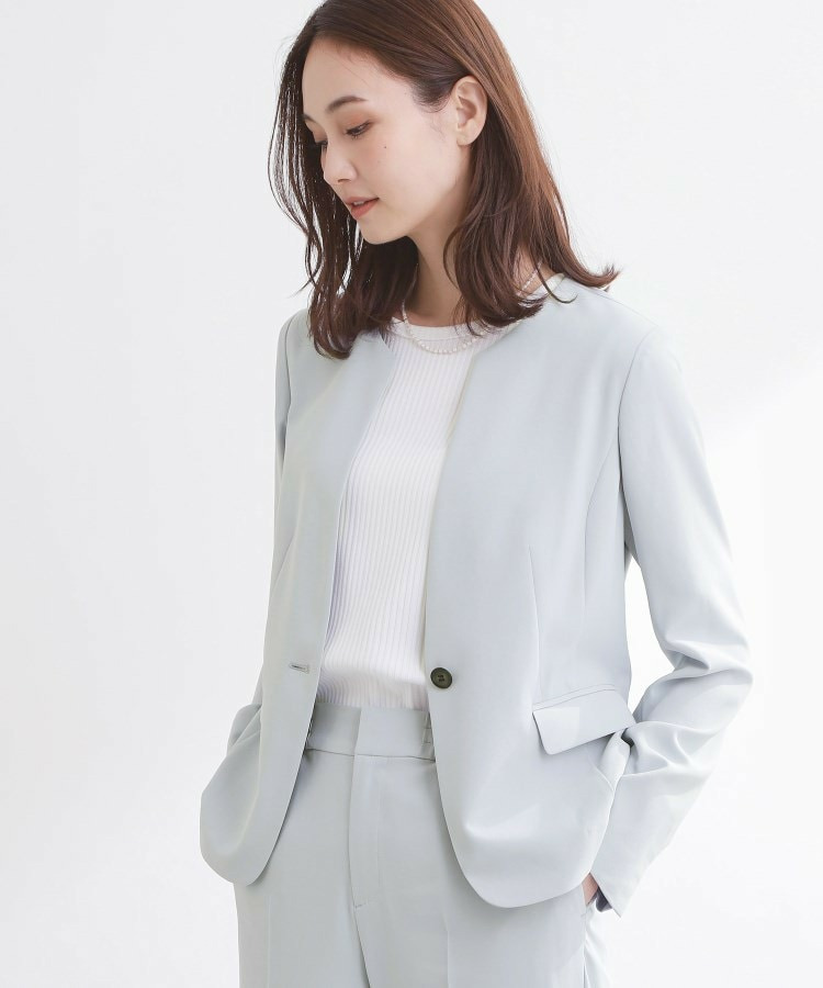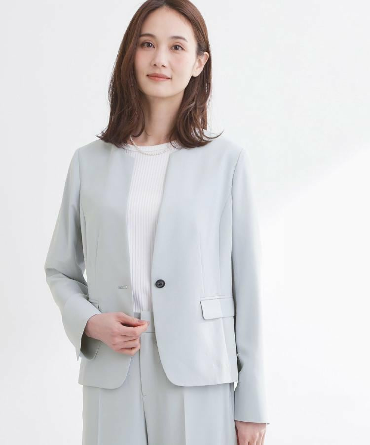 シワになりにくい合繊素材のツイル生地を使用し、きちんと感のあるシルエットでおつくりしたノーカラージャケット。