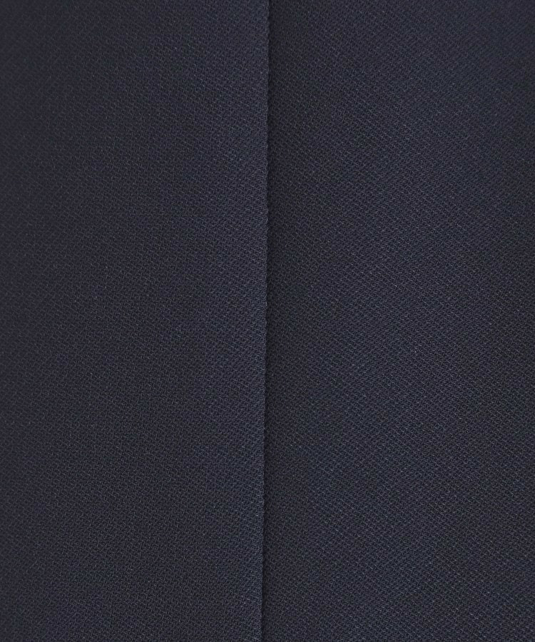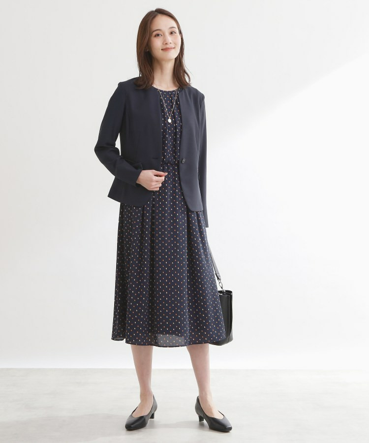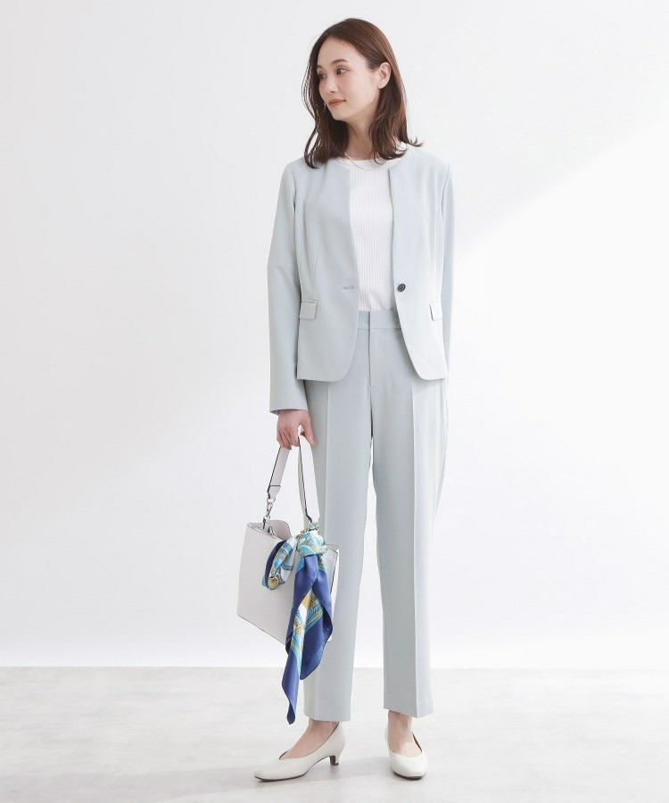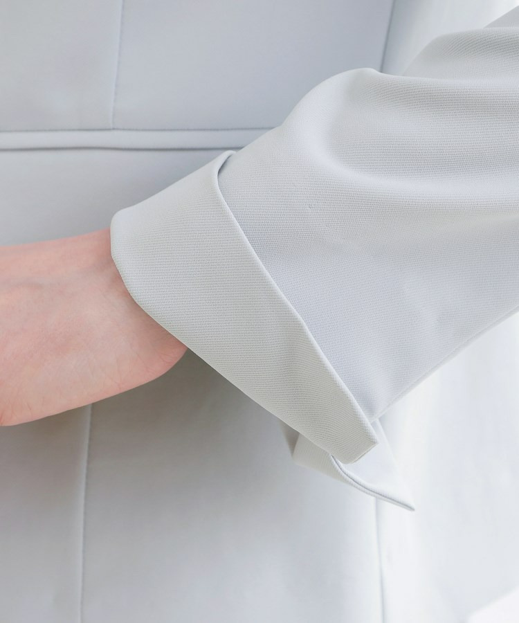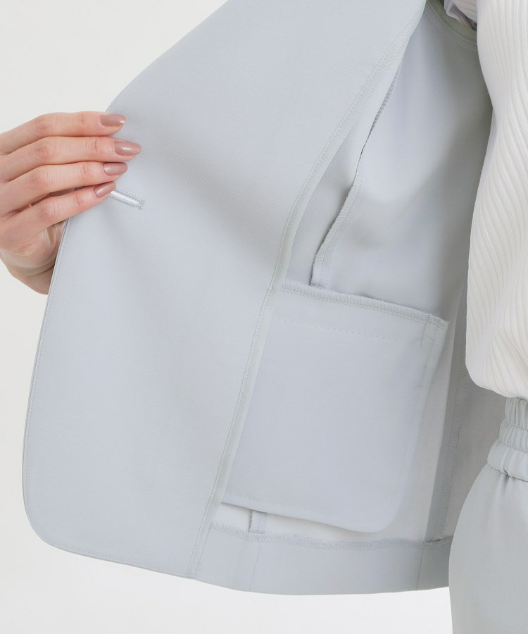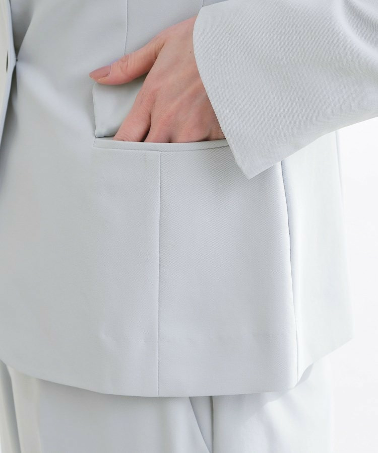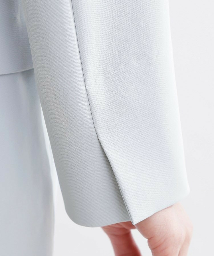 シワになりにくい合繊素材のツイル生地を使用し、きちんと感のあるシルエットでおつくりしたノーカラージャケット。