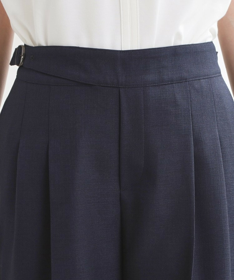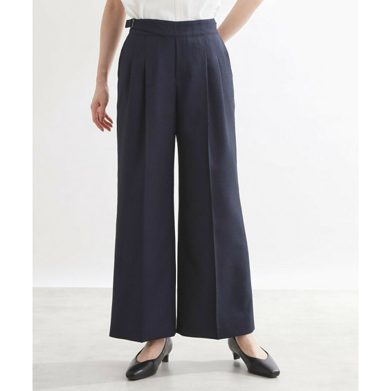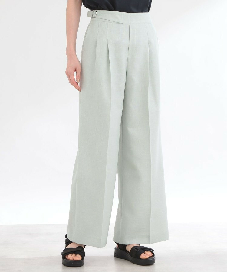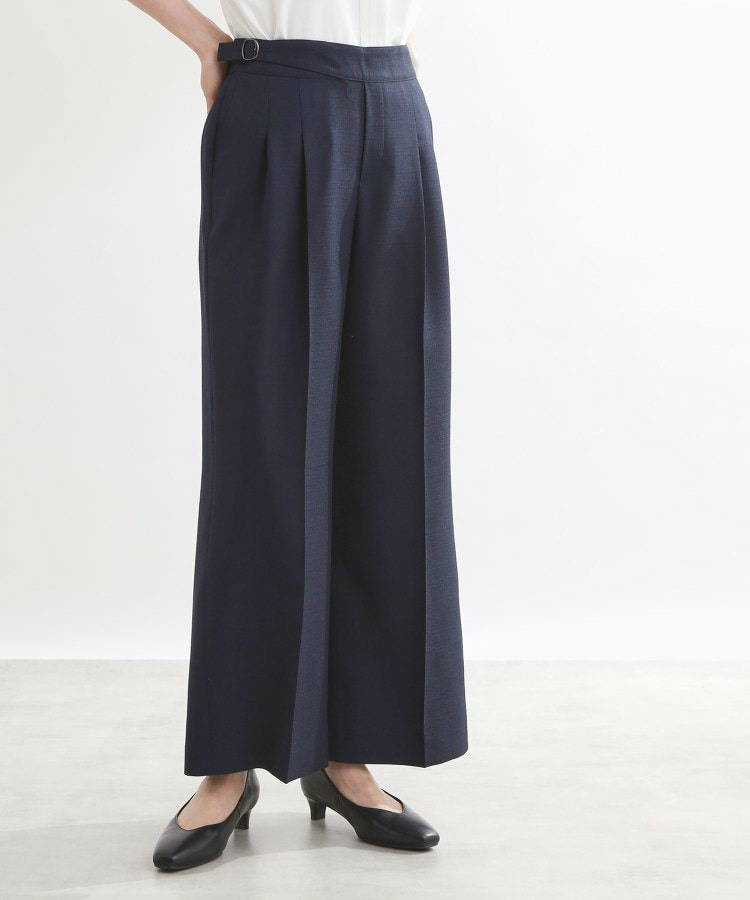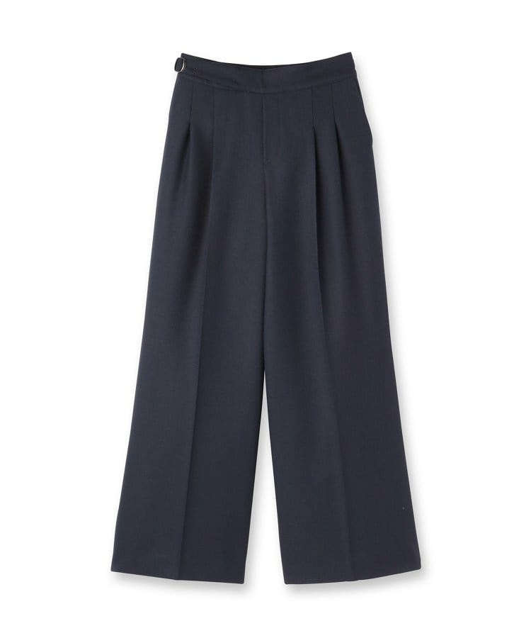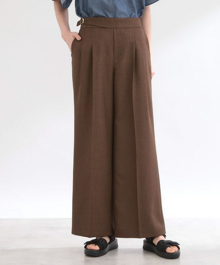 ウエストのグルカ風ベルトデザインがアクセントになったワイドパンツ。