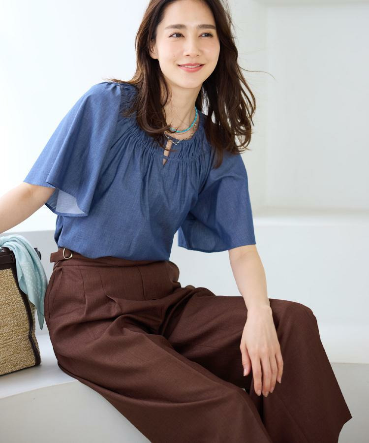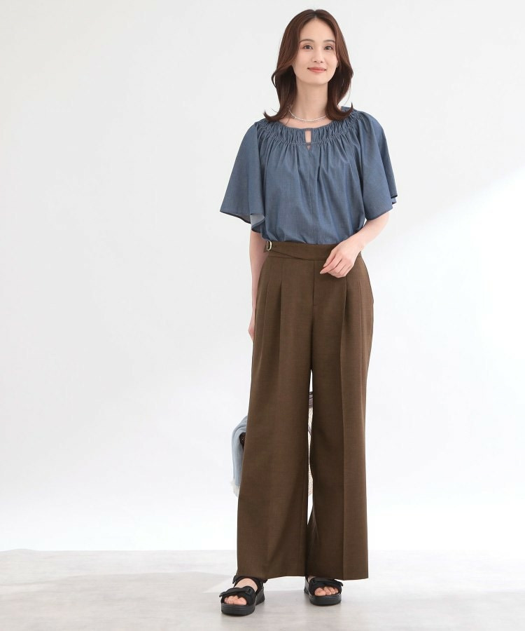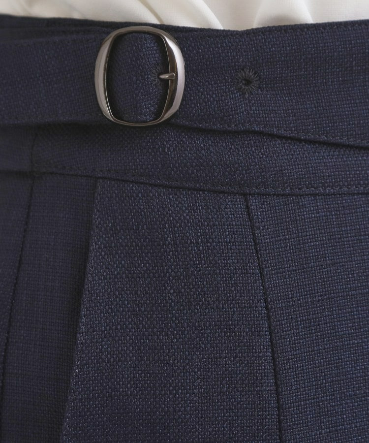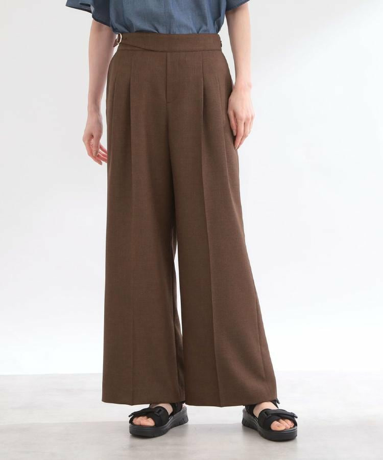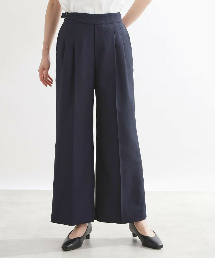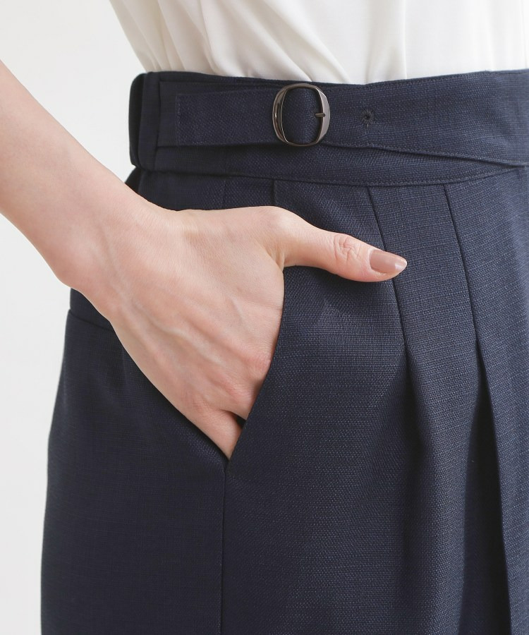 ウエストのグルカ風ベルトデザインがアクセントになったワイドパンツ。