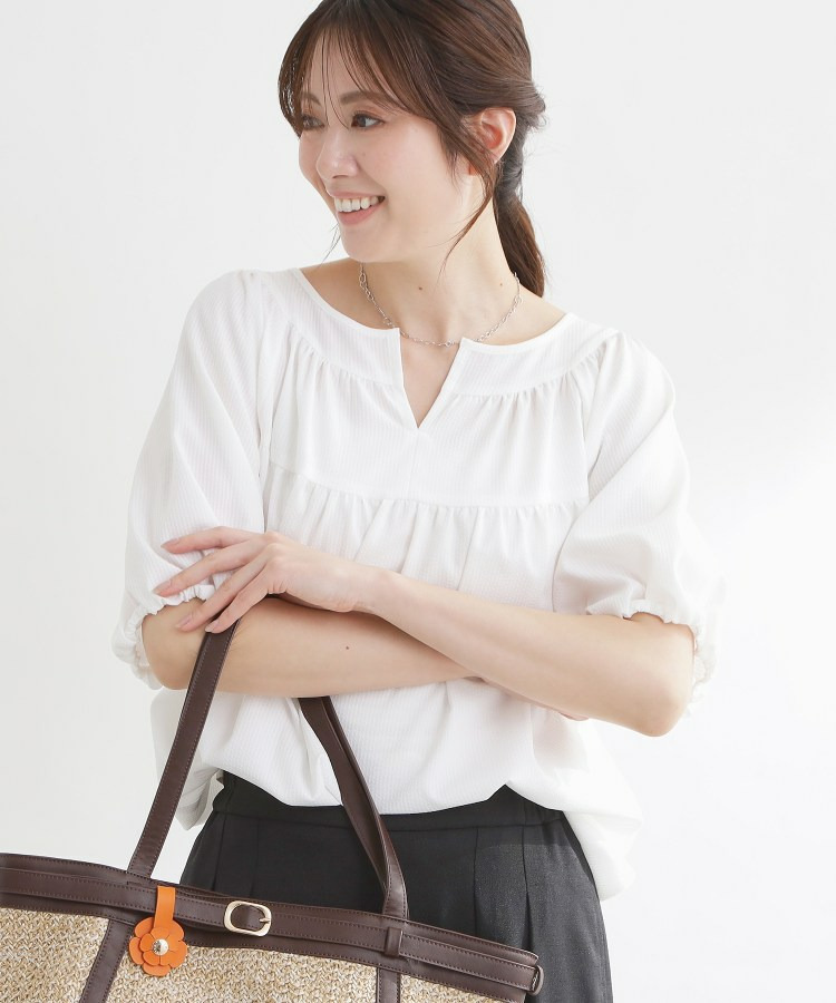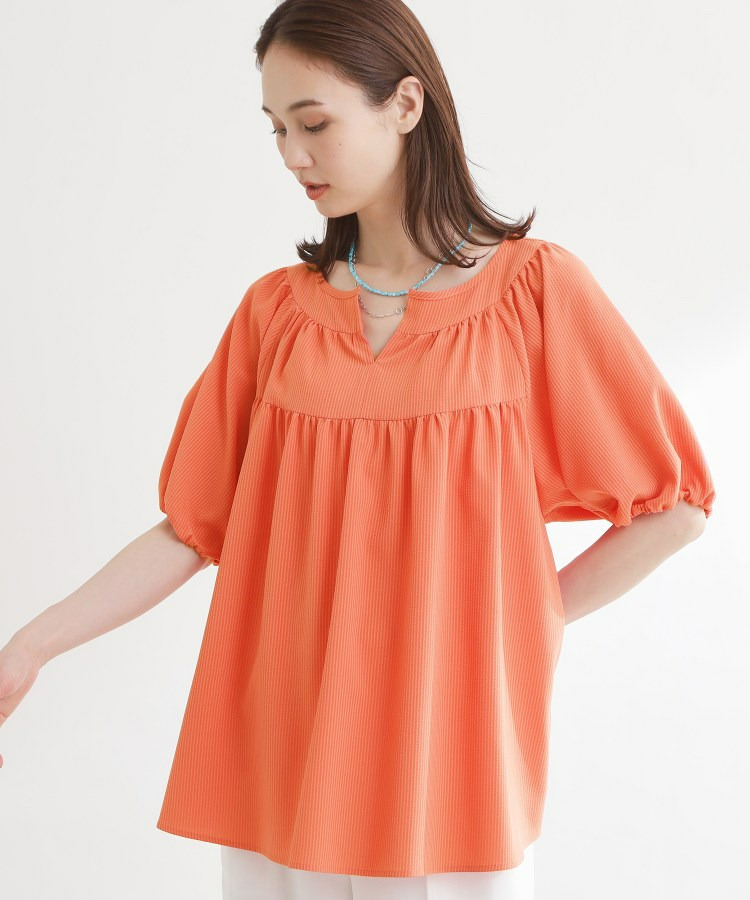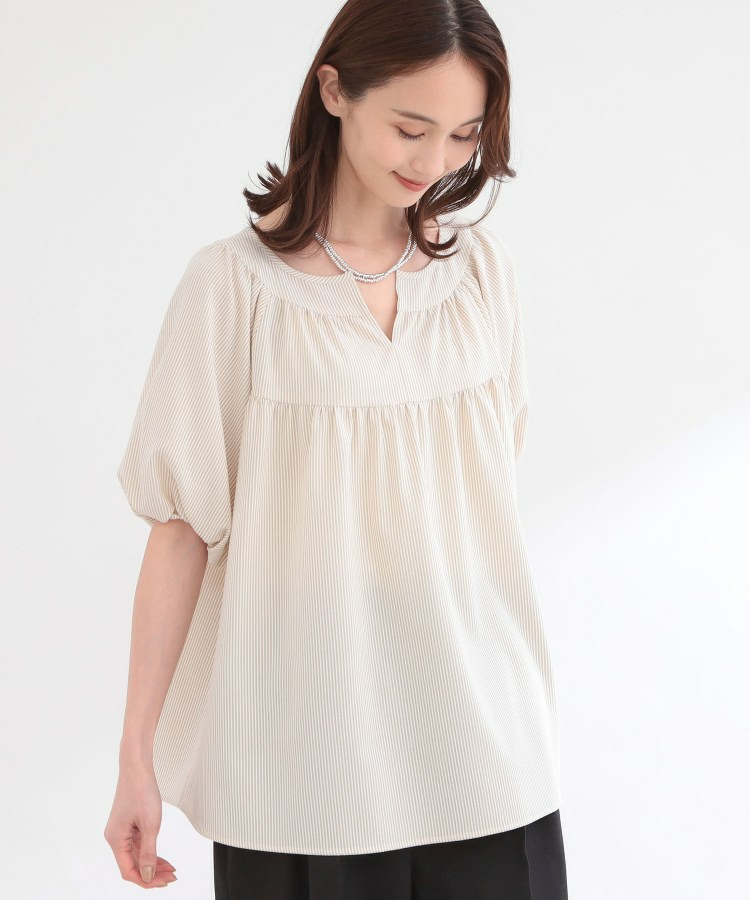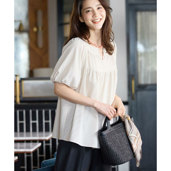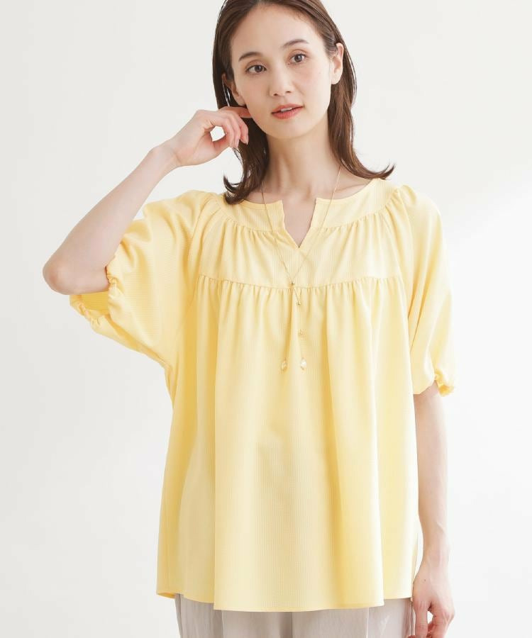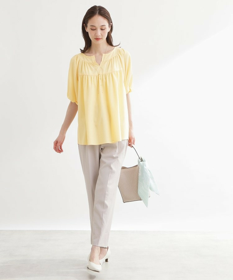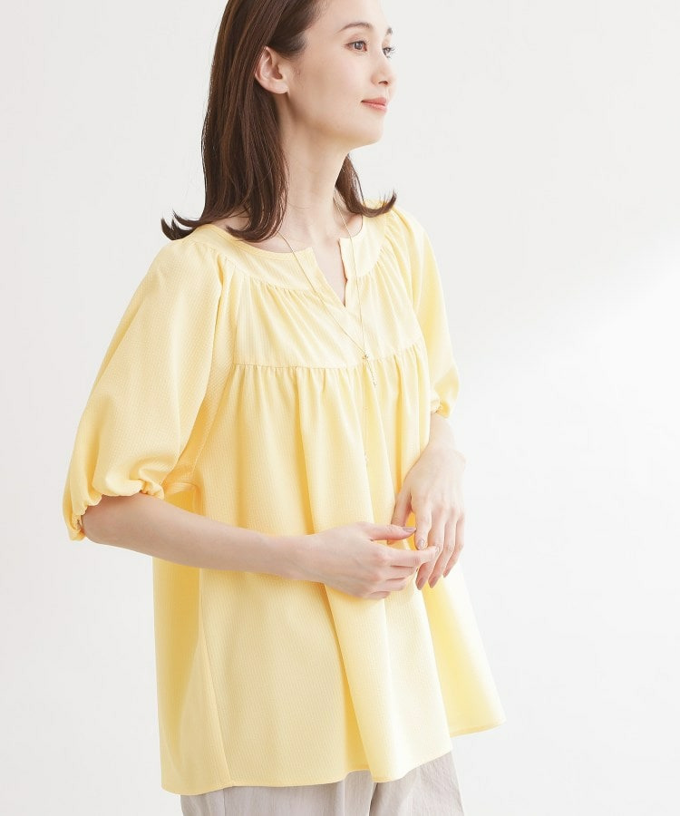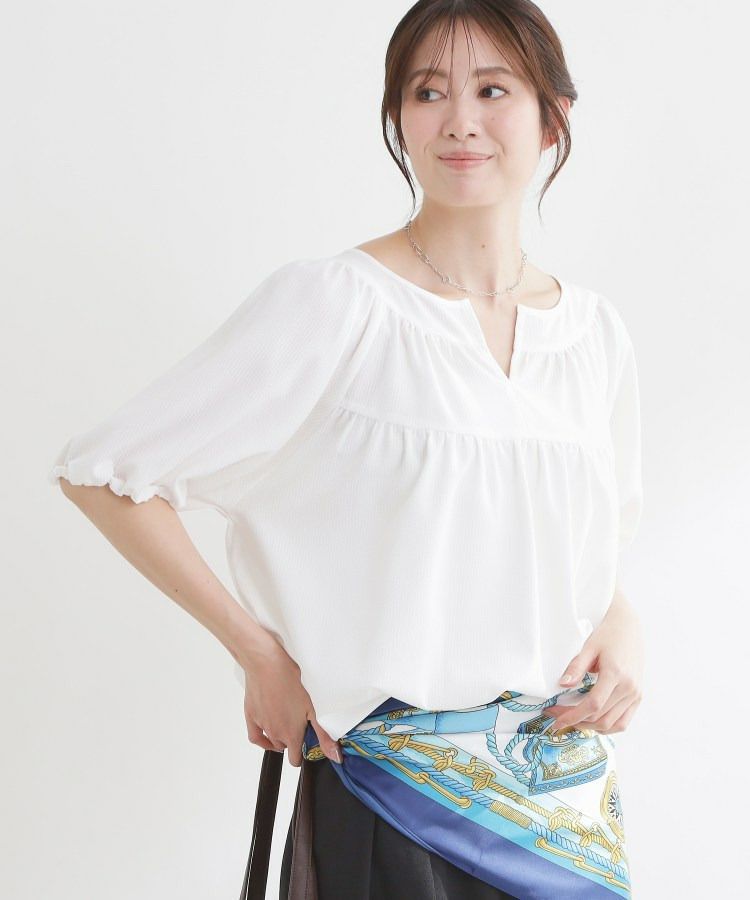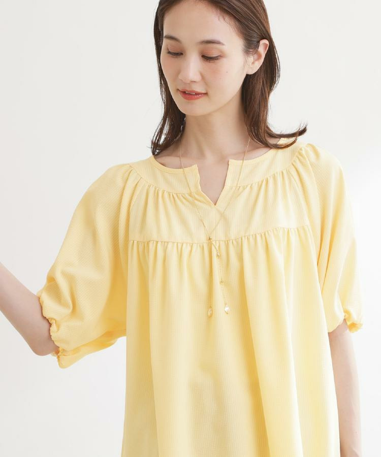 ネックとヨーク部分に細やかなギャザーをたっぷり寄せたボリュームブラウス。