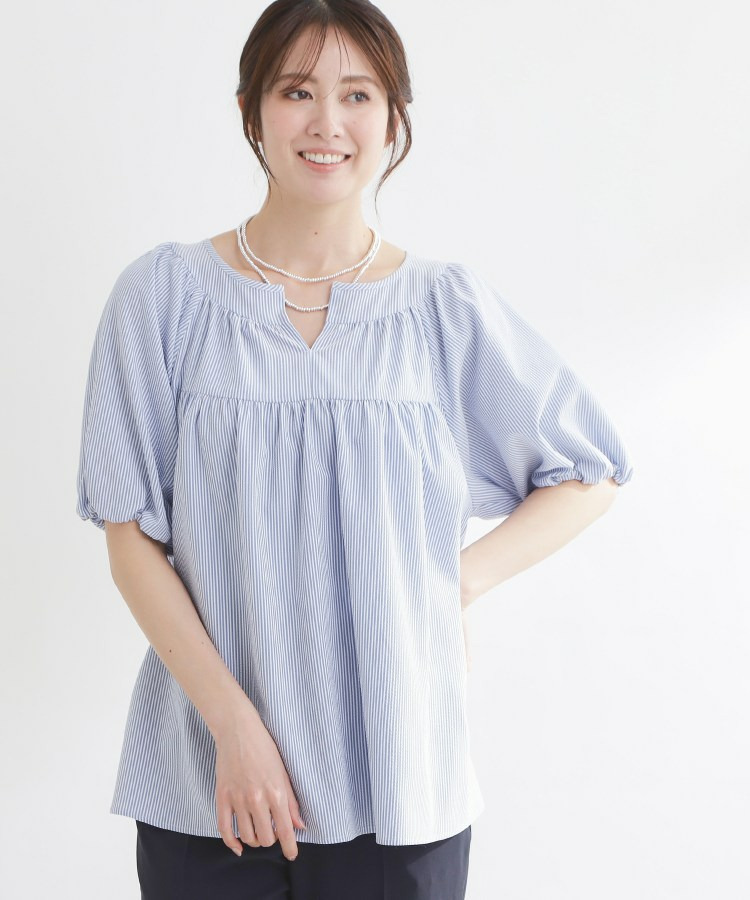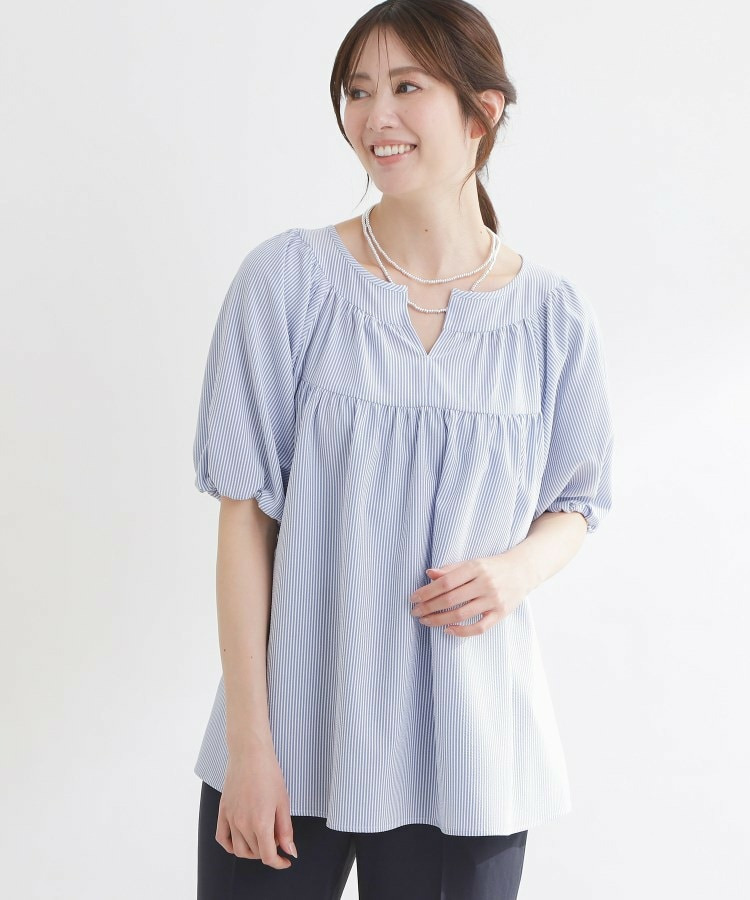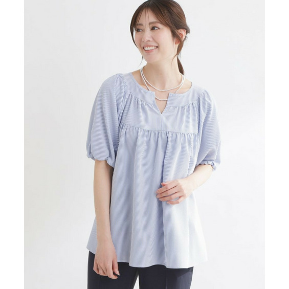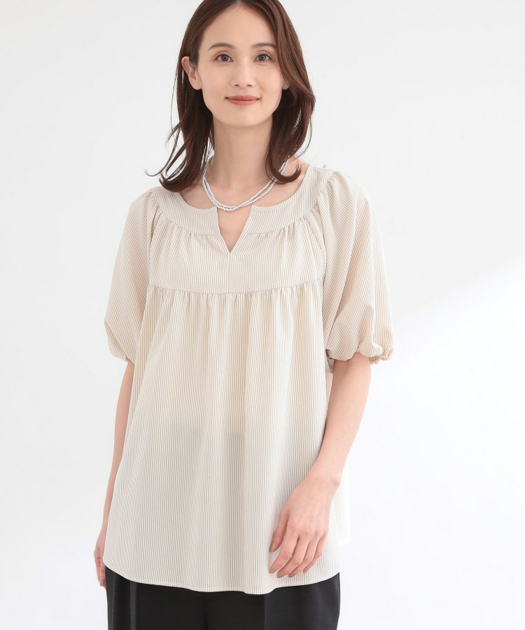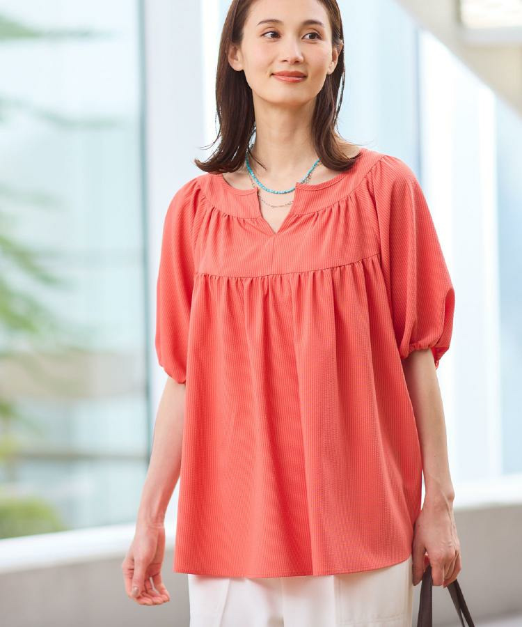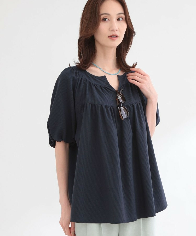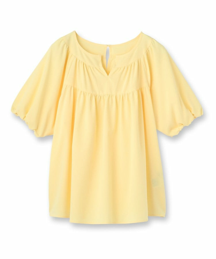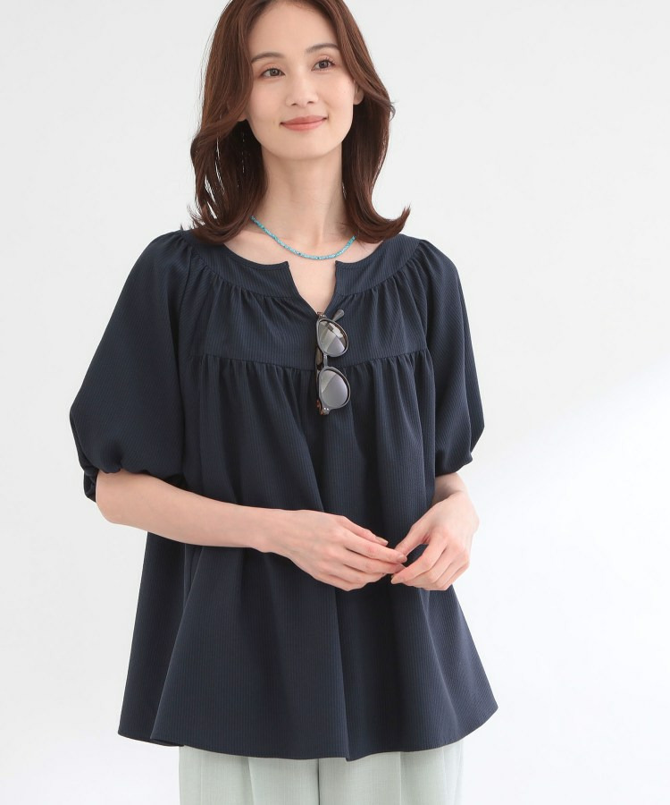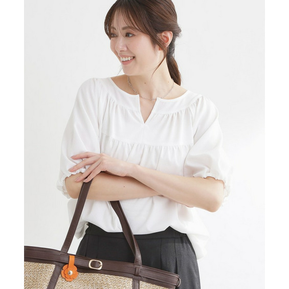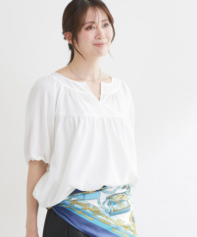 ネックとヨーク部分に細やかなギャザーをたっぷり寄せたボリュームブラウス。