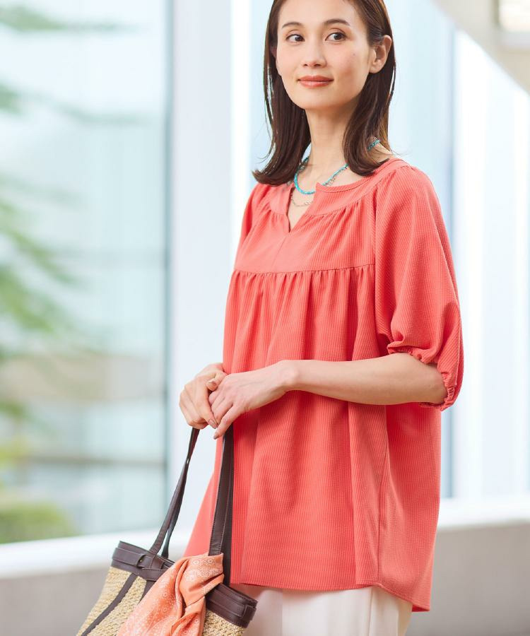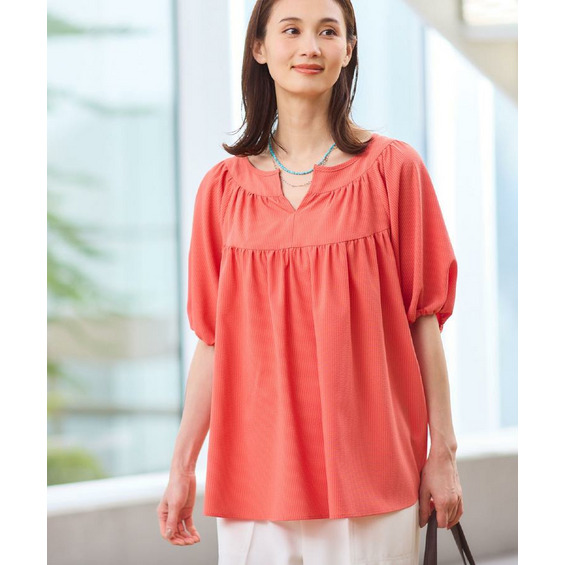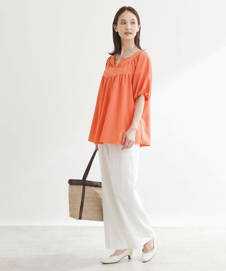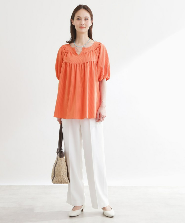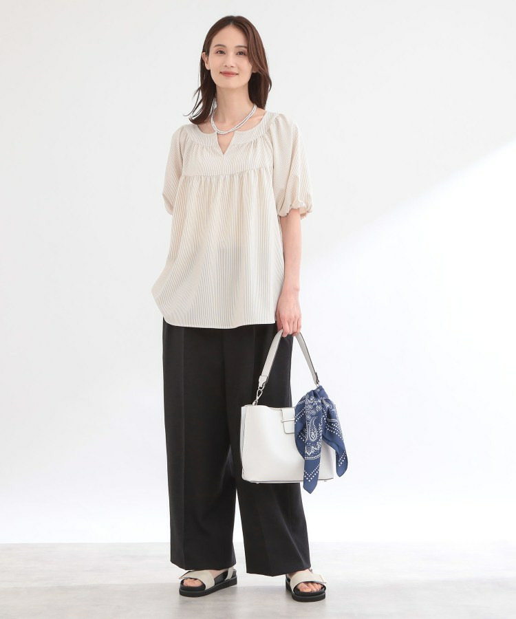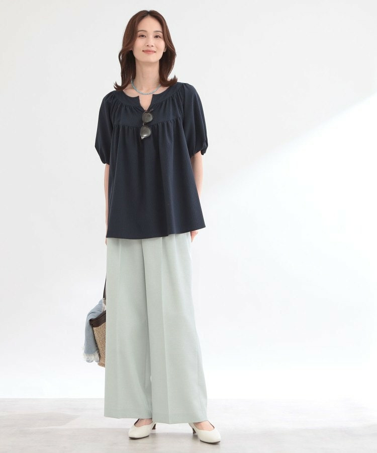 袖口はゴム仕様で楽ちんにお召しいただけ、日常の動きに合わせて表情の変わるリラックス感と女性らしさを兼ね備えたデザインです。
