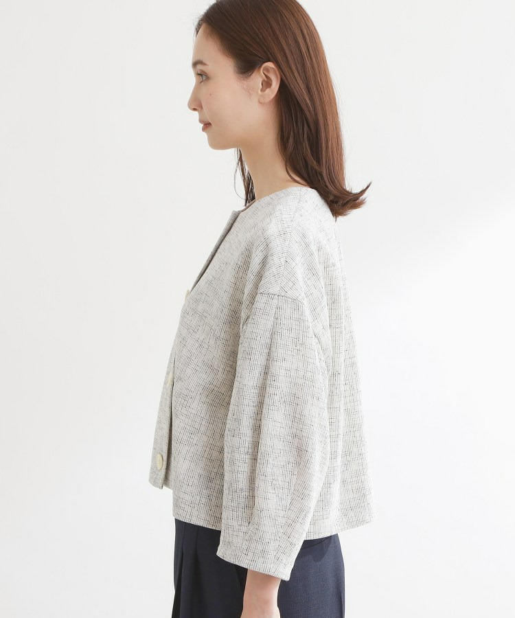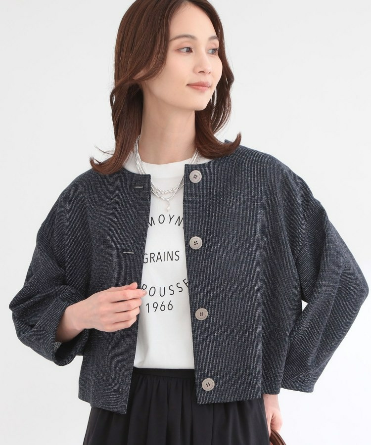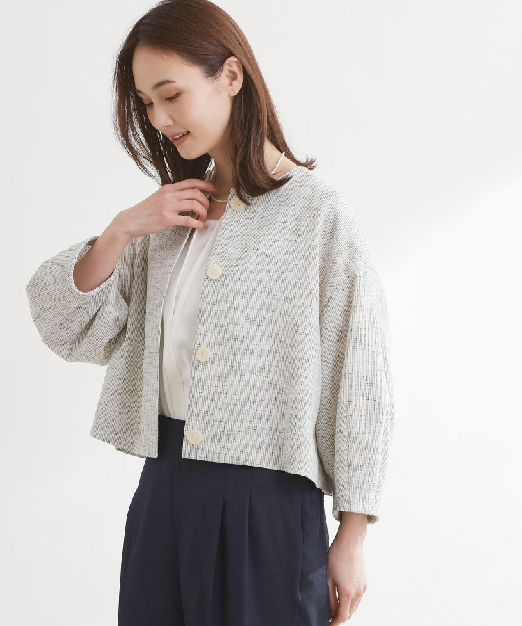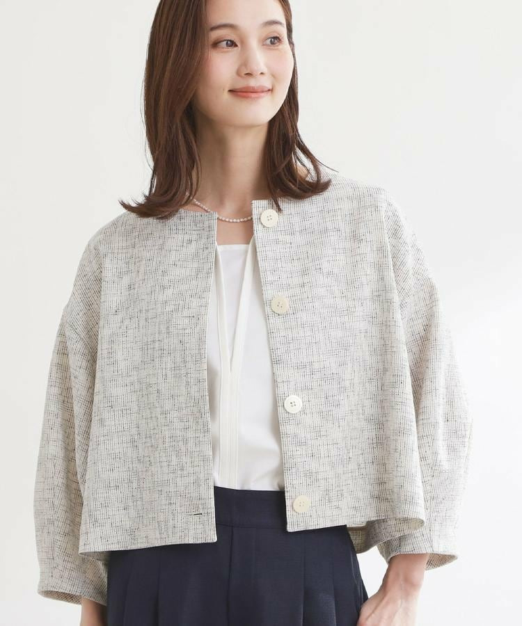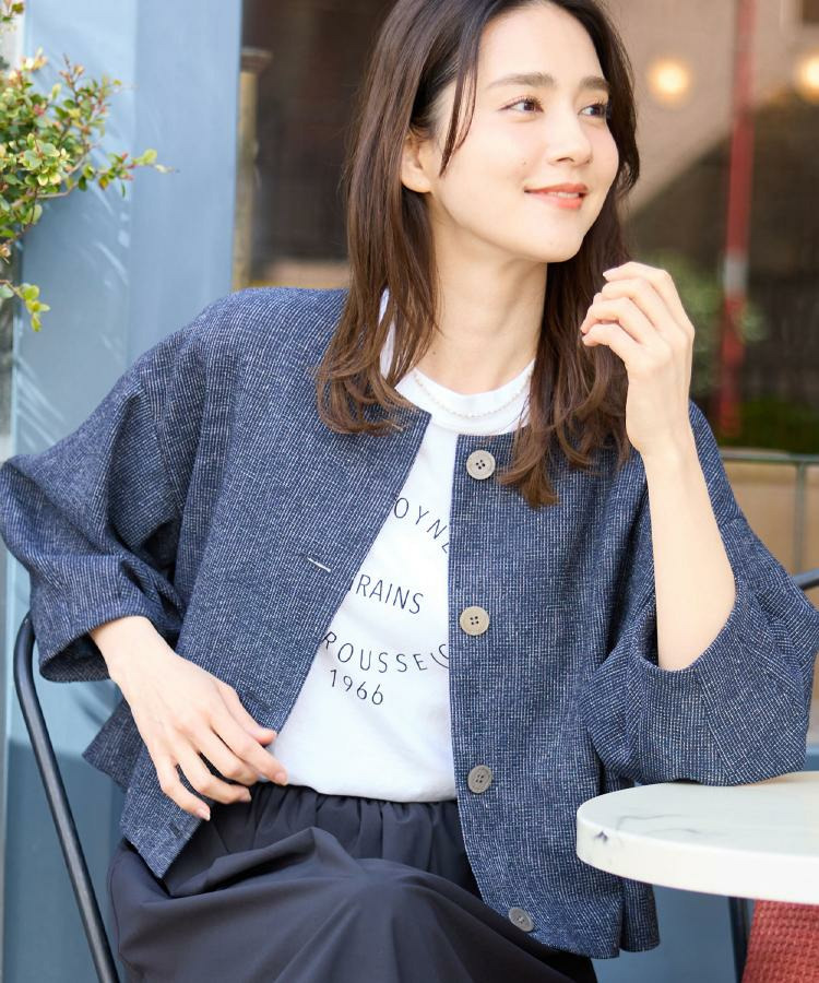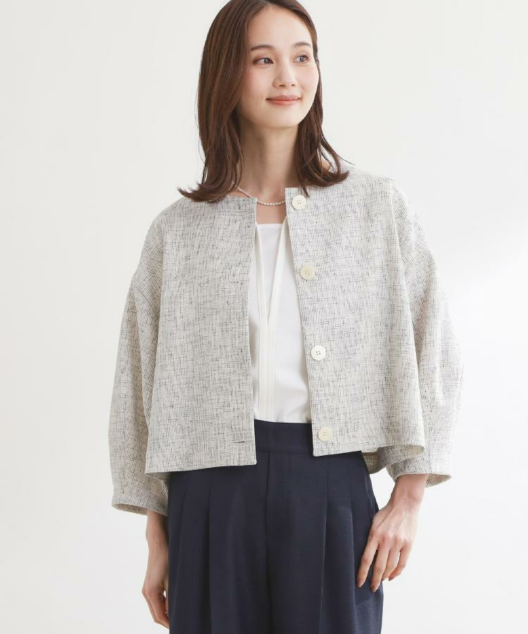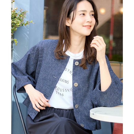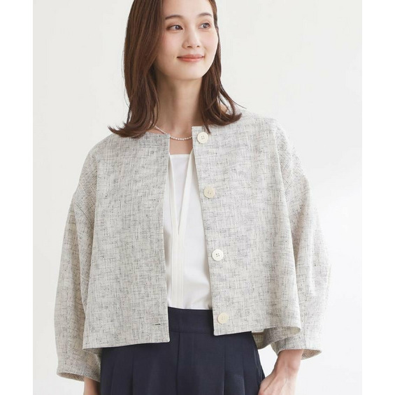 大きめサイズのボタンと短めの着丈が軽やかな印象のコンパクトなノーカラージャケット。