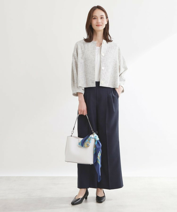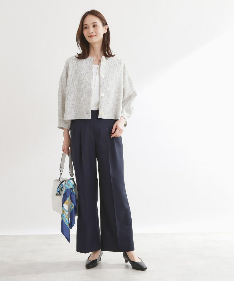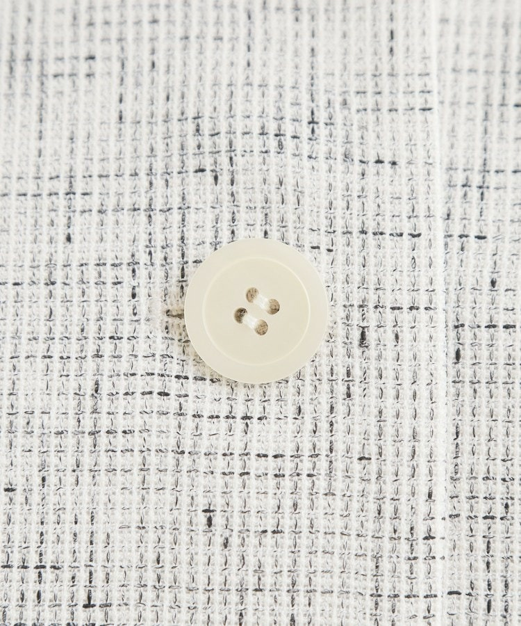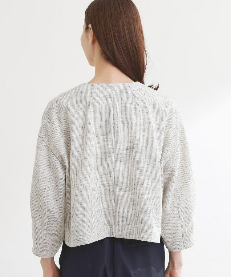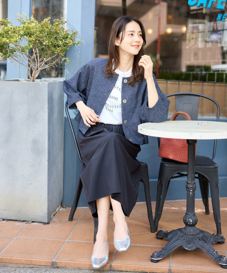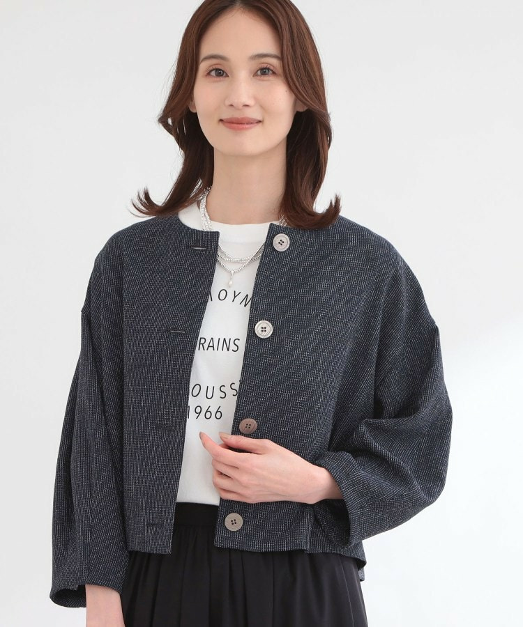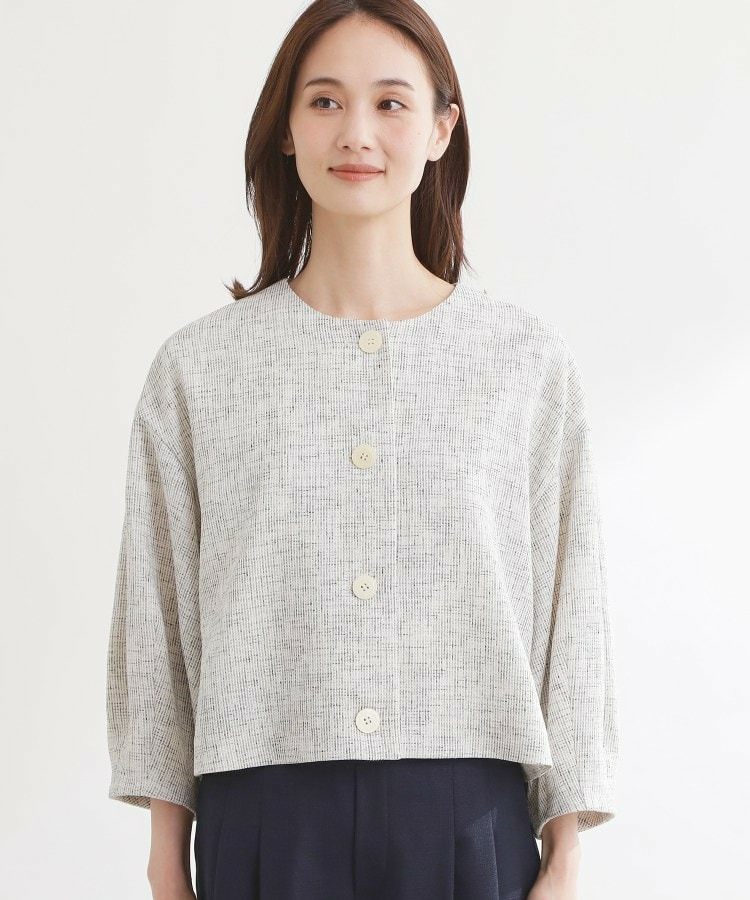 大きめサイズのボタンと短めの着丈が軽やかな印象のコンパクトなノーカラージャケット。