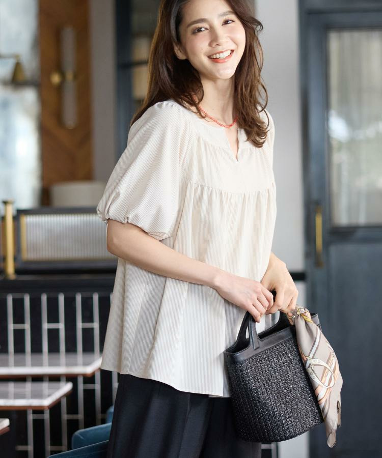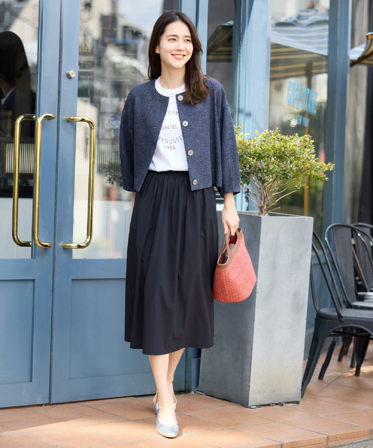 編み目の表情がナチュラルな印象を与え、トップのトリムがコーディネートを引き締めてくれます。