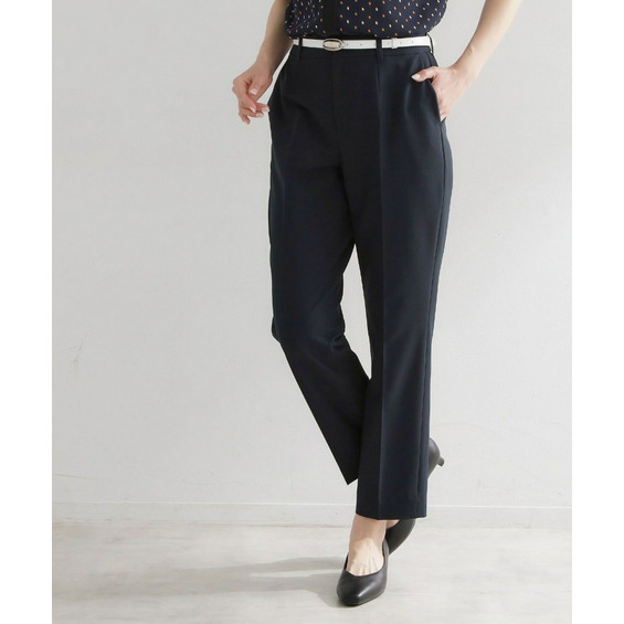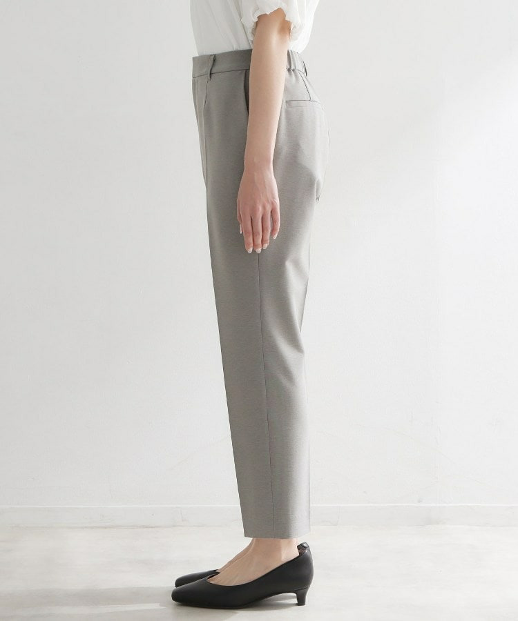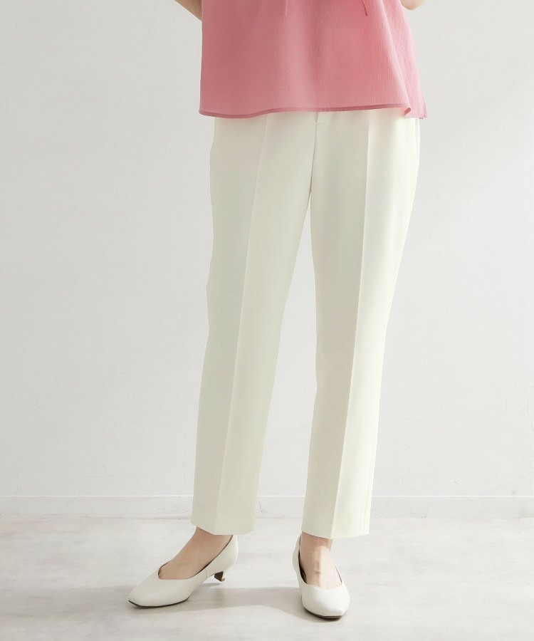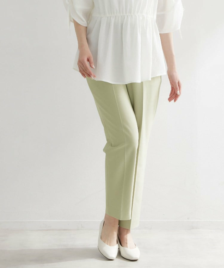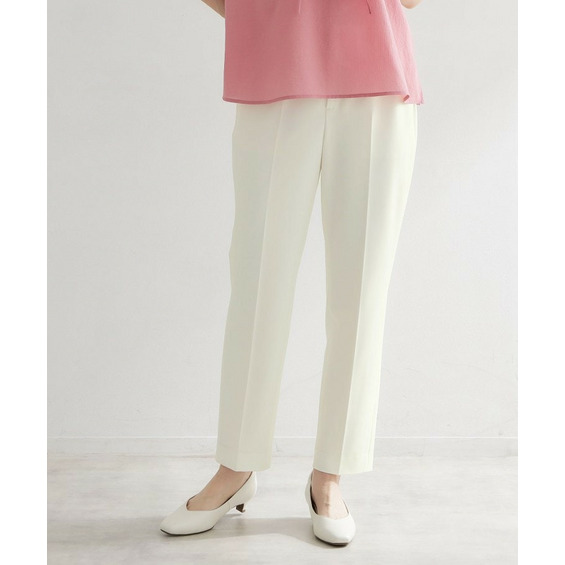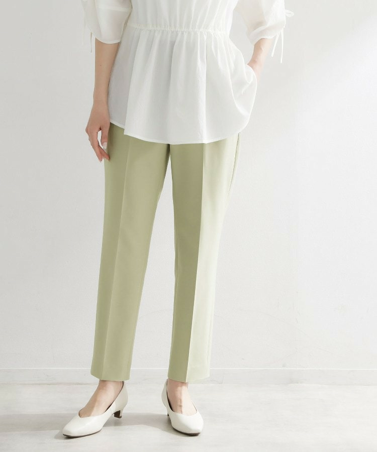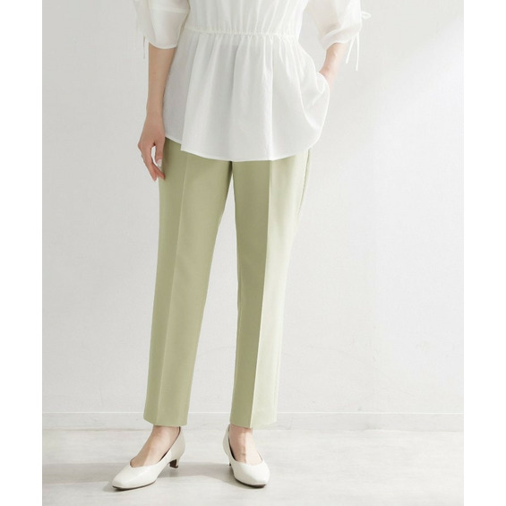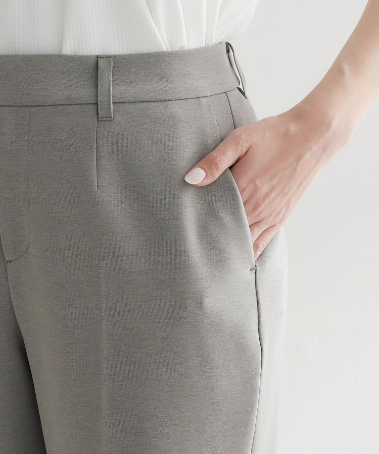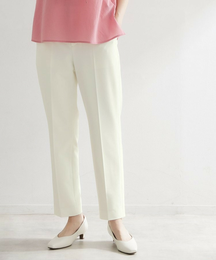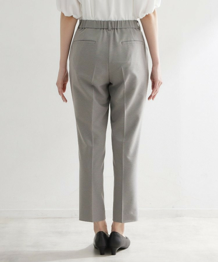 後ろウエストはゴム仕様できちんと感がありながら快適なはき心地で、通勤からデイリーまで幅広く活躍するパンツになっています。