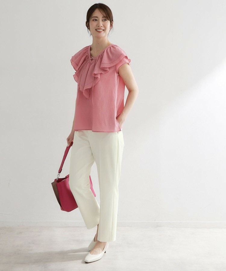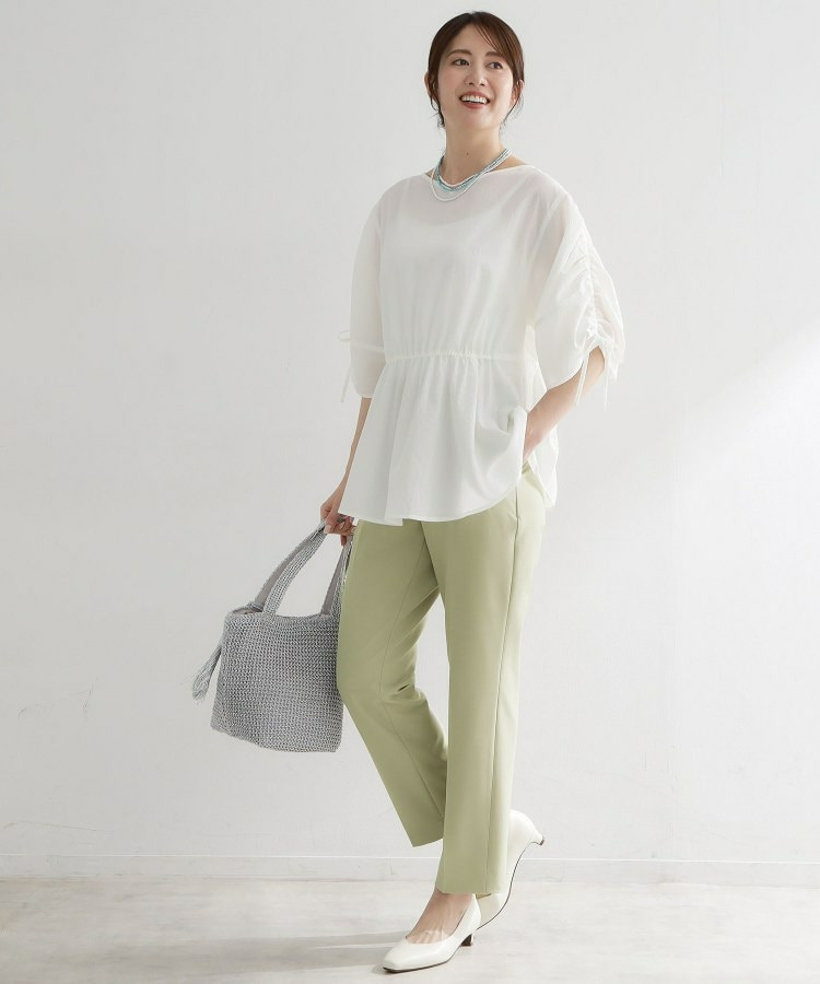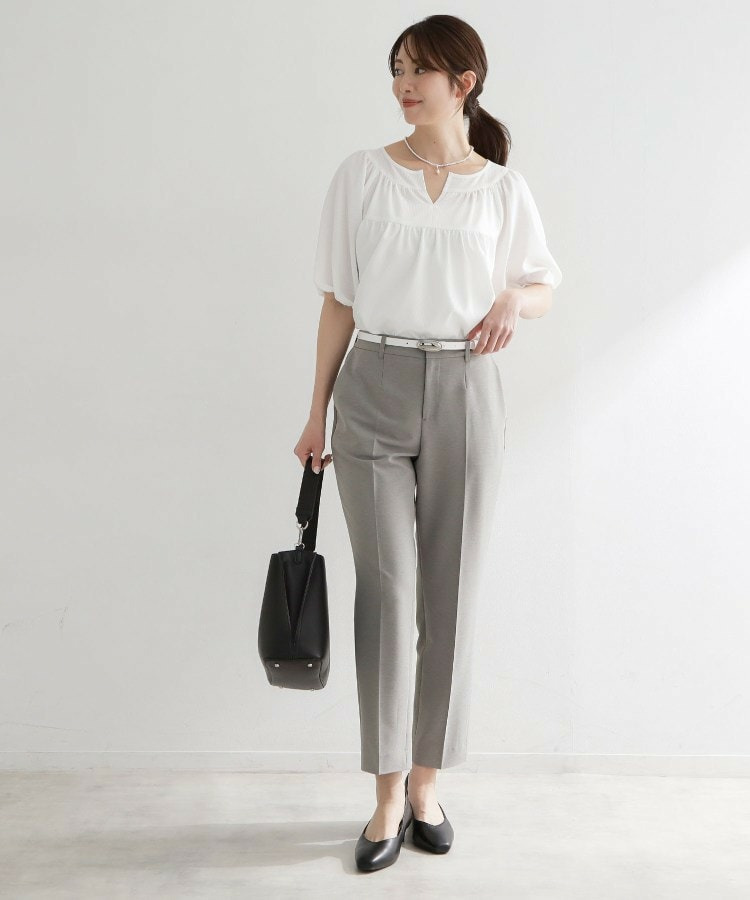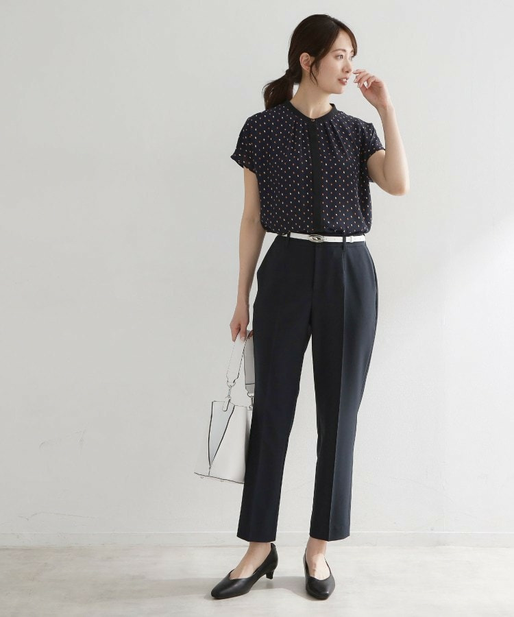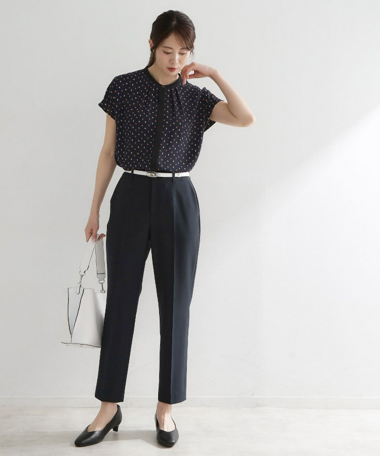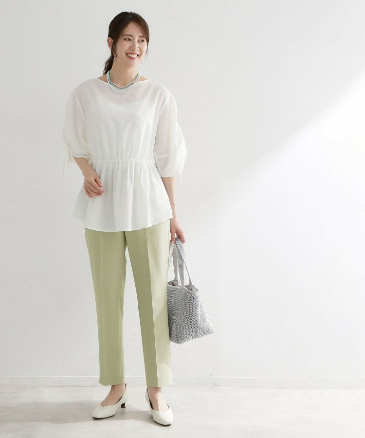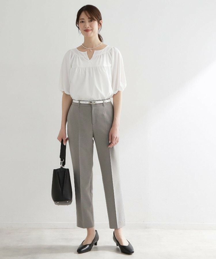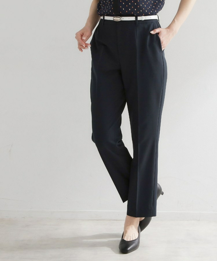 後ろウエストはゴム仕様できちんと感がありながら快適なはき心地で、通勤からデイリーまで幅広く活躍するパンツになっています。