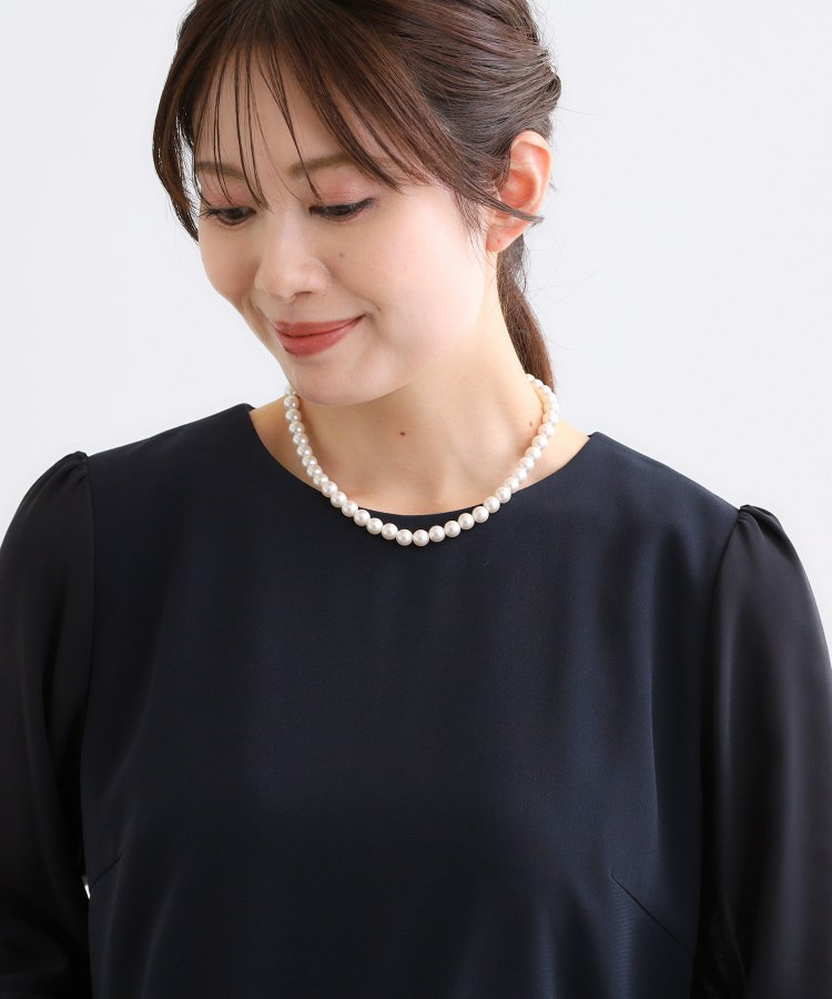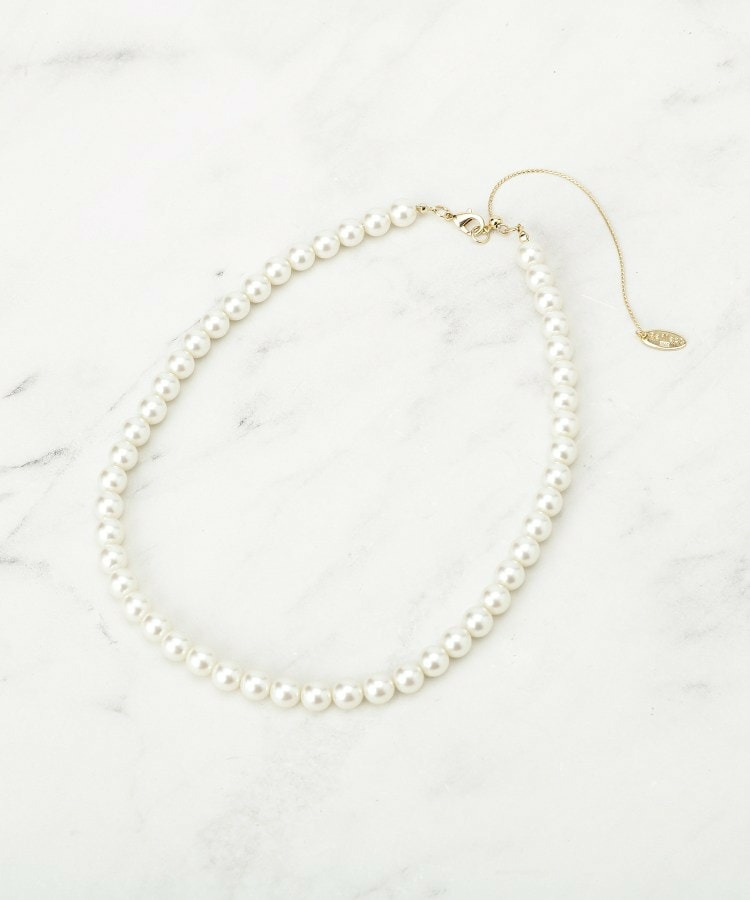 程よい艶感と揃った丸みが美しい人工パールでおつくりしたネックレス。