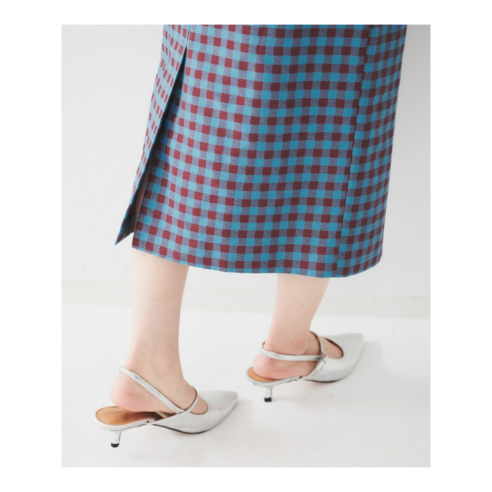 ギンガムチェックのペンシルスカートは、すっきりとした縦長シルエットとミディレングスがレトロモダンな雰囲気。