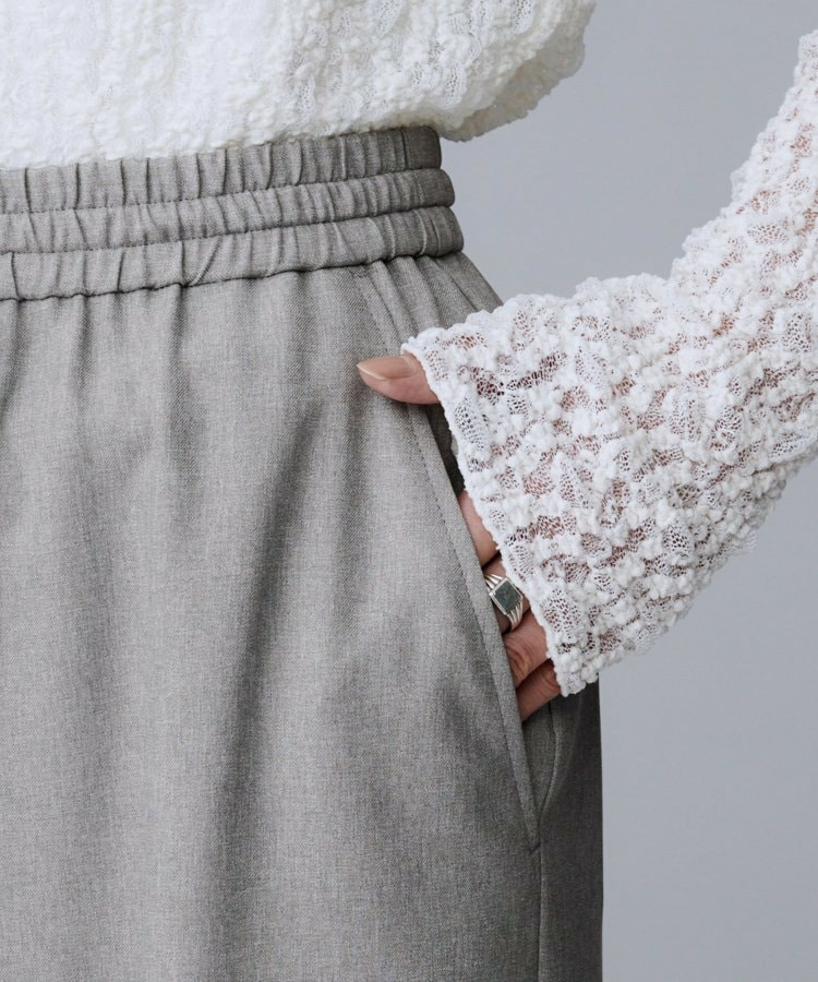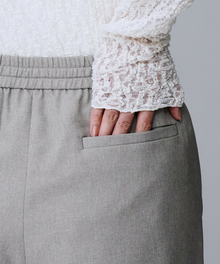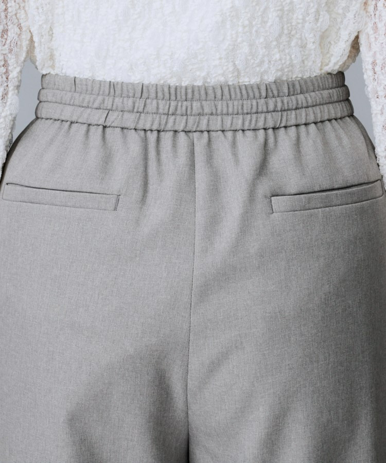 リラックス感がありつつ、綺麗な素材で汎用性の高いウエストドロストパンツ。