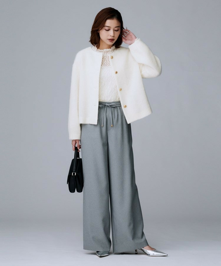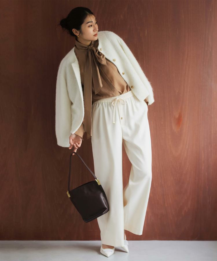 ボトムは153-64402など、カジュアル感がありつつ綺麗な素材のパンツを合わせていただくと、甘すぎず程よいバランスになります。